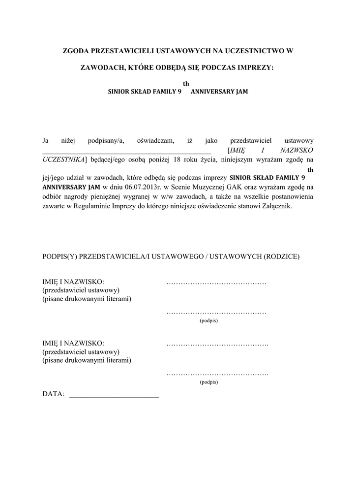 ZGODA PRZESTAWICIELI USTAWOWYCH NA UCZESTNICTWO W ZAWODACH, KTÓRE ODBĘDĄ SIĘ PODCZAS IMPREZY: th SINIOR SKŁAD FAMILY 9 ANNIVERSARY JAM Ja niżej podpisany/a, oświadczam, iż jako przedstawiciel ustawowy _______________________________________________ [IMIĘ I NAZWSKO UCZESTNIKA] będącej/ego osobą poniżej 18 roku życia, niniejszym wyrażam zgodę na th jej/jego udział w zawodach, które odbędą się podczas imprezy SINIOR SKŁAD FAMILY 9 ANNIVERSARY JAM w dniu 06.07.2013r. w Scenie Muzycznej GAK oraz wyrażam zgodę na odbiór nagrody pieniężnej wygranej w w/w zawodach, a także na wszelkie postanowienia zawarte w Regulaminie Imprezy do którego niniejsze oświadczenie stanowi Załącznik. PODPIS(Y) PRZEDSTAWICIELA/I USTAWOWEGO / USTAWOWYCH (RODZICE) IMIĘ I NAZWISKO: (przedstawiciel ustawowy) (pisane drukowanymi literami) …………………………………… …………………………………… (podpis) IMIĘ I NAZWISKO: (przedstawiciel ustawowy) (pisane drukowanymi literami) ……………………………………. ……………………………………. (podpis) DATA: _________________________