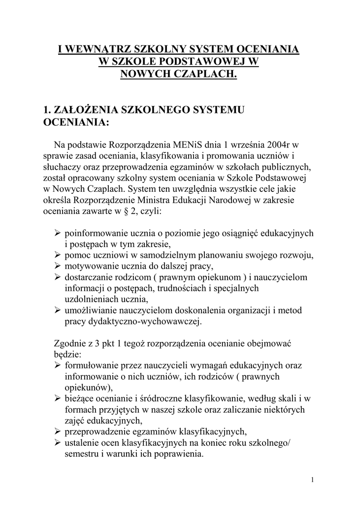 I WEWNĄTRZ SZKOLNY SYSTEM OCENIANIA W SZKOLE PODSTAWOWEJ W NOWYCH CZAPLACH. 1. ZAŁOŻENIA SZKOLNEGO SYSTEMU OCENIANIA: Na podstawie Rozporządzenia MENiS dnia 1 września 2004r w sprawie zasad oceniania, klasyfikowania i promowania uczniów i słuchaczy oraz przeprowadzenia egzaminów w szkołach publicznych, został opracowany szkolny system oceniania w Szkole Podstawowej w Nowych Czaplach. System ten uwzględnia wszystkie cele jakie określa Rozporządzenie Ministra Edukacji Narodowej w zakresie oceniania zawarte w § 2, czyli: poinformowanie ucznia o poziomie jego osiągnięć edukacyjnych i postępach w tym zakresie, pomoc uczniowi w samodzielnym planowaniu swojego rozwoju, motywowanie ucznia do dalszej pracy, dostarczanie rodzicom ( prawnym opiekunom ) i nauczycielom informacji o postępach, trudnościach i specjalnych uzdolnieniach ucznia, umożliwianie nauczycielom doskonalenia organizacji i metod pracy dydaktyczno-wychowawczej. Zgodnie z 3 pkt 1 tegoż rozporządzenia ocenianie obejmować będzie: formułowanie przez nauczycieli wymagań edukacyjnych oraz informowanie o nich uczniów, ich rodziców ( prawnych opiekunów), bieżące ocenianie i śródroczne klasyfikowanie, według skali i w formach przyjętych w naszej szkole oraz zaliczanie niektórych zajęć edukacyjnych, przeprowadzenie egzaminów klasyfikacyjnych, ustalenie ocen klasyfikacyjnych na koniec roku szkolnego/ semestru i warunki ich poprawienia. 1 Wypracowany przez nas system oceniania ma pomóc w kształtowaniu ucznia, który będzie samodzielnie funkcjonował w otaczającym go świecie, którego zasady zna i rozumie, pozytywnie patrzy na otaczającą go rzeczywistość, wierzy w siebie i swoje możliwości. Jest otwarty, życzliwy i uczynny. Cechuje go takt i kultura osobista. Dobrze współpracuje w grupie. Potrafi przedstawić swe poglądy i słuchać zdania innych. Jest tolerancyjny, umie stopniować oceny moralne i dokonywać wyboru w sytuacjach trudnych i niejednoznacznych, ma określone zainteresowania. Poszukuje nowych obszarów dla swej aktywności. Potrafi myśleć twórczo, stawiać sobie cele i umie je realizować. Łatwo pozyskuje, przekształca i prezentuje informacje. Swobodnie korzysta z różnych źródeł wiedzy. Jest przygotowany do samokształcenia. Doświadczenia nabyte w szkole umie właściwie wykorzystać w życiu. Z dystansem podchodzi do uzyskiwanych informacji potrafi je weryfikować w oparciu o alternatywne źródła wiedzy. Umie dostosować się do nowej sytuacji i podjąć niej właściwe działanie. Jest odpowiedzialny. Zdaje sobie sprawę z możliwości następstw różnych działań. Gotów jest ponosić odpowiedzialność za swoje postępowanie, potrafi przyznać się do błędu. 2.OGÓLNE PRAWA, OBOWIĄZKI UCZNIÓW: Uczniowie mają prawo: korzystać z ofert szkoły w zakresie kształcenia i rozwoju osobowości na miarę swoich możliwości, bez ograniczenia korzystać z zajęć organizowanych przez szkołę, uzyskiwać pomoc w zakresie kształcenia na zasadach określonych w Statucie Szkoły, swoje uwagi dotyczące wszystkich aspektów funkcjonowania szkoły przekazywać członkom władz Samorządu Uczniowskiego, wychowawcy klasy / Radzie Rodziców / 2 Uczniowie są zobowiązani : przestrzegać zasad kultury i współżycia społecznego, uczestniczyć na ogólnych zasadach w zajęciach organizowanych przez szkołę, szanować mienie szkoły i wszystkich osób w niej przebywających, dbać o dobre imię szkoły poza jej murami, stosować się do zarządzeń i poleceń dyrekcji szkoły, nauczycieli, wychowawcy klasy i pracowników obsługi.. Szczegółowe rozwiązania w zakresie praw i obowiązków ucznia są w regulaminie Szkoły Podstawowej w Nowych Czaplach. 3.OCENIANIE WYNIKÓW W NAUCE: Rok szkolny w Szkole Podstawowej w Nowych Czaplach podzielony jest na dwa semestry. Semestr І zostaje zamknięty radą klasyfikacyjną bezpośrednio poprzedzającą zakończenie roku szkolnego, nie później niż 7 dni przed jego zakończeniem. Konkretne daty posiedzeń rad klasyfikacyjnych są ustalane na początku każdego roku szkolnego. Oceny bieżące i oceny klasyfikacyjne roczne ustala się według skali określonej w statucie szkoły. Na miesiąc przed posiedzeniem Rady Pedagogicznej wychowawcy informują uczniów i ich rodziców o przewidywanych ocenach z poszczególnych przedmiotów. Informacja taka przekazywana jest w formie ustnej lub pisemnej. Oceny semestralne, począwszy od klasy czwartej szkoły podstawowej, ustala się w stopniach według następującej skali: 1. 2. 3. 4. 5. 6. stopień celujący 6 stopień bardzo dobry - 5 stopień dobry 4 stopień dostateczny - 3 stopień dopuszczający - 2 stopień niedostateczny - 1 3 W klasach І – ІІІ oceną opisową. szkoły podstawowej ocena klasyfikacyjna jest Ustala się następujące kryteria oceny semestralnej i rocznej: stopień celujący (6) oznacza, że osiągnięcia ucznia wyraźnie wykraczają poza poziom ponadpodstawowy osiągnięć edukacyjnych przewidzianych w realizowanym przez nauczyciela programie nauczania, są oryginalne i twórcze oraz wskazują na dużą samodzielność w ich uzyskiwaniu ; stopień bardzo dobry (5) oznacza, że uczeń opanował pełny zakres wiadomości i umiejętności podstawowych i ponadpodstawowych, przewidzianych w realizowanym przez nauczyciela programie nauczania ; stopień dobry (4) oznacza, że opanowanie przez ucznia zakresu wiadomości i umiejętności podstawowych i ponadpodstawowych, przewidzianych w realizowanym przez nauczyciela programie nauczania nie jest pełne, ale nie prognozuje żadnych kłopotów w opanowaniu kolejnych treści kształcenia ; stopień dostateczny (3) oznacza, że uczeń jedynie podstawowe wiadomości i umiejętności przewidziane w realizowanym przez nauczyciela programie nauczania, co może oznaczać kłopoty przy opanowywaniu kolejnych treści kształcenia w ramach danego przedmiotu ; stopień dopuszczający (2) oznacza, że uczeń jedynie opanował wymag