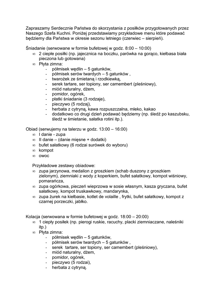 Zapraszamy Serdecznie Państwa do skorzystania z posiłków przygotowanych przez Naszego Szefa Kuchni. PoniŜej przedstawiamy przykładowe menu które podawać będziemy dla Państwa w okresie sezonu letniego (czerwiec – sierpień). Śniadanie (serwowane w formie bufetowej w godz. 8:00 – 10:00) • 2 ciepłe posiłki (np. jajecznica na boczku, parówka na gorąco, kiełbasa biała pieczona lub gotowana) • Płyta zimna: - półmisek wędlin – 5 gatunków, - półmisek serów twardych – 5 gatunków , - twaroŜek ze śmietaną i rzodkiewką, - serek tartare, ser topiony, ser camembert (pleśniowy), - miód naturalny, dŜem, - pomidor, ogórek, - płatki śniadanie (3 rodzaje), - pieczywo (5 rodzaj), - herbata z cytryną, kawa rozpuszczalna, mleko, kakao - dodatkowo co drugi dzień podawać będziemy (np. śledź po kaszubsku, śledź w śmietanie, sałatka rotini itp.). Obiad (serwujemy na talerzu w godz. 13:00 – 16:00) • I danie - zupa • II danie – (danie mięsne + dodatki) • bufet sałatkowy (6 rodzai surówek do wyboru) • kompot • owoc Przykładowe zestawy obiadowe: • zupa jarzynowa, medalion z groszkiem (schab duszony z groszkiem zielonym), ziemniaki z wody z koperkiem, bufet sałatkowy, kompot wiśniowy, pomarańcza, • zupa ogórkowa, pieczeń wieprzowa w sosie własnym, kasza gryczana, bufet sałatkowy, kompot truskawkowy, mandarynka, • zupa Ŝurek na kiełbasie, kotlet de volaille , frytki, bufet sałatkowy, kompot z czarnej porzeczki, jabłko. Kolacja (serwowana w formie bufetowej w godz. 18:00 – 20:00) • 1 ciepły posiłek (np. pierogi ruskie, racuchy, placki ziemniaczane, naleśniki itp.) • Płyta zimna: - półmisek wędlin – 5 gatunków, - półmisek serów twardych – 5 gatunków , - serek tartare, ser topiony, ser camembert (pleśniowy), - miód naturalny, dŜem, - pomidor, ogórek, - pieczywo (5 rodzai), - herbata z cytryną.
