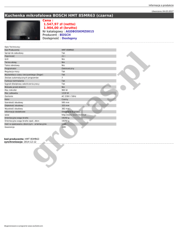Informacje o produkcie Utworzono 04-03-2017 Kuchenka mikrofalowa BOSCH HMT 85MR63 (czarna) Cena : 1.547,97 zł (netto) 1.904,00 zł (brutto) Nr katalogowy : AGDBOSKMZ0015 Producent : BOSCH Dostępność : Dostępny HMT 85MR63 Sprzęt do zabudowy Tak Pojemność 21 l Grill Nie Termo-obieg Nie Talerz obrotowy Nie Programator Elektroniczny Regulacja mocy Tak Wyświetlacz czasu rzeczywistego (Zegar) Tak Zestaw automatycznych programów 7 Funkcja rozmrażania Tak Sygnał dźwiękowy zakończenia pracy Tak Blokada przed dziećmi Nie Moc mikrofal 900 W Moc całkowita 1220 W Zasilanie AC 230V / 50Hz Kolor Czarny Szerokość obudowy 595 mm Głębokość obudowy 320 mm Wysokość obudowy 382 mm Informacje dodatkowe Otwierana w prawo www http://www.bosch-home.pl ok Orientacyjna waga brutto as Kod Producenta .p l Opis Techniczny: 19250 g Orientacyjna waga brutto opak. zbior. 19250 g Ilość w opakowaniu zbiorczym - orientacyjnie 1 szt. Gwarancja 24M gr kod producenta: HMT 85MR63 synchronizacja: 2014-12-12 Wygenerowano w programie www.oscGold.com