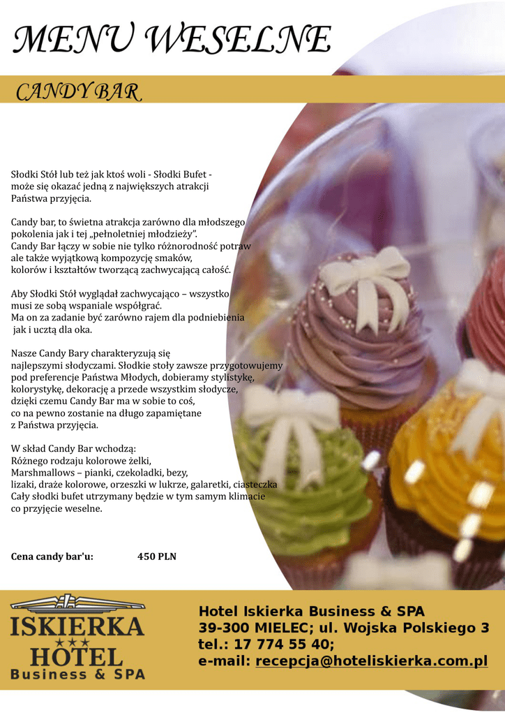 Słodki Stół lub też jak ktoś woli - Słodki Bufet może się okazać jedną z największych atrakcji Państwa przyjęcia. Candy bar, to świetna atrakcja zarówno dla młodszego pokolenia jak i tej „pełnoletniej młodzieży”. Candy Bar łączy w sobie nie tylko różnorodność potraw ale także wyjątkową kompozycję smaków, kolorów i kształtów tworzącą zachwycającą całość. Aby Słodki Stół wyglądał zachwycająco – wszystko musi ze sobą wspaniale współgrać. Ma on za zadanie być zarówno rajem dla podniebienia jak i ucztą dla oka. Nasze Candy Bary charakteryzują się najlepszymi słodyczami. Słodkie stoły zawsze przygotowujemy pod preferencje Państwa Młodych, dobieramy stylistykę, kolorystykę, dekorację a przede wszystkim słodycze, dzięki czemu Candy Bar ma w sobie to coś, co na pewno zostanie na długo zapamiętane z Państwa przyjęcia. W skład Candy Bar wchodzą: Różnego rodzaju kolorowe żelki, Marshmallows – pianki, czekoladki, bezy, lizaki, draże kolorowe, orzeszki w lukrze, galaretki, ciasteczka Cały słodki bufet utrzymany będzie w tym samym klimacie co przyjęcie weselne. Cena candy bar'u: 450 PLN