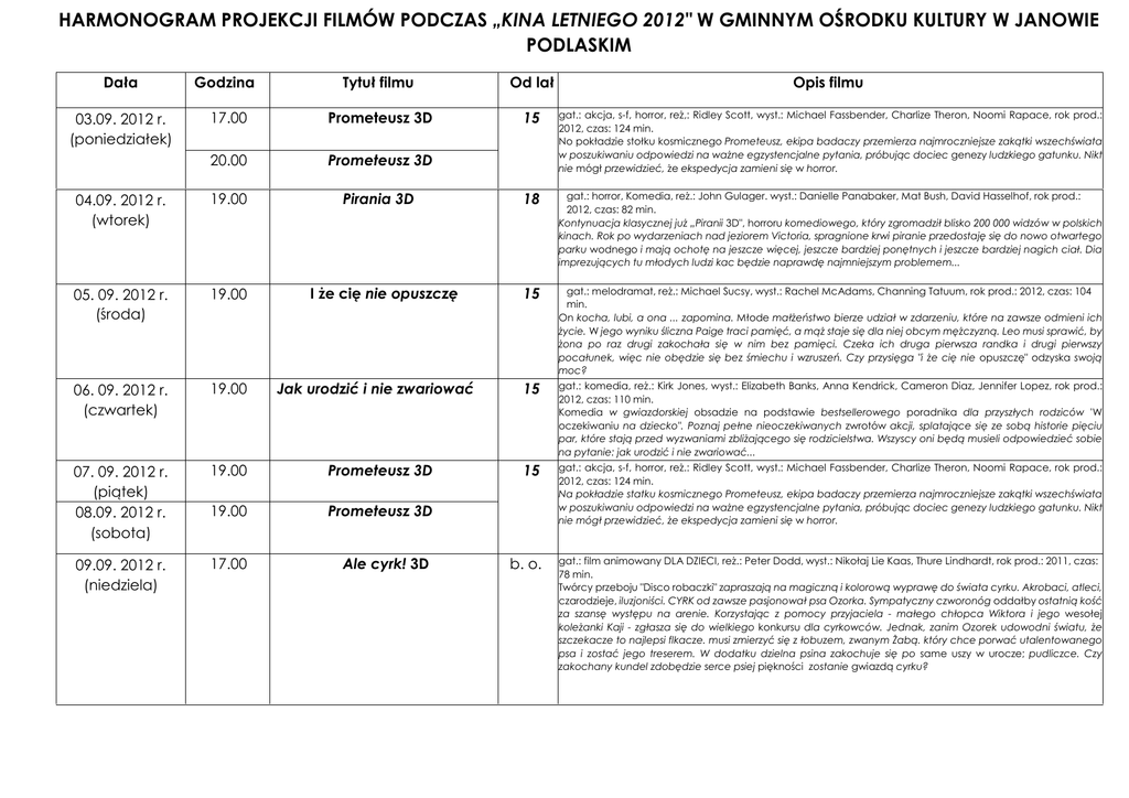 HARMONOGRAM PROJEKCJI FILMÓW PODCZAS „KINA LETNIEGO 2012" W GMINNYM OŚRODKU KULTURY W JANOWIE PODLASKIM Dała Godzina Tytuł filmu Od lał Opis filmu 03.09. 2012 r. (poniedziałek) 17.00 Prometeusz 3D 15 20.00 Prometeusz 3D gat.: akcja, s-f, horror, reż,: Ridley Scott, wyst.: Michael Fassbender, Charlize Theron, Noomi Rapace, rok prod.: 2012, czas: 124 min. No pokładzie stołku kosmicznego Prometeusz, ekipa badaczy przemierza najmroczniejsze zakątki wszechświata w poszukiwaniu odpowiedzi na ważne egzystencjalne pytania, próbując dociec genezy ludzkiego gatunku. Nikt nie mógł przewidzieć, że ekspedycja zamieni się w horror. 04.09. 2012 r. (wtorek) 19.00 Pirania 3D 18 gat.: horror, Komedia, reż.: John Gulager. wyst.: Danielle Panabaker, Mat Bush, David Hasselhof, rok prod.: 2012, czas: 82 min. Kontynuacja klasycznej już „Piranii 3D", horroru komediowego, który zgromadził blisko 200 000 widzów w polskich kinach. Rok po wydarzeniach nad jeziorem Victoria, spragnione krwi piranie przedostaję się do nowo otwartego parku wodnego i mają ochotę na jeszcze więcej, jeszcze bardziej ponętnych i jeszcze bardziej nagich ciał. Dia imprezujących tu młodych ludzi kac będzie naprawdę najmniejszym problemem... 05. 09. 2012 r. (środa) 19.00 15 gat.: melodramat, reż.: Michael Sucsy, wyst.: Rachel McAdams, Channing Tatuum, rok prod.: 2012, czas: 104 min. On kocha, lubi, a ona ... zapomina. Młode małżeństwo bierze udział w zdarzeniu, które na zawsze odmieni ich życie. W jego wyniku śliczna Paige traci pamięć, a mąż staje się dla niej obcym mężczyzną. Leo musi sprawić, by żona po raz drugi zakochała się w nim bez pamięci. Czeka ich druga pierwsza randka i drugi pierwszy pocałunek, więc nie obędzie się bez śmiechu i wzruszeń. Czy przysięga "i że cię nie opuszczę" odzyska swoją moc? 06. 09. 2012 r. (czwartek) 19.00 15 gat.: komedia, reż.: Kirk Jones, wyst.: Elizabeth Banks, Anna Kendrick, Cameron Diaz, Jennifer Lopez, rok prod.: 2012, czas: 110 min. Komedia w gwiazdorskiej obsadzie na podstawie bestsellerowego poradnika dla przyszłych rodziców 'W oczekiwaniu na dziecko". Poznaj pełne nieoczekiwanych zwrotów akcji, splatające się ze sobą historie pięciu par, które stają przed wyzwaniami zbliżającego się rodzicielstwa. Wszyscy oni będą musieli odpowiedzieć sobie na pytanie: jak urodzić i nie zwariować... 07. 09. 2012 r. (piątek) 08.09. 2012 r. (sobota) 19.00 Prometeusz 3D 15 19.00 Prometeusz 3D gat.: akcja, s-f, horror, reż.: Ridley Scott, wyst.: Michael Fassbender, Charlize Theron, Noomi Rapace, rok prod.: 2012, czas: 124 min. Na pokładzie statku kosmicznego Prometeusz, ekipa badaczy przemierza najmroczniejsze zakqtki wszechświata w poszukiwaniu odpowiedzi na ważne egzystencjalne pytania, próbujqc dociec genezy ludzkiego gatunku. Nikt nie mógł przewidzieć, że ekspedycja zamieni się w horror. 09.09. 2012 r. (niedziela) 17.00 Ale cyrk! 3D b. o. gat.: film animowany DLA DZIECI, reż.: Peter Dodd, wyst.: Nikołaj Lie Kaas, Thure Lindhardt, rok prod.: 2011, czas: 78 min. Twórcy przeboju "Disco robaczki" zapraszajq na magicznq i kolorową wyprawę do świata cyrku. Akrobaci, atleci, czarodzieje, iluzjoniści. CYRK od zawsze pasjonował psa Ozorka. Sympatyczny czworonóg oddałby ostatnią kość za szansę występu na arenie. Korzystając z pomocy przyjaciela - małego chłopca Wiktora i jego wesołej koleżanki Kaji - zgłasza się do wielkiego konkursu dla cyrkowców. Jednak, zanim Ozorek udowodni światu, że szczekacze to najlepsi flkacze. musi zmierzyć się z łobuzem, zwanym Żabą. który chce porwać utalentowanego psa i zostać jego treserem. W dodatku dzielna psina zakochuje się po same uszy w urocze; pudliczce. Czy zakochany kundel zdobędzie serce psiej piękności zostanie gwiazdą cyrku? I że cię nie opuszczę Jak urodzić i nie zwariować