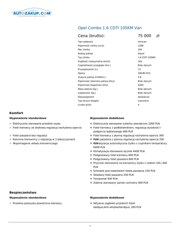 Opel Combo 1.6 CDTI 105KM Van Cena (brutto): 75 000 Typ nadwozia minivan Pojemność silnika (ccm) 1598 Moc silnika 105 Rodzaj paliwa diesel Typ silnika 1.6 CDTI 105KM Prędkość maksymalna (km/h) 164 Częstotliwość przeglądu (km.) Brak danych Przyspieszenie (s.) 13 Opony 185/65 R15 Zużycie paliwa (l/100km.) 5.8 Pojemność zbiornika paliwa (litry) Brak danych Pojemność bagażnika (litry) 4200 Masa własna (kg.) Brak danych Ładowność (kg.) Brak danych Klasa/segment dostawcze Typ skrzyni biegów manualna Liczba drzwi 4 zł Komfort Wyposażenie standardowe Wyposażenie dodatkowe ✓ Elektrycznie sterowane przednie szyby ✕ Elektrycznie sterowane lusterka zewnętrzne 1000 PLN ✓ Fotel kierowcy ze skokową regulacją nachylenia oparcia ✕ Fotel kierowcy z podłokietnikiem, regulacją wysokości i ✓ Fotel pasażera bez regulacji ✕ Fotel kierowcy z płynną regulacją nachylenia oparcia 300 ✓ Kolumna kierownicy z regulacją w 2 płaszczyznach ✕ Fotel PLN pasażera z płynną regulacją nachylenia oparcia 250 ✓ Wspomaganie układu kierowniczego ✕ Klimatyzacja PLN automatyczna (tylko z czujnikiem temperatury podparcia lędźwiowego 400 PLN 6400 PLN ✕ Klimatyzacja sterowana ręcznie 4400 PLN ✕ Podgrzewany fotel kierowcy 600 PLN ✕ Podgrzewany fotel pasażera 600 PLN ✕ Przyciski sterowania na kierownicy (tylko z radiem U3L) 400 PLN ✕ Schowek pod siedziskiem fotela pasażera 150 PLN ✕ Składany fotel pasażera 250 PLN ✕ Tempomat 500 PLN ✕ Zdalnie sterowany zamek centralny 400 PLN Bezpieczeństwo Wyposażenie standardowe Wyposażenie dodatkowe ✓ Przednia poduszka powietrzna kierowcy ✕ Aktywne zagłówki przednich foteli „Anti-whiplash” 200 PLN 1 ✕ Boczne poduszki powietrzne kierowcy i pasażera (tylko z fotelem kierowcy DCW/DCY) Zawiera: przednia poduszka pasażera 1000 PLN ✕ Opony zimowe 1000 PLN ✕ Przednia poduszka powietrzna pasażera 800 PLN ✕ System stabilizacji toru jazdy ESP Zawiera: układ wspomagania ruszania na pochyłościach 2500 PLN Dodatki Wyposażenie standardowe Wyposażenie dodatkowe ✓ Brak przeszklenia części bagażowej ✕ Blokada zamków „deadlock” (tylko z ✓ Felgi stalowe 15x6”, z oponami 185/65 R15 92T ✕ Czujnik parkowania z tyłu 800 PLN centralnym zamkiem CLA) 200 PLN (standard dla wersji 1.3 CDTI i 1.6 CDTI) ✓ Felgi stalowe 16x6”, z oponami 195/60 R16 99T ✕ Czujnik temperatury zewnętrznej (tylko z elektrycznie (standard dla wersji 1.4, 1.4 Turbo CNG i 2.0 CDTI) ✓ Instalacja do montażu radia sterowanymi lusterkami DL8) 200 PLN ✕ Dodatkowy kluczyk z pilotem (tylko z centralnym zamkiem CLA, niedostępny z kluczykiem KTN) 200 PLN ✓ Kołpaki piast kół ✕ Felgi aluminiowe 16x6”, z oponami 195/60 R16 99T 1800 PLN ✓ Lewy panel boczny bez okna ✕ Flex Cargo – rozkładana przegroda z kraty nad fotelem pasażera 500 PLN ✓ Lusterka zewnętrzne w kolorze czarnym ✕ Gniazdko 12V w przestrzeni bagażowej na słupku D (niedostępne z silnikiem 1.4 Turbo CNG) 200 PLN ✓ Pełna przegroda kabiny odddzielająca przedział pasażerski ✕ Instalacja do alarmu (tylko z centralnym zamkiem CLA) 300 od bagażowego ✓ Pełnowymiarowe koło zapasowe PLN ✕ Koło kierownicy pokryte skórą (z dźwignią zmiany biegów dla wersji z manualną skrzynią, tylko z przyciskami sterowania KKC) 700 PLN ✓ Podwyższona ładowność dla wersji L2, standardowy dach ✕ Lakier metaliczny 1700 PLN (H1) ✓ Prawe drzwi przesuwane bez okna (standard w wersji L2) ✕ Lewe drzwi przesuwane bez okna 1400 PLN ✓ Prawy panel boczny bez okna (niedostępny w wersji L2) ✕ Lewe drzwi przesuwane ze stałym oknem 2000 PLN ✓ Tapicerka Cube Black, materiałowa czarna, czarne panele ✕ Lusterka zewnętrzne w kolorze nadwozia 200 PLN drzwi ✓ Tylne drzwi skrzydłowe, asymetryczne, nieprzeszklone ✕ Materiał wyciszający na pełnej przegrodzie kabiny 200 PLN ✓ Układ ABS ✕ Pełna przegroda kabiny z oknem (tylko z tylną klapą J1U/J1X) 400 PLN ✕ Pełnowymiarowe kołpaki kół 200 PLN ✕ Podwyższona ładowność dla wersji L1, standardowy dach (H1) (wyposażenie standardowe z 1.4 Turbo CNG) 1000 PLN ✕ Podłoga przestrzeni bagażowej pokryta tworzywem PVC 200 PLN ✕ Popielniczka i zapalniczka (pakiet dla palących) 200 PLN ✕ Prawe drzwi przesuwane bez okna (standard w wersji L2) 1400 PLN ✕ Prawe drzwi przesuwane ze stałym oknem 2000 PLN ✕ 2 Przeszklenie lewego panelu bocznego, szyba stała 250 PLN 3 ✕ Przeszklenie prawego panelu bocznego, szyba stała 250 PLN ✕ Radioodbiornik RDS z odtwarzaczem CD, 4 głośniki 4x20W (niedostępny z przyciskami sterowania KKC i zestawem Bluetooth) 900 PLN ✕ Radioodbiornik RDS z odtwarzaczem CD/MP3, 4 głośniki 4x20W 1500 PLN ✕ Relingi dachowe (niedostępne z wysokim dachem) 600 PLN ✕ Spryskiwacze przednich reflektorów (tylko ze zderzakami w kolorze nadwozia VT4) 500 PLN ✕ Światła przeciwmgielne przednie 600 PLN ✕ System Start/Stop (niedostępny z silnikiem 1.4 Turbo CNG) 1500 PLN ✕ Tapicerka Vinyl Black, winylowa czarna, czarne panele drzwi 400 PLN ✕ Trzeci kluczyk mechaniczny (tylko z centralnym zamkiem CLA) 100 PLN ✕ Tylne drzwi skrzydłowe, asymetryczne, przeszklone z ogrzewaniem tylnej szyby (w wersji Van tylko z przegrodami AX9/AYU,standard dla wersji z podwyższonym dachem H2) ✕ Tylny 600 PLN otwierany luk bagażowy w dachu 2200 PLN ✕ Uchwyt na dokumenty na desce rozdzielczej 150 PLN ✕ Wewnętrzne belki pod dachem w przestrzeni bagażowej – uchwyt na drabinę 900 PLN ✕ Wyjmowana lampka z funkcją latarki w przestrzeni bagażowej, ładowana 200 PLN ✕ Wysoki dach (H2) (niedostępny z silnikami 1.3 CDTI i 1.4 Turbo CNG, dostępny tylko w wersji L1) 5000 PLN ✕ Wysoki dach (H2) i podwyższona ładowność (niedostępny z silnikiem 1.3 CDTI, dostępny tylko w wersji L1) 6000 PLN ✕ Zderzaki w kolorze nadwozia 600 PLN ✕ Zestaw Bluetooth Viva-Voice ze złączami USB i AUX-in (tylko z przyciskami sterowania KKC, radiem U3L i fotelem kiero