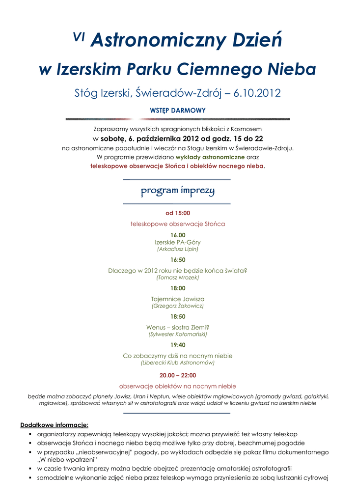 VI Astronomiczny Dzień w Izerskim Parku Ciemnego Nieba Stóg Izerski, Świeradów-Zdrój – 6.10.2012 WSTĘP DARMOWY Zapraszamy wszystkich spragnionych bliskości z Kosmosem w sobotę, 6. października 2012 od godz. 15 do 22 na astronomiczne popołudnie i wieczór na Stogu Izerskim w Świeradowie-Zdroju. W programie przewidziano wykłady astronomiczne oraz teleskopowe obserwacje Słońca i obiektów nocnego nieba. program imprezy od 15:00 teleskopowe obserwacje Słońca 16.00 Izerskie PA-Góry (Arkadiusz Lipin) 16:50 Dlaczego w 2012 roku nie będzie końca świata? (Tomasz Mrozek) 18:00 Tajemnice Jowisza (Grzegorz Żakowicz) 18:50 Wenus – siostra Ziemi? (Sylwester Kołomański) 19:40 Co zobaczymy dziś na nocnym niebie (Liberecki Klub Astronomów) 20.00 – 22:00 obserwacje obiektów na nocnym niebie będzie można zobaczyć planety Jowisz, Uran i Neptun, wiele obiektów mgławicowych (gromady gwiazd, galaktyki, mgławice), spróbować własnych sił w astrofotografii oraz wziąć udział w liczeniu gwiazd na izerskim niebie Dodatkowe informacje: organizatorzy zapewniają teleskopy wysokiej jakości; można przywieźć też własny teleskop obserwacje Słońca i nocnego nieba będą możliwe tylko przy dobrej, bezchmurnej pogodzie w przypadku „nieobserwacyjnej” pogody, po wykładach odbędzie się pokaz filmu dokumentarnego „W niebo wpatrzeni” w czasie trwania imprezy można będzie obejrzeć prezentację amatorskiej astrofotografii samodzielne wykonanie zdjęć nieba przez teleskop wymaga przyniesienia ze sobą lustrzanki cyfrowej Gdzie odbędzie się impreza? Impreza odbędzie się w Świeradowie-Zdroju na górze Stóg Izerski, przy górnej stacji kolei gondolowej (1070 m npm, współrzędne: 50°53'30" N, 15°18'35" E). Jak dotrzeć na miejsce imprezy? Ze Świeradowa do górnej stacji kolei gondolowej dostaniemy się pieszo lub na rowerze (odległość około 4,5 km). Możemy też wjechać koleją gondolową. Kolej będzie czynna przez cały czas trwania imprezy. Gdzie zanocować? Nocować możemy w schronisku „Na Stogu Izerskim” lub w samym Świeradowie (duży wybór hoteli, pensjonatów i kwater prywatnych; zobacz np. w Izerskiej Bazie Turystycznej www.izerska.pl). O Izerskim Parku Ciemnego Nieba Impreza organizowana jest w Izerskim Parku Ciemnego Nieba. Park ten powstał 4 listopada 2009 roku, jako pierwszy park ciemnego nieba w Europie i pierwszy transgraniczny obszar tego typu na świecie. Astronomowie i leśnicy stworzyli park ciemnego nieba w Górach Izerskich, aby przybliżyć ludziom problem zanieczyszczenia światłem i racjonalne sposoby jego minimalizowania oraz zachęcać ich do dbałości o ... ciemność nocną, która jest ważnym składnikiem przyrody. Ale nie tylko dlatego. Chcemy każdemu, kto odwiedzi Góry Izerskie przybliżyć piękno i bogactwo kosmosu. Spoglądając nocą w izerskie niebo zobaczysz Drogę Mleczną, mgławice, galaktyki, gromady gwiazd, czasem kometę... Izerski Park Ciemnego Nieba jest częścią projektu Astro Izery. www.izera-darksky.eu, www.astro.uni.wroc.pl/astroizery Organizatorzy imprezy Instytut Astronomiczny Uniwersytetu Wrocławskiego Klub astronomů Liberecka Instytut Astronomiczny Akademii Nauk Republiki Czeskiej Sobiesław Zasada Sp. z o.o. oddział SKI&SUN Świeradów Zdrój (kolej gondolowa) Leśny Kompleks Promocyjny „Sudety Zachodnie” Patronat medialny Magazyn turystyczno-krajoznawczy „Góry Izerskie” www.goryizerskie.pl