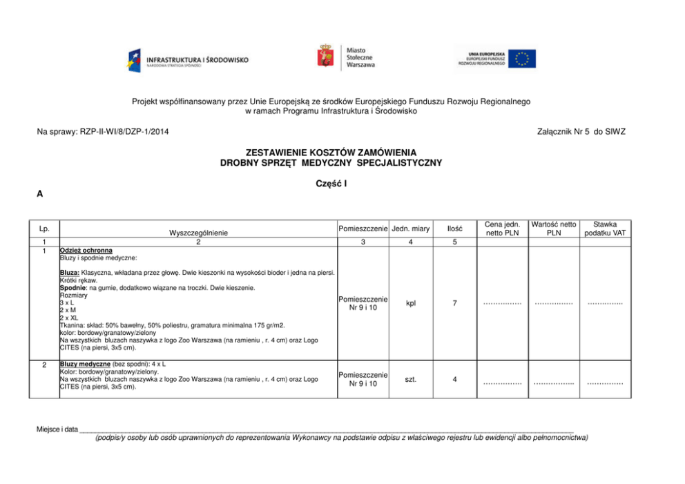 Projekt współfinansowany przez Unie Europejską ze środków Europejskiego Funduszu Rozwoju Regionalnego w ramach Programu Infrastruktura i Środowisko Na sprawy: RZP-II-WI/8/DZP-1/2014 Załącznik Nr 5 do SIWZ ZESTAWIENIE KOSZTÓW ZAMÓWIENIA DROBNY SPRZĘT MEDYCZNY SPECJALISTYCZNY Część I A Lp. 1 1 Wyszczególnienie 2 Pomieszczenie Jedn. miary 3 Cena jedn. netto PLN Wartość netto PLN Stawka podatku VAT 4 5 kpl 7 ……….…… ……….…… …….…….. szt. 4 ……………. …………….. …………… Odzież ochronna Bluzy i spodnie medyczne: Bluza: Klasyczna, wkładana przez głowę. Dwie kieszonki na wysokości bioder i jedna na piersi. Krótki rękaw. Spodnie: na gumie, dodatkowo wiązane na troczki. Dwie kieszenie. Rozmiary Pomieszczenie 3xL Nr 9 i 10 2xM 2 x XL Tkanina: skład: 50% bawełny, 50% poliestru, gramatura minimalna 175 gr/m2. kolor: bordowy/granatowy/zielony Na wszystkich bluzach naszywka z logo Zoo Warszawa (na ramieniu , r. 4 cm) oraz Logo CITES (na piersi, 3x5 cm). 2 Ilość Bluzy medyczne (bez spodni): 4 x L Kolor: bordowy/granatowy/zielony. Na wszystkich bluzach naszywka z logo Zoo Warszawa (na ramieniu , r. 4 cm) oraz Logo CITES (na piersi, 3x5 cm). Pomieszczenie Nr 9 i 10 Miejsce i data _________________________________________________________________________________________________________________________________ (podpis/y osoby lub osób uprawnionych do reprezentowania Wykonawcy na podstawie odpisu z właściwego rejestru lub ewidencji albo pełnomocnictwa) 3 4 5 Koszulki robocze z haftem na piersi (logo CITES, logo ZOO) Koszulka robocza typu polo, krój unisex lub męski gramatura minimalna 230 g/m 2 50% bawełna / 50% poliester Kolor czarny krótki rękaw wykładany kołnierzyk zapinana na trzy guziki fason klasyczny rękawy wykończone mankietem - ściągacz dół wykończony obszyciem Na koszulce naszyte logo Zoo Warszawa (r 4 cm) oraz CITES (3x5 cm) Rozmiar L – 6 szt Rozmiar M – 4 szt Rozmiar XL – 2 szt szt. 12 ……………… …………..…. ……………... szt. 1 para ……………. ………….….. ……….…….. Pomieszczenie Nr 9 i 10 kpl 1 ……………. ………….…… ……………… Pomieszczenie Nr 9 i 10 kpl. 1 ……………. RĘKAWICE OCHRONNE RTG Rękawice ochronne RTG bez palców, umożliwiające przytrzymywanie drobnych pacjentów bez Pomieszczenie narażenia na promieniowanie rozmiar 38x20 cm (+/- 5 cm); 0.5 mm Pb. Nr 9 i 10 1 para. waga elektroniczna Waga precyzyjna (przenośna) udźwig: 0.150 kg działka: 0,01g legalizacja: nie Wyświetlacz LCD Zasilanie Zasilacz AC, Konstrukcja ABS tworzywo z nierdzewną szalką blokada transportowa, blokada kalibracji, odważnik kalibracyjny. Pokrywa ważenia z przeźroczystego plastiku. 6 Pomieszczenie Nr 9 i 10 Analizator Biochemiczny wraz z zestawem 50 dysków (rotorów z datą ważności nie mniejszą niż 10 miesięcy od momentu dostarczenia) Przenośny analizator biochemiczny, pracujący w systemie dysków z gotowymi reagentami (liofilizowanymi). Możliwość wykonania analizy z 100µl materiału. Wysokość 32.4 cm (± 6 cm) Szerokość 15.3 cm (± 6 cm) Głębokość 20.3 cm (± 6 cm) Waga: nie większa niż 7 kg Wodoszczelność (IPX0) Temperatura pracy 15-32° C …………….. ……………… Strona 2 z 9 Miejsce i data ___________________________________________________________________________________________________________________________ (podpis/y osoby lub osób uprawnionych do reprezentowania Wykonawcy na podstawie odpisu z właściwego rejestru lub ewidencji albo pełnomocnictwa) Wilgotność 0 - 80% Główne napięcie - wahania nie przekraczające ± 10% napięcia nominalnego 7 8 Przenośny aparat Doplera: Zasilanie: DC9V, 9 V baterie alkaiczne Żywotność baterii: minimum 2 h pracy Częstotliwość sond: 2, oraz 8 MHz (czyli 2 sztuki) Wyjścia: słuchawki (podłączenie odcina działanie głośnika), słuchawki Port: USB Rozmiar: 75 x 140 x 25 mm (+/- 8 cm) Bezpieczeństwo: zgodne z IEC-601-1 Pomieszczenie Nr 9 i 10 szt. 1 kpl 1 ………..……… …………..….. ……..……….... Czytnik mikroczipów wraz z kompletem czipów Czip przeznaczony dla małych zwierząt 100 szt o standard czipa: ISO 11784/11785 FDX-B o typ czipa: 134,2KHz o wymiary: długość 8mm, szerokość 1,4mm ± 0,1mm o z jednorazowym aplikatorem o rodzaj sterylizacji: tlenek etylenu o klasa szczelności: IP67 o temperatura przechowywania -30°C do +85°C o 100% niezawodności o zatwierdzony przez Międzynarodowy Komitet ds. Rejestracji Zwierząt ICAR Czip przeznaczony dla dużych zwierząt 100szt o jednorazowy aplikator - strzykawka o zestaw zawiera 6 nalepek z nr czipa i kodem kreskowym o zatwierdzona przez International Committee for Animal Recording o standard czipa: ISO 11784/11785 FDX-B Pomieszczenie o typ czipa: 134,2KHz Nr 9 i 10 o wymiary: długość 12mm ± 0,4mm, szerokość 2,12mm ± 0,1mm, z jednorazowym aplikatorem o rodzaj sterylizacji: tlenek etylenu o klasa szczelności: IP67 o temperatura przechowywania -20°C do +50°C o zatwierdzony przez Międzynarodowy Komitet ds. Rejestracji Zwierząt ICAR o zgodny z normami ISO Czytnik czipów: Dane techniczne: o system ARM (STM32) o wyświetlacz LCD o częstotliwość pracy czytnika: 134,2kHz o 3 przyciski funkcyjne o zegar podający datę i czas odczytu o powiadomienie o odczycie dźwiękiem o zasięg odczytu urządzenia: odległość do 12cm od transpondera o komunikacja z PC za pomocą USB bądź Bluetooth ………..……. ………..……. ………………. Strona 3 z 9 Miejsce i data ___________________________________________________________________________________________________________________________ (podpis/y osoby lub osób uprawnionych do reprezentowania Wykonawcy na podstawie odpisu z właściwego rejestru lub ewidencji albo pełnomocnictwa) 9 10 11 o ciągła praca do 12h o długość 20cm o zasilanie: trzy baterie AA o wilgotność względna 5%-90% o temperatura 