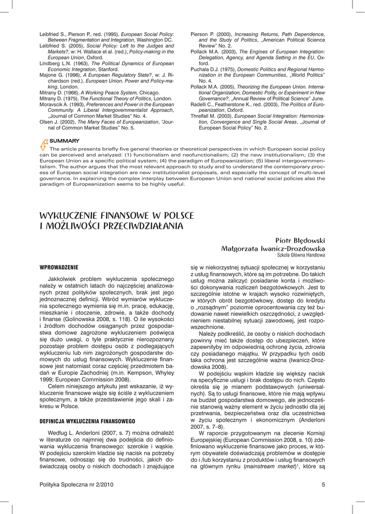Leibfried S., Pierson P., red. (1995), European Social Policy: Between Fragmentation and Integration, Washington DC. Leibfried S. (2005), Social Policy: Left to the Judges and Markets?, w: H. Wallace et al. (red.), Policy-making in the European Union, Oxford. Lindberg L.N. (1963), The Political Dynamics of European Economic Integration, Stanford. Majone G. (1996), A European Regulatory State?, w: J. Richardson (red.), European Union. Power and Policy-making, London. Mitrany D. (1966), A Working Peace System, Chicago. Mitrany D. (1975), The Functional Theory of Politics, London. Moravscik A. (1993), Preferences and Power in the European Community. A Liberal Intergovernmentalist Approach, „Journal of Common Market Studies” No. 4. Olsen J. (2002), The Many Faces of Europeanization, “Journal of Common Market Studies” No. 5. Pierson P. (2000), Increasing Returns, Path Dependence, and the Study of Politics, „American Political Science Review” No. 2. Pollack M.A. (2003), The Engines of European Integration: Delegation, Agency, and Agenda Setting in the EU, Oxford. Puchala D.J. (1975), Domestic Politics and Regional Harmonization in the European Communities, „World Politics” No. 4. Pollack M.A. (2005), Theorizing the European Union. International Organization, Domestic Polity, or Experiment in New Governance?, „Annual Review of Political Science” June. Radelli C., Featherstone K., red. (2003), The Politics of Europeanization, Oxford. Threlfall M. (2003), European Social Integration: Harmonization, Convergence and Single Social Areas, „Journal of European Social Policy” No. 2. SUMMARY The article presents briefly five general theories or theoretical perspectives in which European social policy can be perceived and analyzed: (1) functionalism and neofunctionalism; (2) the new institutionalism; (3) the European Union as a specific political system; (4) the paradigm of Europeanization; (5) liberal intergovernmentalism. The author argues that the most relevant approach to study and to understand the contemporary process of European social integration are new institutionalist proposals, and especially the concept of multi-level governance. In explaining the complex interplay between European Union and national social policies also the paradigm of Europeanization seems to be highly useful. WYKLUCZENIE FINANSOWE W POLSCE I MOŻLIWOŚCI PRZECIWDZIAŁANIA Piotr Błędowski Małgorzata Iwanicz-Drozdowska Szkoła Główna Handlowa WPROWADZENIE Jakkolwiek problem wykluczenia społecznego należy w ostatnich latach do najczęściej analizowanych przez polityków społecznych, brak jest jego jednoznacznej definicji. Wśród wymiarów wykluczenia społecznego wymienia się m.in. pracę, edukację, mieszkanie i otoczenie, zdrowie, a także dochody i finanse (Golinowska 2008, s. 118). O ile wysokości i źródłom dochodów osiąganych przez gospodarstwa domowe zagrożone wykluczeniem poświęca się dużo uwagi, o tyle praktycznie nierozpoznany pozostaje problem dostępu osób z podlegających wykluczeniu lub nim zagrożonych gospodarstw domowych do usług finansowych. Wykluczenie finansowe jest natomiast coraz częściej przedmiotem badań w Europie Zachodniej (m.in. Kempson, Whyley 1999; European Commission 2008). Celem niniejszego artykułu jest wskazanie, iż wykluczenie finansowe wiąże się ściśle z wykluczeniem społecznym, a także przedstawienie jego skali i zakresu w Polsce. DEFINICJA WYKLUCZENIA FINANSOWEGO Według L. Anderloni (2007, s. 7) można odnaleźć w literaturze co najmniej dwa podejścia do definiowania wykluczenia finansowego: szerokie i wąskie. W podejściu szerokim kładzie się nacisk na potrzeby finansowe, odnosząc się do trudności, jakich doświadczają osoby o niskich dochodach i znajdujące Polityka Społeczna nr 2/2010 się w niekorzystnej sytuacji społecznej w korzystaniu z usług finansowych, które są im potrzebne. Do takich usług można zaliczyć posiadanie konta i możliwości dokonywania rozliczeń bezgotówkowych. Jest to szczególnie istotne w krajach wysoko rozwiniętych, w których obrót bezgotówkowy, dostęp do kredytu o „rozsądnym” poziomie oprocentowania czy też budowanie nawet niewielkich oszczędności, z uwzględnieniem niestabilnej sytuacji zawodowej, jest rozpowszechnione. Należy podkreślić, że osoby o niskich dochodach powinny mieć także dostęp do ubezpieczeń, które zapewniłyby im odpowiednią ochronę życia, zdrowia czy posiadanego majątku. W przypadku tych osób taka ochrona jest szczególnie ważna (Iwanicz-Drozdowska 2008). W podejściu wąskim kładzie się większy nacisk na specyficzne usługi i brak dostępu do nich. Często określa się je mianem podstawowych (uniwersalnych). Są to usługi finansowe, które nie mają wpływu na budżet gospodarstwa domowego, ale jednocześnie stanowią ważny element w życiu jednostki dla jej przetrwania, bezpieczeństwa oraz dla uczestnictwa w życiu społecznym i ekonomicznym (Anderloni 2007, s. 7–8). W raporcie przygotowanym na zlecenie Komisji Europejskiej (European Commission 2008, s. 10) zdefiniowano wykluczenie finansowe jako proces, w którym obywatele doświadczają problemów w dostępie do i /lub korzystaniu z produktów i usług finansowych na głównym rynku (mainstream market)1, które są 5 odpowiednie do ich potrzeb i umożliwiają im prowadzenie normalnego życia w społeczeństwie, do którego należą. W ramach opisu zjawiska wykluczenia finansowego używa się także określenia braku ubankowienia (unbanked) bądź też niedostatecznego ubankowienia (underbanked). W tym drugim przypadku choć osoba (bądź gospodarstwo domowe) formalnie jest klientem banku, to w praktyce w niewielkim stopniu korzysta z jego usług. Oba te zjawiska z różnym natężeniem występują w Polsce i wymagają uwagi decydentów oraz środowiska naukowego. Narodowa Strategia Integracji Społecznej nie wymienia walki z wykluczeniem finansowym wśród swoich priorytetó