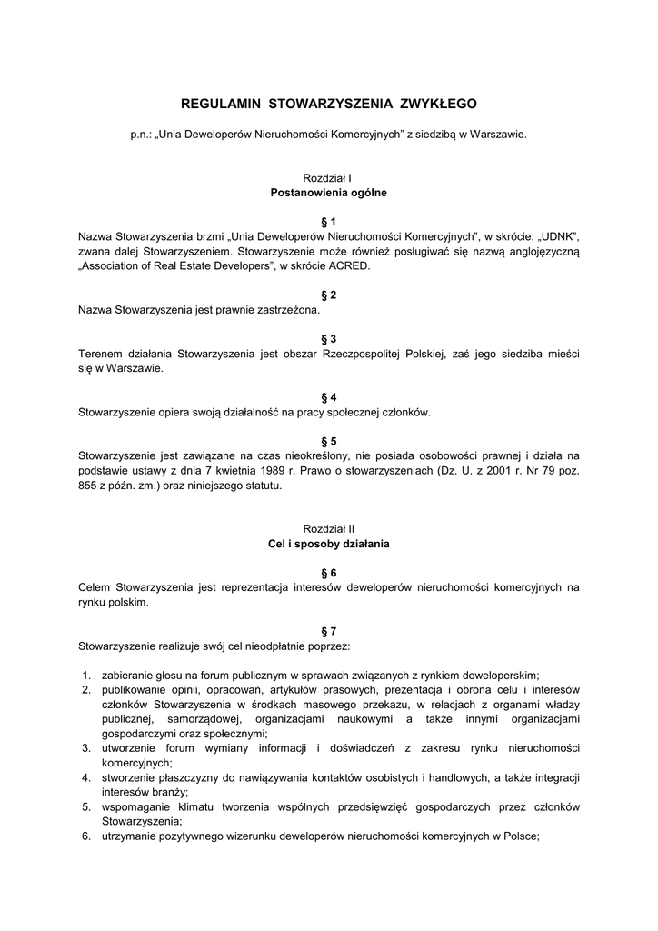 REGULAMIN STOWARZYSZENIA ZWYKŁEGO p.n.: „Unia Deweloperów Nieruchomości Komercyjnych” z siedzibą w Warszawie. Rozdział I Postanowienia ogólne §1 Nazwa Stowarzyszenia brzmi „Unia Deweloperów Nieruchomości Komercyjnych”, w skrócie: „UDNK”, zwana dalej Stowarzyszeniem. Stowarzyszenie może również posługiwać się nazwą anglojęzyczną „Association of Real Estate Developers”, w skrócie ACRED. §2 Nazwa Stowarzyszenia jest prawnie zastrzeżona. §3 Terenem działania Stowarzyszenia jest obszar Rzeczpospolitej Polskiej, zaś jego siedziba mieści się w Warszawie. §4 Stowarzyszenie opiera swoją działalność na pracy społecznej członków. §5 Stowarzyszenie jest zawiązane na czas nieokreślony, nie posiada osobowości prawnej i działa na podstawie ustawy z dnia 7 kwietnia 1989 r. Prawo o stowarzyszeniach (Dz. U. z 2001 r. Nr 79 poz. 855 z późn. zm.) oraz niniejszego statutu. Rozdział II Cel i sposoby działania §6 Celem Stowarzyszenia jest reprezentacja interesów deweloperów nieruchomości komercyjnych na rynku polskim. §7 Stowarzyszenie realizuje swój cel nieodpłatnie poprzez: 1. zabieranie głosu na forum publicznym w sprawach związanych z rynkiem deweloperskim; 2. publikowanie opinii, opracowań, artykułów prasowych, prezentacja i obrona celu i interesów członków Stowarzyszenia w środkach masowego przekazu, w relacjach z organami władzy publicznej, samorządowej, organizacjami naukowymi a także innymi organizacjami gospodarczymi oraz społecznymi; 3. utworzenie forum wymiany informacji i doświadczeń z zakresu rynku nieruchomości komercyjnych; 4. stworzenie płaszczyzny do nawiązywania kontaktów osobistych i handlowych, a także integracji interesów branży; 5. wspomaganie klimatu tworzenia wspólnych przedsięwzięć gospodarczych przez członków Stowarzyszenia; 6. utrzymanie pozytywnego wizerunku deweloperów nieruchomości komercyjnych w Polsce; 7. organizowanie i propagowanie szkoleń z zakresu rozwoju rynku deweloperskiego w Polsce i na świecie; 8. aktywna pomoc w rozstrzyganiu ewentualnych konfliktów pomiędzy członkami Stowarzyszenia lub innych wskazanych przez strony; 9. działalność szkoleniową, doradczą, konferencyjną oraz informacyjną; 10. współpracę z portalami informacyjnymi oraz czasopismami branżowymi w zakresie pogłębiania świadomości prawnej związanej z branżą deweloperską; 11. opiniowanie zmian w prawie oraz działalność lobbingową. Rozdział III Członkowie Stowarzyszenia §8 Członkami Stowarzyszenia mogą być osoby fizyczne, w tym cudzoziemcy niemający miejsca zamieszkania na terytorium Rzeczypospolitej Polskiej. §9 1. Członkiem Stowarzyszenia może być osoba fizyczna posiadająca pełną zdolność do czynności prawnych i niepozbawiona praw publicznych, a jednocześnie będąca akcjonariuszem, udziałowcem, wspólnikiem i/lub członkiem zarządu lub rady nadzorczej osoby prawnej bądź jednostki organizacyjnej niebędącej osobą prawną, której ustawa przyznaje zdolność prawną, pod warunkiem prowadzenia przez tą osobę prawną działalności deweloperskiej na rynku nieruchomości komercyjnych w Polsce, a także osoba fizyczna posiadająca pełną zdolność do czynności prawnych i niepozbawiona praw publicznych, specjalizująca się lub stale współpracująca z branżą działalności deweloperskiej na rynku nieruchomości komercyjnych w Polsce. 2. Członków Stowarzyszenia przyjmuje Przedstawiciel na podstawie pisemnej deklaracji w terminie 30 dni od jej przedłożenia. Rozdział IV Przedstawiciel Stowarzyszenia § 10 1. Przedstawicielem Stowarzyszenia jest Pan Mariusz Półtorak. 2. Przedstawiciel Stowarzyszenia może udzielić pełnomocnictwa innemu członkowi Stowarzyszenia do wykonywania poszczególnych lub wszystkich zadań wchodzących w zakres uprawnień Przedstawiciela. 3. Przedstawiciel prowadzi sprawy i kieruje całokształtem działalności Stowarzyszenia oraz reprezentuje je na zewnątrz.