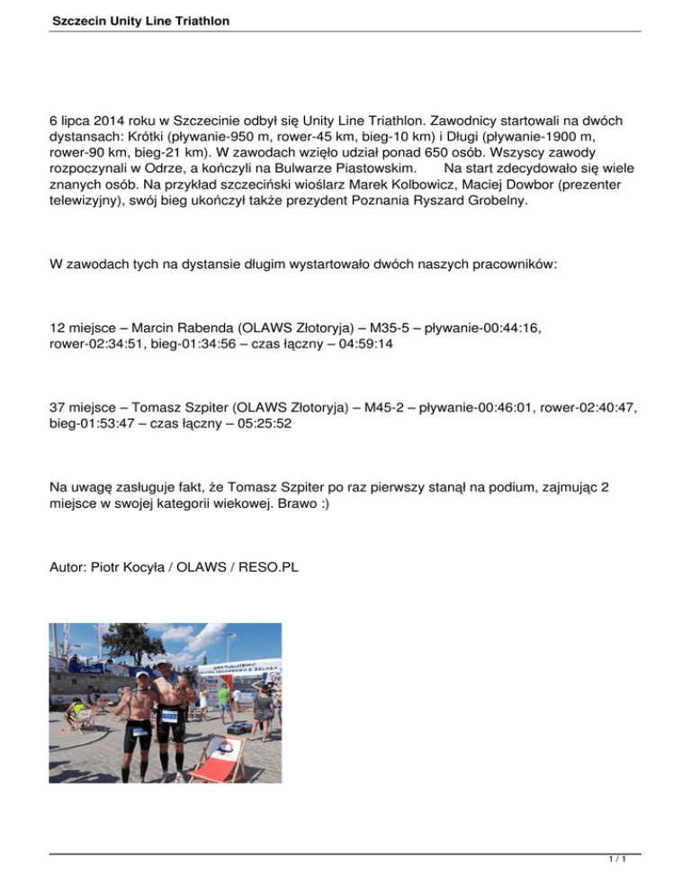 Szczecin Unity Line Triathlon 6 lipca 2014 roku w Szczecinie odbył się Unity Line Triathlon. Zawodnicy startowali na dwóch dystansach: Krótki (pływanie-950 m, rower-45 km, bieg-10 km) i Długi (pływanie-1900 m, rower-90 km, bieg-21 km). W zawodach wzięło udział ponad 650 osób. Wszyscy zawody rozpoczynali w Odrze, a kończyli na Bulwarze Piastowskim. Na start zdecydowało się wiele znanych osób. Na przykład szczeciński wioślarz Marek Kolbowicz, Maciej Dowbor (prezenter telewizyjny), swój bieg ukończył także prezydent Poznania Ryszard Grobelny. W zawodach tych na dystansie długim wystartowało dwóch naszych pracowników: 12 miejsce – Marcin Rabenda (OLAWS Złotoryja) – M35-5 – pływanie-00:44:16, rower-02:34:51, bieg-01:34:56 – czas łączny – 04:59:14 37 miejsce – Tomasz Szpiter (OLAWS Złotoryja) – M45-2 – pływanie-00:46:01, rower-02:40:47, bieg-01:53:47 – czas łączny – 05:25:52 Na uwagę zasługuje fakt, że Tomasz Szpiter po raz pierwszy stanął na podium, zajmując 2 miejsce w swojej kategorii wiekowej. Brawo :) Autor: Piotr Kocyła / OLAWS / RESO.PL 1/1