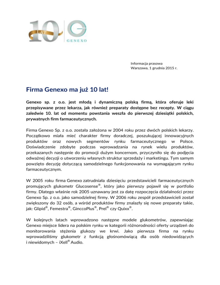 Informacja prasowa Warszawa, 1 grudnia 2015 r. Firma Genexo ma już 10 lat! Genexo sp. z o.o. jest młodą i dynamiczną polską firmą, która oferuje leki przepisywane przez lekarza, jak również preparaty dostępne bez recepty. W ciągu zaledwie 10. lat od momentu powstania weszła do pierwszej dziesiątki polskich, prywatnych firm farmaceutycznych. Firma Genexo Sp. z o.o. została założona w 2004 roku przez dwóch polskich lekarzy. Początkowo miała mieć charakter firmy doradczej, poszukującej innowacyjnych produktów oraz nowych segmentów rynku farmaceutycznego w Polsce. Doświadczenie zdobyte podczas wprowadzania na rynek wielu produktów, przekazanych następnie do promocji dużym koncernom, przyczyniło się do podjęcia odważnej decyzji o utworzeniu własnych struktur sprzedaży i marketingu. Tym samym powzięto decyzję dotyczącą samodzielnego funkcjonowania na wymagającym rynku farmaceutycznym. W 2005 roku firma Genexo zatrudniała dziesięciu przedstawicieli farmaceutycznych promujących glukometr Glucosense®, który jako pierwszy pojawił się w portfolio firmy. Dlatego właśnie rok 2005 uznawany jest za datę rozpoczęcia działalności przez Genexo Sp. z o.o. jako samodzielnej firmy. W 2006 roku zespół przedstawicieli został zwiększony do 32 osób, a wśród produktów firmy znalazły się nowe preparaty takie, jak: Glipid®, Femestra®, GinccoPlus®, Prel® czy Quixx®. W kolejnych latach wprowadzono następne modele glukometrów, zapewniając Genexo miejsce lidera na polskim rynku w kategorii różnorodności oferty urządzeń do monitorowania stężenia glukozy we krwi. Jako pierwsza firma na rynku wprowadziliśmy glukometr z funkcją głośnomówiącą dla osób niedowidzących i niewidomych – iXell® Audio. Dbałość o wysoką jakość oferowanych produktów jest jednym z kluczowych zadań firmy. Służy temu wprowadzona od początku istnienia firmy polityka jakości, czego potwierdzeniem są: certyfikat GMP dla produktów leczniczych, wydany przez Głównego Inspektora Farmaceutycznego oraz certyfikaty ISO 9001 i ISO 13485, potwierdzające utrzymywanie w firmie Systemu Zarządzania Jakością, jak również certyfikaty CE 93/42 EEC oraz 98/79 EC dla wyrobów medycznych, wydane przez TÜV Rheinland. Obecnie firma zatrudnia już 150 osób, oferuje szerokie portfolio leków, suplementów diety, wyrobów medycznych i kosmetyków. Rozwija się prężnie nie tylko na rynku polskim, ale również w innych krajach Unii Europejskiej, republikach nadbałtyckich, południowo-wschodniej Europie, Rosji, Gruzji, Uzbekistanie i Ukrainie. W 2014 roku firma Genexo znalazła się w pierwszej 50. firm farmaceutycznych w Polsce, z których 37 to międzynarodowe koncerny farmaceutyczne. Jako jedyna z tych firm powstała w XXI wieku. Jest też w pierwszej dziesiątce prywatnych, polskich firm farmaceutycznych, którą tworzą Aflofarm, Adamed, USP Zdrowie, Hasco, Polfarmex, Lek-Am, Olimp Labs, Biofarm, Celon Pharma i Genexo (z zestawienia wyłączone są firmy, które powstały z przekształcenia przedsiębiorstw państwowych).* Preparat synbiotyczny Multilac® jest liderem w swojej kategorii od prawie 5 lat i synbiotykiem najczęściej rekomendowanym osobom dorosłym. Również Quixx® zajmuje pierwsze miejsce pod względem sprzedaży na rynku testów ciążowych. Genexo ma również w swojej ofercie produkty dla diabetyków (pacjentów z cukrzycą) – glukometry. Biorąc pod uwagę sprzedaż pasków testowych iXell ® i Glucosense®, jest jedyną polską firmą w pierwszej piątce pod względem sprzedaży. * Raport PharmaExpert z 09.2015.