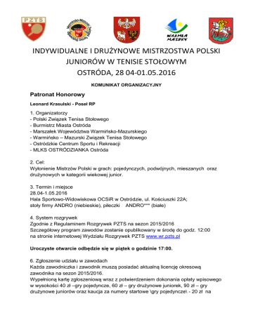 INDYWIDUALNE I DRUŻYNOWE MISTRZOSTWA POLSKI JUNIORÓW W TENISIE STOŁOWYM OSTRÓDA, 28 04-01.05.2016 KOMUNIKAT ORGANIZACYJNY Patronat Honorowy Leonard Krasulski - Poseł RP 1. Organizatorzy - Polski Związek Tenisa Stołowego - Burmistrz Miasta Ostróda - Marszałek Województwa Warmińsko-Mazurskiego - Warmińsko – Mazurski Związek Tenisa Stołowego - Ostródzkie Centrum Sportu i Rekreacji - MLKS OSTRÓDZIANKA Ostróda 2. Cel: Wyłonienie Mistrzów Polski w grach: pojedynczych, podwójnych, mieszanych oraz drużynowych w kategorii wiekowej junior. 3. Termin i miejsce 28.04-1.05.2016 Hala Sportowo-Widowiskowa OCSiR w Ostródzie, ul. Kościuszki 22A; stoły firmy ANDRO (niebieskie), piłeczki ANDRO*** (białe) 4. System rozgrywek Zgodnie z Regulaminem Rozgrywek PZTS na sezon 2015/2016 Szczegółowy program zawodów zostanie opublikowany w środę do godz. 12:00 na stronie internetowej Wydziału Rozgrywek PZTS www.wr.pzts.pl Uroczyste otwarcie odbędzie się w piątek o godzinie 17:00. 6. Zgłoszenie udziału w zawodach Każda zawodniczka i zawodnik muszą posiadać aktualną licencję okresową zawodnika na sezon 2015/2016. Wypełnioną kartę zgłoszeniową wraz z potwierdzeniem dokonania opłaty wpisowego w wysokości 40 zł –gry pojedyncze, 60 zł – gry drużynowe juniorek, 90 zł – gry drużynowe juniorów oraz kaucja za numery startowe \gry pojedyncze\ - 20 zł na konto MLKS OSTRÓDZIANKA Ostróda: konto nr 14 1020 3613 0000 6102 0029 7275 należy przesłać w nieprzekraczalnym terminie do dnia 25.04.2016 roku do godz. 21:00 Przewodniczący Wydziału Rozgrywek PZTS Marek Przybyłowicz tel.: 503 081 346, e-mail: [email protected] 7. Zakwaterowanie i wyżywienie Organizator gwarantuje miejsca noclegowe z wyżywieniem (ilość miejsc ograniczona, decyduje kolejność zgłoszeń) dla zawodniczek i zawodników, którzy dokonają rezerwacji do 20.04.2016. - Hotel SAJMINO ul. Michała Kajki 6, Kajkowo (około 2 km od miejsca zawodów): osobodzień 130 PLN / nocleg + całodzienne wyżywienie/ około 70 miejsc - Hotel DOM POLONII ul. Pieniężnego 6 (250 m od miejsca zawodów): osobodzień 130 PLN / nocleg + całodzienne wyżywienie/ około 100 miejsc 8. Biuro zawodów W dniu 27.04.2016 od godz.15 00: Dom Polonii w Ostródzie, ul Pieniężnego 6, Zgłoszenia pisemne dotyczące rezerwacji noclegów oraz wyżywienie należy przesłać na adres e-mail: [email protected] do dnia 20.04. 2016 roku (po tym terminie organizator nie zapewnia miejsc noclegowych i wyżywienia) 1.Dodatkowych informacji o turnieju udzielają: Tadeusz Krajewski - tel. kom. 664 736 790 9. Nagrody: W grach indywidualnych za miejsca 1-4,medale, puchary, dyplomy oraz nagrody rzeczowe W grach podwójnych zwycięzcy otrzymają medale, puchary, dyplomy i nagrody rzeczowe, miejsca 2-4 medale, puchary i dyplomy W turnieju drużynowym za miejsca 1-3 medale, puchary i dyplomy 10. Zasady finansowania: Koszty organizacyjne pokrywają organizatorzy. Koszty uczestnictwa pokrywają uczestnicy płatne gotówką w miejscach zakwaterowania. ZA ORGANIZATORÓW Tadeusz Krajewski