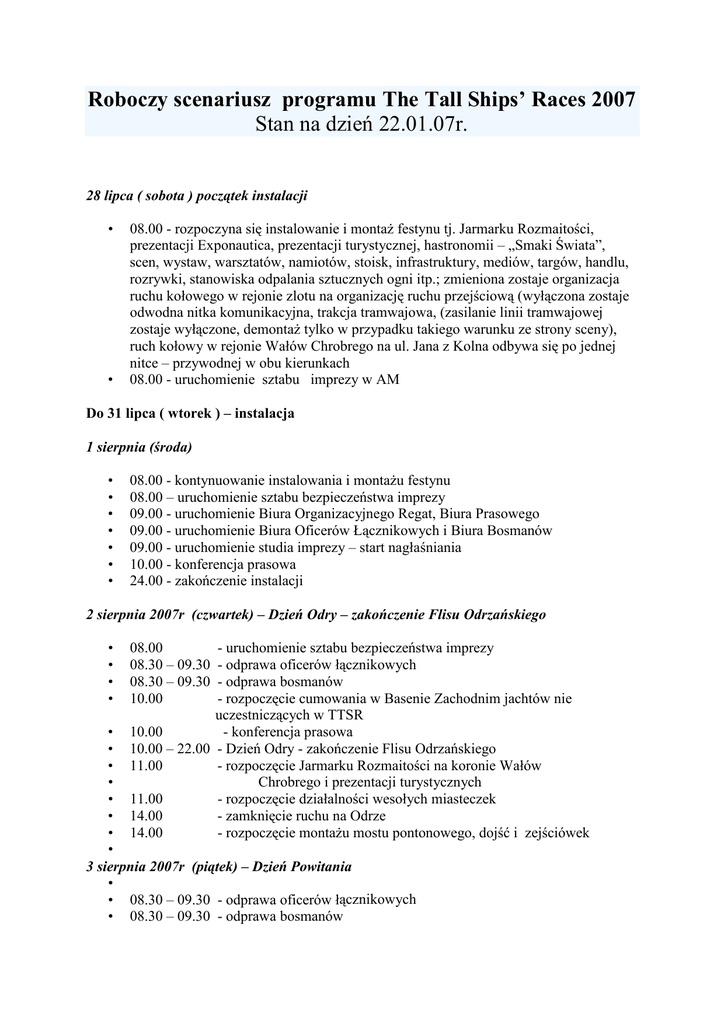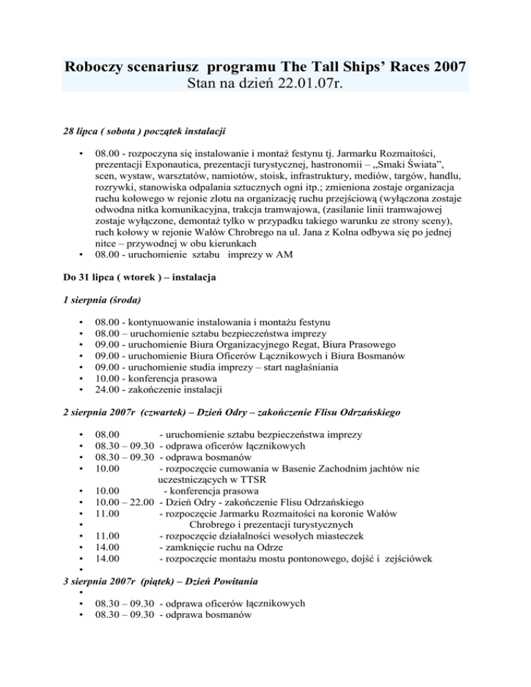 Roboczy scenariusz programu The Tall Ships’ Races 2007 Stan na dzień 22.01.07r. 28 lipca ( sobota ) początek instalacji • • 08.00 - rozpoczyna się instalowanie i montaŜ festynu tj. Jarmarku Rozmaitości, prezentacji Exponautica, prezentacji turystycznej, hastronomii – „Smaki Świata”, scen, wystaw, warsztatów, namiotów, stoisk, infrastruktury, mediów, targów, handlu, rozrywki, stanowiska odpalania sztucznych ogni itp.; zmieniona zostaje organizacja ruchu kołowego w rejonie zlotu na organizację ruchu przejściową (wyłączona zostaje odwodna nitka komunikacyjna, trakcja tramwajowa, (zasilanie linii tramwajowej zostaje wyłączone, demontaŜ tylko w przypadku takiego warunku ze strony sceny), ruch kołowy w rejonie Wałów Chrobrego na ul. Jana z Kolna odbywa się po jednej nitce – przywodnej w obu kierunkach 08.00 - uruchomienie sztabu imprezy w AM Do 31 lipca ( wtorek ) – instalacja 1 sierpnia (środa) • • • • • • • 08.00 - kontynuowanie instalowania i montaŜu festynu 08.00 – uruchomienie sztabu bezpieczeństwa imprezy 09.00 - uruchomienie Biura Organizacyjnego Regat, Biura Prasowego 09.00 - uruchomienie Biura Oficerów Łącznikowych i Biura Bosmanów 09.00 - uruchomienie studia imprezy – start nagłaśniania 10.00 - konferencja prasowa 24.00 - zakończenie instalacji 2 sierpnia 2007r (czwartek) – Dzień Odry – zakończenie Flisu Odrzańskiego • • • • 08.00 08.30 – 09.30 08.30 – 09.30 10.00 - uruchomienie sztabu bezpieczeństwa imprezy - odprawa oficerów łącznikowych - odprawa bosmanów - rozpoczęcie cumowania w Basenie Zachodnim jachtów nie uczestniczących w TTSR 10.00 - konferencja prasowa 10.00 – 22.00 - Dzień Odry - zakończenie Flisu Odrzańskiego 11.00 - rozpoczęcie Jarmarku Rozmaitości na koronie Wałów Chrobrego i prezentacji turystycznych 11.00 - rozpoczęcie działalności wesołych miasteczek 14.00 - zamknięcie ruchu na Odrze 14.00 - rozpoczęcie montaŜu mostu pontonowego, dojść i zejściówek • • • • • • • • 3 sierpnia 2007r (piątek) – Dzień Powitania • • 08.30 – 09.30 - odprawa oficerów łącznikowych • 08.30 – 09.30 - odprawa bosmanów • • • • • • • • • 10.00 11.00 – 22.00 11.00 14.00 14.00 - rozpoczęcie rejsów promu na Łasztownię - Jarmark Rozmaitości - rozpoczęcie prezentacji i wystaw - przybycie pierwszych jednostek do Szczecina - uroczyste powitanie pierwszej wchodzącej jednostki - uroczyste powitanie pierwszych jednostek z kaŜdej klasy 14.00 – 00.00 - cumowanie przychodzących jednostek uczestników TSR 2007, na kejach uroczyste powitania 14.00 – 18.00 - wyścigi „smoczych łodzi” 16.00 – 24.00 - programy artystyczno - rozrywkowe na scenach - wielki namiot – Jazz, Blues, R’roll Festiwal - kapitanat – muzyka świata - uc – piosenka Ŝeglarska - pl. Mickiewicza – piosenka dziecięca (do godz. 19.00 po godz. 19.00 kameralne spotkania jazzowo, bluesowe lub szantowe) 22.00 – 24.00 - przedstawienie w amfiteatrze „Holender tułacz” 4 sierpnia 2007r (sobota) • • • • • • • • • • • • • • • • • • • 00.00 – 05.00 - kino nocne w wielkim namiocie – przegląd filmów morskich 00.00 – 05.00 - kino nocne w magazynie Starówka – przegląd morskich filmów dokumentalnych 00.00 – 17.00 - cumowania, odprawy i powitania przybywających jednostek 08.00 - podniesienie bandery na jednostkach, 08.00 - uroczyste podniesienie bandery państwowej na maszcie centralnym wraz z biciem szklanek 08.30 – 09.30 - odprawa oficerów łącznikowych 08.30 – 09.30 - odprawa bosmanów 10.00 – 20.00 - start „Exponautica”, „Szczecin i Przyjaciele” i inne prezentacje 10.00 – 22.00 - rejsy promu pomiędzy Dworcem Morskim a Starówką 12.00 - 22.00 - imprezy dla publiczności na scenach: - „wielki namiot” - Jazz, Blues, R’roll Festiwal - kapitanat - muzyka świata - uc – piosenka Ŝeglarska - pl. Mickiewicza – piosenka dziecięca (do godz. 19.00 po godz. 19.00 kameralne spotkania jazzowo, bluesowe lub szantowe) 10.00 – 17.00 - zwiedzanie miasta dla przybyłych załóg, pływalnia, sauna 10.00 - konferencja prasowa 10.30 – 17.00 - wyścigi „smoczych łodzi 17.00 – 18.00 - uroczystość otwarcia zlotu 18.30 – 19.30 - uroczyste otwarcie konferencji melvilowskiej na „Darze MłodzieŜy” połączone z koncertem szantowym na pokładzie (z pokładu) 20.00 – 22.00 - przyjęcie dla kapitanów 22.00 – 23.00 - widowisko plenerowe 23.00 – 00.30 - kino nocne w magazynie Starówka – przegląd morskich filmów dokumentalnych 5 sierpnia (niedziela) • • • • • • • • • • • • • • • • • • • • • 00.00 – 05.00 - kino nocne w wielkim namiocie – przegląd filmów morskich 00.00 – 05.00 - kino nocne w magazynie Starówka – przegląd filmów morskich 08.00 - podniesienie bandery na jednostkach, 08.00 - uroczyste podniesienie bandery państwowej na maszcie centralnym wraz z biciem szklanek 08.30 – 09.00 - odprawa oficerów łącznikowych 08.30 – 09.00 - odprawa bosmanów 09.30 – 10.30 - „Blessing of the sails” – naboŜeństwo ekumeniczne 10.00 – 20.00 - „Exponautica” i inne prezentacje 10.00 – 20.00 - rejsy promu pomiędzy Dworcem Morskim a Starówką 12.00 – 24.00 - imprezy dla publiczności na scenach: - „wielki namiot” – dyskoteka dla załóg (20.00 – 24.00) - kapitanat – wielki koncert - urząd celny – „Szantrapa” – piosenka Ŝeglarska - pl. Mickiewicza – koncerty dla dzieci, w nocy jam session 09.00 – 14.00 - konferencja melvilowska 10.30 – 14.00 - zwiedzanie miasta i inne atrakcje dla załóg 10.30 - konferencja prasowa 11.00 – 20.00 - zwiedzanie Ŝaglowców, 14.00 – 17.30 - parada załóg w mieście 17.30 – 18.30 - uroczyste rozdanie nagród 19.00 – 21. 00 - marynistyczny wieczór poetycki w muzeum (teatrze) 20.00 – 24.00 - dyskoteka dla załóg 20.00 – 24.00 - wielki koncert