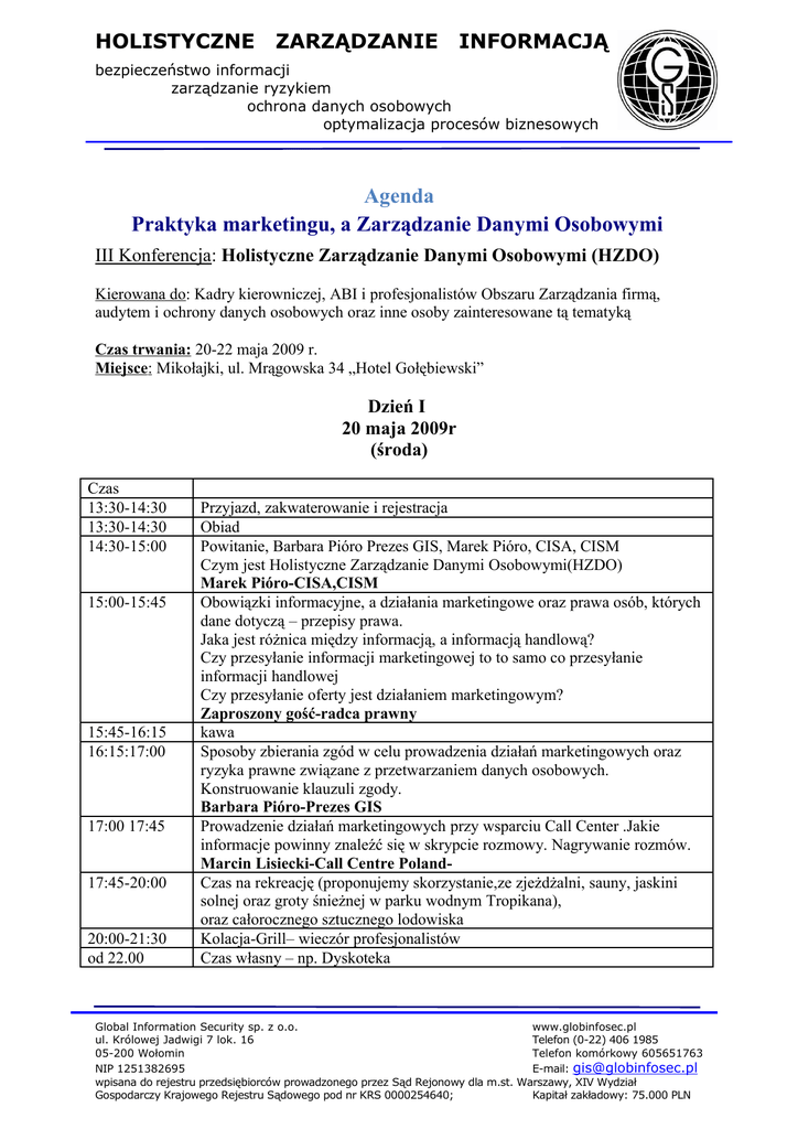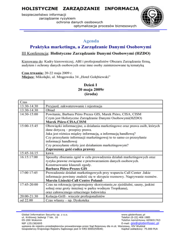 HOLISTYCZNE ZARZĄDZANIE INFORMACJĄ bezpieczeństwo informacji zarządzanie ryzykiem ochrona danych osobowych optymalizacja procesów biznesowych Agenda Praktyka marketingu, a Zarządzanie Danymi Osobowymi III Konferencja: Holistyczne Zarządzanie Danymi Osobowymi (HZDO) Kierowana do: Kadry kierowniczej, ABI i profesjonalistów Obszaru Zarządzania firmą, audytem i ochrony danych osobowych oraz inne osoby zainteresowane tą tematyką Czas trwania: 20-22 maja 2009 r. Miejsce: Mikołajki, ul. Mrągowska 34 „Hotel Gołębiewski” Dzień I 20 maja 2009r (środa) Czas 13:30-14:30 13:30-14:30 14:30-15:00 15:00-15:45 15:45-16:15 16:15:17:00 17:00 17:45 17:45-20:00 20:00-21:30 od 22.00 Przyjazd, zakwaterowanie i rejestracja Obiad Powitanie, Barbara Pióro Prezes GIS, Marek Pióro, CISA, CISM Czym jest Holistyczne Zarządzanie Danymi Osobowymi(HZDO) Marek Pióro-CISA,CISM Obowiązki informacyjne, a działania marketingowe oraz prawa osób, których dane dotyczą – przepisy prawa. Jaka jest różnica między informacją, a informacją handlową? Czy przesyłanie informacji marketingowej to to samo co przesyłanie informacji handlowej Czy przesyłanie oferty jest działaniem marketingowym? Zaproszony gość-radca prawny kawa Sposoby zbierania zgód w celu prowadzenia działań marketingowych oraz ryzyka prawne związane z przetwarzaniem danych osobowych. Konstruowanie klauzuli zgody. Barbara Pióro-Prezes GIS Prowadzenie działań marketingowych przy wsparciu Call Center .Jakie informacje powinny znaleźć się w skrypcie rozmowy. Nagrywanie rozmów. Marcin Lisiecki-Call Centre PolandCzas na rekreację (proponujemy skorzystanie,ze zjeżdżalni, sauny, jaskini solnej oraz groty śnieżnej w parku wodnym Tropikana), oraz całorocznego sztucznego lodowiska Kolacja-Grill– wieczór profesjonalistów Czas własny – np. Dyskoteka Global Information Security sp. z o.o. www.globinfosec.pl ul. Królowej Jadwigi 7 lok. 16 Telefon (0-22) 406 1985 05-200 Wołomin Telefon komórkowy 605651763 NIP 1251382695 E-mail: [email protected] wpisana do rejestru przedsiębiorców prowadzonego przez Sąd Rejonowy dla m.st. Warszawy, XIV Wydział Gospodarczy Krajowego Rejestru Sądowego pod nr KRS 0000254640; Kapitał zakładowy: 75.000 PLN HOLISTYCZNE ZARZĄDZANIE INFORMACJĄ bezpieczeństwo informacji zarządzanie ryzykiem ochrona danych osobowych optymalizacja procesów biznesowych Dzień II 21 maja 2009r (czwartek) Czas 7:00-9:00 9:30-10:30 10:30-11:30 11:30-12:00 12:00-12:45 12:45-13:30 13:30-14:30 14:30-15.15 15:15-16:00 16:00-16:30 16:30-17:30 17.30-19.30 19.30-21.30 22.00 Śniadanie (bufet szwedzki) Konstruowanie umów przetwarzania danych osobowych w celu realizacji akcji marketingowych. Nabywanie i sprzedaż baz danych osobowych dla celów marketingowych Barbara Pióro-Prezes GIS Prowadzenie kontroli w firmach świadczących usługi marketingowe przez AD i GIODO. Rola i zadania ABI iAD w kontroli. Marek Pióro CISA,CISM Przerwa na kawę Jak kierować komunikaty marketingowe zgodnie z prawem. Kierowanie do własnych klientów informacji handlowych podmiotów współpracujących. Kampanie Marketingowe w grupie kapitałowej. Kierowanie działań marketingowych do użytkowników portali społecznościowych i uczestników programów lojalnościowych Barbara Pióro-Prezes GIS Odpowiedzialność prawna (karna, cywilna, administracyjna) osób prowadzących i zlecających akcje marketingowe. Marta Nieścierowicz - Prawnik Obiad Stan przestrzegania przepisów o ochronie danych osobowych oraz kierunki rozwoju mec. Andrzej Lewiński -Zastępca Generalnego Inspektora Ochrony Danych Osobowych Wpływ wyroków NSA i WSA oraz decyzji GIODO na przetwarzanie danych osobowych w celach marketingowych Barbara Pióro-Prezes GIS Przerwa na kawę Praktyka marketingu, a wymagania jakie powinny spełniać systemy wspierające prowadzenie akcji marketingowych (CRM) Marek Pióro-CISA,CISM Czas na rekreację (proponujmy skorzystanie,ze zjeżdżalni, sauny, jaskini solnej oraz groty śnieżnej w parku wodnym Tropikana), oraz całorocznego sztucznego lodowiska Kolacja-Biesiada Staropolska Czas własny – np. dyskoteka Global Information Security sp. z o.o. www.globinfosec.pl ul. Królowej Jadwigi 7 lok. 16 Telefon (0-22) 406 1985 05-200 Wołomin Telefon komórkowy 605651763 NIP 1251382695 E-mail: [email protected] wpisana do rejestru przedsiębiorców prowadzonego przez Sąd Rejonowy dla m.st. Warszawy, XIV Wydział Gospodarczy Krajowego Rejestru Sądowego pod nr KRS 0000254640; Kapitał zakładowy: 75.000 PLN HOLISTYCZNE ZARZĄDZANIE INFORMACJĄ bezpieczeństwo informacji zarządzanie ryzykiem ochrona danych osobowych optymalizacja procesów biznesowych Dzień III 22 maja 2009r (piątek) Czas 7.00-9.00 9:30-10:15 10:15-11:00 11:00-11:30 11:30-12:30 12.30-13.00 13:30-14:30 Śniadanie (bufet szwedzki) Jednolity obraz klienta, wsparcie procesów, obsługowych, marketingowych, analitycznych (CRM,CDI) Bartłomiej Nieścierowicz-Senior Consultant CGI Information Systems and Management Consultants (Polska) Sp. z o.o. Organizowanie konkursów i akcji marketingowych, w tym publikacja danych (wizerunku) zwycięzców. Ilu może być administratorów danych. Barbara Pióro-Prezes GIS Przerwa na kawę Prezentacja systemu zarządzania danymi osobowymi Marek Pióro-CISA,CISM Wręczenie zaświadczeń uczestnictwa w III KonferencjiBarbara Pióro-Prezes GIS Marek Pióro CISA,CISM Obiad Organizator zastrzega sobie prawo zmiany Agendy W cenę pobytu w Hotelu Gołębiewski w czasie trwania Konferencji wliczone są: 1. 2. 3. 4. 5. 6. Dwa noclegi wraz ze śniadaniem (bufet szwedzki w godz.7.00-11.00), Trzy obiady (bufet szwedzki w godz.13.30-16.00), Dwie kolacje (w godzinach ustalonych przez organizatorów) korzystanie z parku wodnego Tropikana w godz. 8.00-21.00 wstęp na całoroczne sztuczne lodowisko wstęp do Klubu Nocnego w godz od 22.00-3.00 Park wodny Tropikana - Do dyspozycji Gości min.: basen sportowy, basen rekreacyjny z falą, jacuzzi borowino