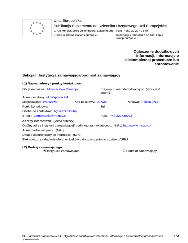 Unia Europejska Publikacja Suplementu do Dziennika Urzędowego Unii Europejskiej 2, rue Mercier, 2985 Luxembourg, Luksemburg Faks: +352 29 29 42 670 E-mail: [email protected] Informacje i formularze on-line: http:// simap.europa.eu Ogłoszenie dodatkowych informacji, informacje o niekompletnej procedurze lub sprostowanie Sekcja I: Instytucja zamawiająca/podmiot zamawiający I.1) Nazwa, adresy i punkty kontaktowe: Oficjalna nazwa: Ministerstwo Rozwoju Krajowy numer identyfikacyjny: (jeżeli jest znany) _____ Adres pocztowy: ul. Wspólna 2/4 Miejscowość: Warszawa Kod pocztowy: 00-926 Punkt kontaktowy: _____ Państwo: Polska (PL) Tel.: _____ Osoba do kontaktów: Agnieszka Dubaj E-mail: [email protected] Faks: +48 222738922 Adresy internetowe: (jeżeli dotyczy) Ogólny adres instytucji zamawiającej/ podmiotu zamawiającego: (URL) http://www.mr.gov.pl Adres profilu nabywcy: (URL) _____ Dostęp elektroniczny do informacji: (URL) _____ Elektroniczne składanie ofert i wniosków o dopuszczenie do udziału: (URL) _____ I.2) Rodzaj zamawiającego: Instytucja zamawiająca Podmiot zamawiający PL Formularz standardowy 14 - Ogłoszenie dodatkowych informacji, informacje o niekompletnej procedurze lub sprostowanie 1/4 Sekcja II: Przedmiot zamówienia II.1.1) Nazwa nadana zamówieniu: Kompleksowa organizacja konferencji Bezpieczeństwo w ruchu drogowym/Road Safety w dniach 28-29 września 2016 roku w Warszawie II.1.2) Krótki opis zamówienia lub zakupu: (podano w pierwotnym ogłoszeniu) Przedmiotem zamówienia jest kompleksowa organizacja konferencji Bezpieczeństwo w ruchu drogowym/Road Safety w dniach 28-29 września 2016 roku w Warszawie. Szczegółowy Opis Przedmiotu Zamówienia (SOPZ) zawarty jest w Załączniku Nr 1 do SIWZ II.1.3) Wspólny Słownik Zamówień (CPV) Główny przedmiot Dodatkowe przedmioty Słownik główny 79952000 55120000 55300000 79342200 79540000 Słownik uzupełniający (jeżeli dotyczy) PL Formularz standardowy 14 - Ogłoszenie dodatkowych informacji, informacje o niekompletnej procedurze lub sprostowanie 2/4 Sekcja IV: Procedura IV.1)Rodzaj procedury (podano w pierwotnym ogłoszeniu) Otwarta Ograniczona Ograniczona przyspieszona Negocjacyjna Negocjacyjna przyspieszona Dialog konkurencyjny Negocjacyjna z uprzednim ogłoszeniem Negocjacyjna bez uprzedniego ogłoszenia Negocjacyjna z publikacją ogłoszenia o zamówieniu Negocjacyjna bez publikacji ogłoszenia o zamówieniu Udzielenie zamówienia bez uprzedniej publikacji ogłoszenia o zamówieniu w Dzienniku Urzędowym Unii Europejskiej IV.2)Informacje administracyjne IV.2.1)Numer referencyjny: (podano w pierwotnym ogłoszeniu) BDG.V.2511.24.2016.AD IV.2.2)Dane referencyjne ogłoszenia w przypadku ogłoszeń przesłanych drogą elektroniczną: Pierwotne ogłoszenie przesłane przez eNotices TED eSender Login: ENOTICES_nesta Dane referencyjne ogłoszenia: 2016-046260 rok i numer dokumentu IV.2.3)Ogłoszenie, którego dotyczy niniejsza publikacja: Numer ogłoszenia w Dz.U.: 2016/S 073-127756 z dnia: 14/04/2016 (dd/mm/rrrr) IV.2.4)Data wysłania pierwotnego ogłoszenia: 12/04/2016 (dd/mm/rrrr) PL Formularz standardowy 14 - Ogłoszenie dodatkowych informacji, informacje o niekompletnej procedurze lub sprostowanie 3/4 Sekcja VI: Informacje uzupełniające VI.1) Ogłoszenie dotyczy: Procedury niepełnej Sprostowania Informacji dodatkowych VI.2) Informacje na temat niepełnej procedury udzielenia zamówienia: Postępowanie o udzielenie zamówienia zostało przerwane Postępowanie o udzielenie zamówienia uznano za nieskuteczne Zamówienia nie udzielono Zamówienie może być przedmiotem ponownej publikacji VI.3) Informacje do poprawienia lub dodania : VI.3.1) Zmiana oryginalnej informacji podanej przez instytucję zamawiającą Publikacja w witrynie TED niezgodna z oryginalną informacją, przekazaną przez instytucję zamawiającą Oba przypadki VI.3.2) W ogłoszeniu pierwotnym W odpowiedniej dokumentacji przetargowej (więcej informacji w odpowiedniej dokumentacji przetargowej) W obu przypadkach (więcej informacji w odpowiedniej dokumentacji przetargowej) VI.3.3) Tekst, który należy poprawić w pierwotnym ogłoszeniu Miejsce, w którym znajduje się Zamiast: zmieniany tekst: VI.3.4) Daty, które należy poprawić w pierwotnym ogłoszeniu Miejsce, w którym znajdują się Zamiast: zmieniane daty: 02/06/2016 Godzina: 10:00 Sekcja IV.3.4 Termin składania ofert (dd/mm/rrrr) lub wniosków o dopuszczenie do udziału w postępowaniu Miejsce, w którym znajdują się Zamiast: zmieniane daty: 02/06/2016 Godzina: 11:00 Sekcja IV.3.8 Warunki otwarcia ofert (dd/mm/rrrr) Powinno być: Powinno być: 10/06/2016 Godzina: 10:00 (dd/mm/rrrr) Powinno być: 10/06/2016 Godzina: 11:00 (dd/mm/rrrr) VI.3.5) Adresy i punkty kontaktowe, które należy poprawić VI.3.6) Tekst, który należy dodać do pierwotnego ogłoszenia Miejsce, w którym należy dodać tekst: Tekst do dodania: VI.4) Inne dodatkowe informacje: _____ VI.5) Data wysłania niniejszego ogłoszenia: PL Formularz standardowy 14 - Ogłoszenie dodatkowych informacji, informacje o niekompletnej procedurze lub sprostowanie 4/4