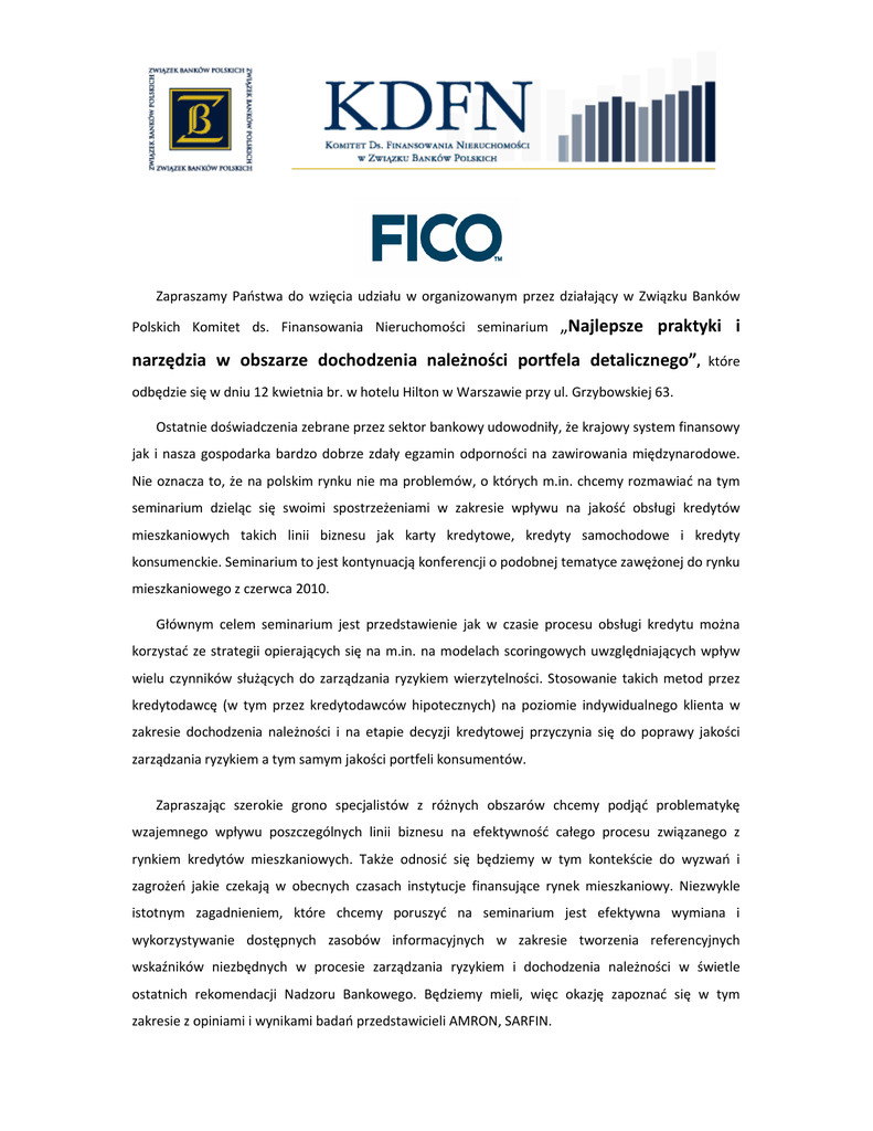 Zapraszamy Państwa do wzięcia udziału w organizowanym przez działający w Związku Banków Polskich Komitet ds. Finansowania Nieruchomości seminarium „Najlepsze praktyki i narzędzia w obszarze dochodzenia należności portfela detalicznego”, które odbędzie się w dniu 12 kwietnia br. w hotelu Hilton w Warszawie przy ul. Grzybowskiej 63. Ostatnie doświadczenia zebrane przez sektor bankowy udowodniły, że krajowy system finansowy jak i nasza gospodarka bardzo dobrze zdały egzamin odporności na zawirowania międzynarodowe. Nie oznacza to, że na polskim rynku nie ma problemów, o których m.in. chcemy rozmawiać na tym seminarium dzieląc się swoimi spostrzeżeniami w zakresie wpływu na jakość obsługi kredytów mieszkaniowych takich linii biznesu jak karty kredytowe, kredyty samochodowe i kredyty konsumenckie. Seminarium to jest kontynuacją konferencji o podobnej tematyce zawężonej do rynku mieszkaniowego z czerwca 2010. Głównym celem seminarium jest przedstawienie jak w czasie procesu obsługi kredytu można korzystać ze strategii opierających się na m.in. na modelach scoringowych uwzględniających wpływ wielu czynników służących do zarządzania ryzykiem wierzytelności. Stosowanie takich metod przez kredytodawcę (w tym przez kredytodawców hipotecznych) na poziomie indywidualnego klienta w zakresie dochodzenia należności i na etapie decyzji kredytowej przyczynia się do poprawy jakości zarządzania ryzykiem a tym samym jakości portfeli konsumentów. Zapraszając szerokie grono specjalistów z różnych obszarów chcemy podjąć problematykę wzajemnego wpływu poszczególnych linii biznesu na efektywność całego procesu związanego z rynkiem kredytów mieszkaniowych. Także odnosić się będziemy w tym kontekście do wyzwań i zagrożeń jakie czekają w obecnych czasach instytucje finansujące rynek mieszkaniowy. Niezwykle istotnym zagadnieniem, które chcemy poruszyć na seminarium jest efektywna wymiana i wykorzystywanie dostępnych zasobów informacyjnych w zakresie tworzenia referencyjnych wskaźników niezbędnych w procesie zarządzania ryzykiem i dochodzenia należności w świetle ostatnich rekomendacji Nadzoru Bankowego. Będziemy mieli, więc okazję zapoznać się w tym zakresie z opiniami i wynikami badań przedstawicieli AMRON, SARFIN. W seminarium udział wezmą oprócz przedstawicieli kadry zarządzającej sektora bankowego także zaproszeni przedstawiciele zagranicznej firmy scoringowej FICO, wiodącego dostawcy analiz i technologii zarządzania decyzją. Ponadto poruszać będziemy sprawy związane ze stosowaniem nowych narzędzi do efektywnej oceny ryzyka, optymalizacji decyzji związanych z zarządzaniem portfelami kredytów hipotecznych ze szczególnym uwzględnieniem rozwiązań dotyczących działań zapobiegającym powstawaniu opóźnień w spłacie należności oraz działań anty-fraudowych. Biorąc pod uwagę ostatnio przygotowane regulacje i wytyczne nadzoru finansowego wyraźnie nakładające na banki obowiązek stosowania coraz bardziej rygorystycznych kryteriów oraz wyrafinowanych technik oceny ryzyka, mamy nadzieję, że będą chcieli Państwo uczestniczyć w tym seminarium. Zachęcając do udziału prosimy o skierowanie zaproszenia głównie do zarządzających departamentami ryzyka, odpowiedzialnych za portfele bankowości detalicznej oraz zajmujących się monitoringiem i dochodzeniem należności.