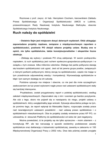 Rozmowa z prof. zwycz. dr hab. Henrykiem Ciochem, kierownikiem Zakładu Prawa Spółdzielczego i Organizacji Spółdzielczości UMCS w Lublinie, przewodniczącym Rady Naukowej Instytutu Naukowego Stefczyka, obecnie Spółdzielczego Instytutu Naukowego. Ruch należy do spółdzielni - Ostatnio Sejm jest miejscem dosyć dziwnych wydarzeń. Otóż ubiegając zapowiadane projekty rządowe, związane z międzyresortowym raportem o spółdzielczości, posłowie PO złożyli własne projekty ustaw. Budzą one w opinii, nie tylko spółdzielców, także konstytucjonalistów i ekspertów liczne obiekcje. - Zbliżają się wybory i posłowie PO chcą zabłysnąć. W swoim podręczniku napisałem, iż ruch spółdzielczy jest ruchem społeczno-gospodarczo-politycznym i w związku z tym zrzesza kilka milionów członków. Dlatego też partie polityczne starają się kosztem spółdzielczości coś ugrać. Jest od lat pewna grupa posłów, związanych z różnymi partiami politycznymi, którzy żerują na spółdzielczości, często nie mając w tym przedmiocie odpowiedniej wiedzy i kompetencji. Wprowadzają spółdzielców w błąd i tym samym działają na ich szkodę. Podobna sytuacja ma miejsce i obecnie, co nie jest dla mnie szczególnym zaskoczeniem że tuż przed wyborami nagle prace nad ustawami spółdzielczymi stały się bardziej intensywne. Przykładowo, został przygotowany raport o polskiej spółdzielczości, według założeń międzyresortowych. Zapoznałem się z nim i oceniam go bardzo pozytywnie. Ale cóż z tego, skoro nie pojawił się w nawiązaniu do niego, projekt ustawy o spółdzielniach, który uwzględniałby jego wnioski. Sytuacja absurdalna polega na tym, że pomimo tego, że raport wpłynął do Marszałka Sejmu, rozpoczęte zostały prace nad newralgicznymi ustawami poselskimi - nad ustawą prawo spółdzielcze i o spółdzielniach mieszkaniowych. Oba te projekty zostały wniesione przez KP PO, co udowadnia, iż stosunek Platformy do spółdzielczości od wielu lat jest negatywny. Można powiedzieć, iż te projekty są nie tylko sprzeczne – moim zdaniem – z konstytucją RP, ale też naruszają w sposób ewidentny podstawowe zasady spółdzielcze oraz deklarację o tożsamości spółdzielczej, zawartą w zaleceniu nr 193 Międzynarodowej Organizacji Pracy z 2002 roku. Dwa lata później zostało przyjęte 1 rozporządzenie Rady Wspólnot Europejskich w sprawie statutu spółdzielni europejskiej. - Jak Pan profesor ocenia te regulacje? - Teraz, gdyby te dwa projekty zostały uchwalone przez Sejm obecnej kadencji, to moim zdaniem byłyby to najgorsze regulacje, w zakresie spółdzielczości po 1920 roku. Nie chcę tu mówić, że byłyby one gorsze od tych, które obowiązywały w latach 50. Nie wspominam tu o ustawie o spółdzielniach i ich związkach z 1961 roku, która pod względem legislacyjnym była ustawą bardzo poprawną. Natomiast wiemy, w jakim okresie była wtedy Polska i spółdzielczość. Trzeba też powiedzieć, że dzięki tej ustawie Polska odzyskała członkostwo w Międzynarodowym Związku Spółdzielczym. Czyli, że zasady MZS były w sposób normatywny prawidłowo ujęte. Natomiast, kiedy idzie o praktykę to już jest zupełnie inna kwestia. Mnie szczególnie zaniepokoiło, iż w ostatnim okresie nastąpiła de facto kolejna nowelizacja prawa spółdzielczego z 1982 roku, w zakresie możliwości przekształcenia spółdzielni pracy, w spółki handlowe. Jestem tym zaniepokojony, ponieważ za tą nowelizacją głosowało aż 415 na 417 obecnych posłów. Oznacza to, że stosunek Sejmu bez względu na to, jakie opcje polityczne posłowie reprezentują, do spółdzielczości jest negatywny. Świadczy o tym wynik głosowania. - W ostatnim czasie władze Międzynarodowego Związku Spółdzielczego zwracają uwagę na szczególnie niebezpieczny proces, jakim jest uspółkowienie spółdzielni. - Ten proces ma miejsce nie tylko w Polsce, ale i w innych krajach. Temu zjawisku międzynarodowe władze spółdzielcze starają się zapobiec. To samo dotyczy MOP. Chodzi o to, że inna jest filozofia spółdzielni, aniżeli spółek. Spółdzielnie służą do zaspokajania potrzeb, natomiast spółki do osiągania i maksymalizacji zysków. Są to dwie formy organizacyjne, które powinny obok siebie paralelnie funkcjonować. Natomiast nie może być takiej sytuacji, żeby spółdzielnie były marginalizowane. A takie zjawisko daje się wyraźnie zaobserwować. Drugim, bardzo niebezpiecznym zjawiskiem, które dotyczy obu ustaw, jest wprowadzanie modelu nadzoru państwowego, bez względu na typ i rodzaj spółdzielni. Jest to tzw. nadzór podmiotowy. Krótko mówiąc, każda spółdzielnia, bez względu na jej przedmiot działalności, gdyby te ustawy weszły w życie, objęta zostanie nadzorem państwa. Natomiast, gdy idzie o nadzór państwa nad spółkami, działającymi w formie banków, firm ubezpieczeniowych czy spółek notowanych na 2 giełdzie, to ma on charakter przedmiotowy. Czyli decyduje o tym przedmiot, a nie forma działalności. Dlatego w ustawie jest pomieszanie i pomylenie pewnej filozofii i świadczy o negatywnym stosunku państwa do spółdzielczości. Od lat znajduje się ona w bardzo niekorzystnym położeniu prawnym i podatkowym. - Z okazji 20. lecia ustawy z roku 1990, którą określa się terminem „zamachu na spółdzielczość”, spółdzielcy przyrzekli, że nie dopuszczą do manipulowania, wywłaszczania czy też przekształcania spółdzielni w inne formy prawne. - Na przyrzeczeniach się skończyło, ponieważ dziś mamy sytuację bardzo zbliżoną do tej, jaka istniała. Wyrażam się delikatnie, chociaż zapoznałem się z opiniami osób, które zajmują się prawem spółdzielczym, zarówno w odniesieniu do ustawy o spółdzielniach mieszkaniowych, jak i ustawy prawo spółdzielcze i w obu przypadkach te opinie są druzgoczące dla autorów projektów PO. Ostatnio odbyło się posiedzenia Krajowej Rady Spółdzielczej. At