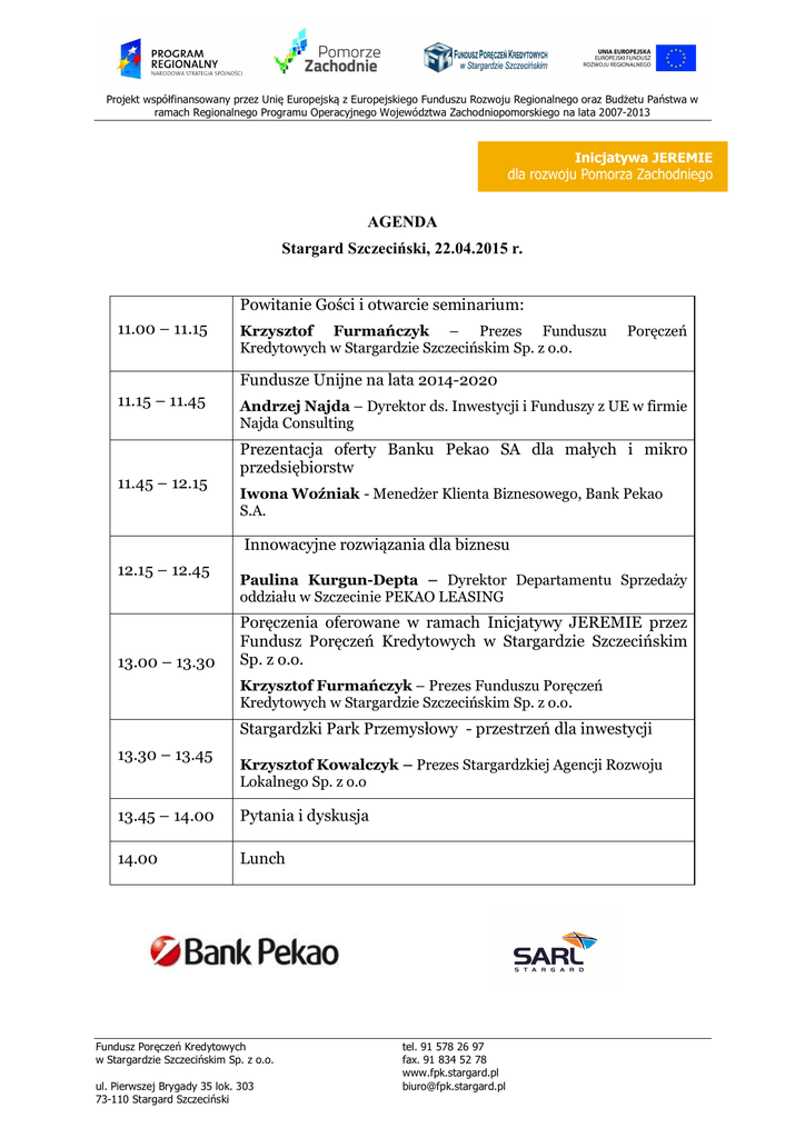 Projekt współfinansowany przez Unię Europejską z Europejskiego Funduszu Rozwoju Regionalnego oraz Budżetu Państwa w ramach Regionalnego Programu Operacyjnego Województwa Zachodniopomorskiego na lata 2007-2013 AGENDA Stargard Szczeciński, 22.04.2015 r. Powitanie Gości i otwarcie seminarium: 11.00 – 11.15 Krzysztof Furmańczyk – Prezes Funduszu Kredytowych w Stargardzie Szczecińskim Sp. z o.o. Poręczeń Fundusze Unijne na lata 2014-2020 11.15 – 11.45 11.45 – 12.15 Andrzej Najda – Dyrektor ds. Inwestycji i Funduszy z UE w firmie Najda Consulting Prezentacja oferty Banku Pekao SA dla małych i mikro przedsiębiorstw Iwona Woźniak - Menedżer Klienta Biznesowego, Bank Pekao S.A. Innowacyjne rozwiązania dla biznesu 12.15 – 12.45 13.00 – 13.30 Paulina Kurgun-Depta – Dyrektor Departamentu Sprzedaży oddziału w Szczecinie PEKAO LEASING Poręczenia oferowane w ramach Inicjatywy JEREMIE przez Fundusz Poręczeń Kredytowych w Stargardzie Szczecińskim Sp. z o.o. Krzysztof Furmańczyk – Prezes Funduszu Poręczeń Kredytowych w Stargardzie Szczecińskim Sp. z o.o. Stargardzki Park Przemysłowy - przestrzeń dla inwestycji 13.30 – 13.45 Krzysztof Kowalczyk – Prezes Stargardzkiej Agencji Rozwoju Lokalnego Sp. z o.o 13.45 – 14.00 Pytania i dyskusja 14.00 Lunch Fundusz Poręczeń Kredytowych w Stargardzie Szczecińskim Sp. z o.o. ul. Pierwszej Brygady 35 lok. 303 73-110 Stargard Szczeciński tel. 91 578 26 97 fax. 91 834 52 78 www.fpk.stargard.pl [email protected]