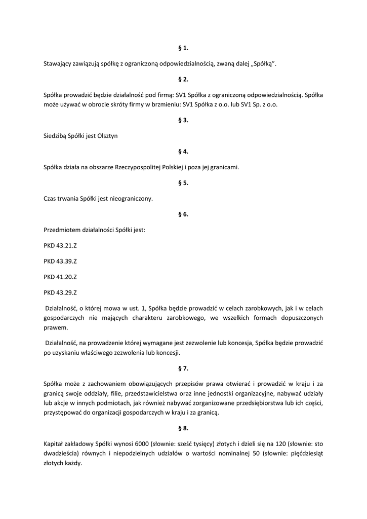 § 1. Stawający zawiązują spółkę z ograniczoną odpowiedzialnością, zwaną dalej „Spółką”. § 2. Spółka prowadzić będzie działalność pod firmą: SV1 Spółka z ograniczoną odpowiedzialnością. Spółka może używać w obrocie skróty firmy w brzmieniu: SV1 Spółka z o.o. lub SV1 Sp. z o.o. § 3. Siedzibą Spółki jest Olsztyn § 4. Spółka działa na obszarze Rzeczypospolitej Polskiej i poza jej granicami. § 5. Czas trwania Spółki jest nieograniczony. § 6. Przedmiotem działalności Spółki jest: PKD 43.21.Z PKD 43.39.Z PKD 41.20.Z PKD 43.29.Z Działalność, o której mowa w ust. 1, Spółka będzie prowadzić w celach zarobkowych, jak i w celach gospodarczych nie mających charakteru zarobkowego, we wszelkich formach dopuszczonych prawem. Działalność, na prowadzenie której wymagane jest zezwolenie lub koncesja, Spółka będzie prowadzić po uzyskaniu właściwego zezwolenia lub koncesji. § 7. Spółka może z zachowaniem obowiązujących przepisów prawa otwierać i prowadzić w kraju i za granicą swoje oddziały, filie, przedstawicielstwa oraz inne jednostki organizacyjne, nabywać udziały lub akcje w innych podmiotach, jak również nabywać zorganizowane przedsiębiorstwa lub ich części, przystępować do organizacji gospodarczych w kraju i za granicą. § 8. Kapitał zakładowy Spółki wynosi 6000 (słownie: sześć tysięcy) złotych i dzieli się na 120 (słownie: sto dwadzieścia) równych i niepodzielnych udziałów o wartości nominalnej 50 (słownie: pięćdziesiąt złotych każdy. Każdy Wspólnik może mieć więcej niż jeden udział. § 9. Udziały w kapitale zakładowym Spółki przysługują następującym osobom: a) b) spółce pod firmą Crowdfunding Spółka z ograniczoną odpowiedzialnością z siedzibą w Olsztynie, która posiada 12 (słownie: dwanaście) udziałów po 50 złotych każdy, o łącznej wartości nominalnej 600 (słownie: sześćset) złotych. Pani/Panu ……………………., która/y posiada …………….. (słownie: ……………..) udziałów po ……………….. złotych każdy, o łącznej wartości nominalnej ………………… (słownie: ………….. tysięcy) złotych. Udziały, o których mowa w ust. 1 zostają pokryte wkładem pieniężnym. § 10. Kapitał zakładowy Spółki może zostać podwyższony przez podwyższenie wartości nominalnej udziałów istniejących lub drogą utworzenia nowych udziałów przez Zgromadzenie Wspólników. Podwyższenie kapitału zakładowego do kwoty 50.000 (słownie: pięćdziesięciu tysiecy) złotych w terminie 1 roku (słownie: jednego roku) od dnia rejestracji Spółki nie stanowi zmiany umowy Spółki. Prawo pierwszeństwa do objęcia nowo utworzonych udziałów przysługuje Wspólnikom w stosunku do ich dotychczasowych udziałów w kapitale zakładowym Spółki. Udziały, o które kapitał zakładowy zostanie podwyższony mogą być pokryte gotówką lub wkładem niepieniężnym, jeżeli Zgromadzenie Wspólników wyrazi na taki wkład zgodę. § 11. Wspólnicy mogą być zobowiązani do dopłat w stosunku do udziałów, do łącznej wysokości ………………………………. (słownie: …………………..) złotych. Wysokość i terminy dopłat oznaczone będą w miarę potrzeby w drodze uchwały Wspólników podjętej jednomyślnie. § 12. Zastawienie, dzierżawa, ustanowienie użytkowania udziałów, albo chociażby niektórych tylko praw płynących z posiadanych udziałów, wymaga zezwolenia Zgromadzenia Wspólników. § 13. Udziały mogą być zbywane zgodnie z zasadami określonymi poniżej, przy czym zbycie udziału na rzecz osoby trzeciej, innej niż dotychczasowy Wspólnik, wymaga zezwolenia pozostałych Wspólników. Wspólnikom przysługuje prawo pierwszeństwa nabycia udziałów oferowanych do zbycia przez któregokolwiek ze Wspólników („Wspólnik Zbywający”), po cenie i na warunkach uzyskanych od osoby zamierzającej nabyć takie udziały („Nabywca”) działającej w dobrej wierze. Prawo pierwszeństwa przysługuje jedynie Wspólnikowi zamierzającemu nabyć cały pakiet zbywanych udziałów. W przypadku zgłoszenia zamiaru skorzystania z prawa pierwszeństwa przez kilku Wspólników jednocześnie, mogą oni wykonywać prawo pierwszeństwa stosownie do wzajemnego stosunku ich udziałów w kapitale zakładowym Spółki. Wspólnik Zbywający zobowiązany jest zawiadomić o zamiarze zbycia udziałów wszystkich Wspólników, którym stosownie do postanowień ust. 3 przysługuje prawo pierwszeństwa. Wspólnik Zbywający dokonuje alokacji sprzedawanych udziałów pomiędzy Wspólników, którzy zgłosili zamiar skorzystania z prawa pierwszeństwa, stosownie do postanowienia ust. 3. Wspólnik Zbywający zaokrągla w miarę potrzeby liczbę udziałów przypadających poszczególnym Wspólnikom tak, aby ta liczba udziałów wyrażona była liczbą całkowitą, która pozwoli na jak najpełniejszą realizację postanowień ust. 3. Prawo pierwszeństwa wygasa, jeżeli zgłoszenie o wykonaniu prawa pierwszeństwa nie zostanie doręczone Wspólnikowi Zbywającemu w terminie 30 (słownie: trzydzieści) dni od daty zawiadomienia o zamiarze zbycia udziałów. Przy wykonywaniu prawa pierwszeństwa płatność i przejście nabytych w ten sposób udziałów nastąpi w ciągu 30 (słownie: trzydzieści) dni po upływie terminu, o którym mowa w ust. 5. Jeżeli przed upływem terminu określonego w ust. 5 Wspólnicy nie skorzystają z przysługującego im prawa pierwszeństwa względem zbywanych udziałów, lub nie dokonają płatności zgodnie z postanowieniem ust. 6, Wspólnik Zbywający będzie mógł zaoferować i zbyć udziały Nabywcy w terminie 120 (słownie: sto dwadzieścia) dni od upływu terminu określonego odpowiednio w ust. 5 i 6, na warunkach i za cenę podaną w zawiadomieniu, o którym mowa w ust. 4. Sprzedaż udziałów po upływie 120 dni lub na innych warunkach, niż określone w zawiadomieniu, jest niedoz