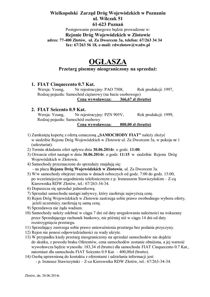 Wielkopolski Zarząd Dróg Wojewódzkich w Poznaniu ul. Wilczak 51 61-623 Poznań Postępowanie przetargowe będzie prowadzone w: Rejonie Dróg Wojewódzkich w Złotowie adres: 77-400 Złotów, ul. Za Dworcem 3a, telefon: 67/263 34 34 fax: 67/263 56 18, e-mail: [email protected] OGŁASZA Przetarg pisemny nieograniczony na sprzedaż: 1. FIAT Cinquecento 0.7 Kat. Wersja: Young, Nr rejestracyjny: PAO 7508, Rok produkcji: 1997, Rodzaj pojazdu: Samochód ciężarowy (na bazie osobowego) Cena wywoławcza: 366,67 zł (brutto) 2. FIAT Seicento 0.9 Kat. Wersja: Young, Nr rejestracyjny: PZN 905V, Rok produkcji: 1999, Rodzaj pojazdu: Samochód osobowy Cena wywoławcza: 800,00 zł (brutto) 1) Zamkniętą kopertę z ofertą oznaczoną „SAMOCHODY FIAT” należy złożyć w siedzibie Rejonu Dróg Wojewódzkich w Złotowie ul. Za Dworcem 3a, w pokoju nr 1 (sekretariat). 2) Termin składania ofert upływa dnia 30.06.2014r. o godz. 11:00. 3) Otwarcie ofert nastąpi w dniu 30.06.2014r. o godz. 11:15 w siedzibie Rejonu Dróg Wojewódzkich w Złotowie. 4) Samochody przeznaczone do sprzedaży znajdują się: - na placu Rejonu Dróg Wojewódzkich w Złotowie, ul. Za Dworcem 3a. 5) W/w samochody obejrzeć można w dniach roboczych od godz. 7:00 do godz. 15:00, po wcześniejszym uzgodnieniu telefonicznym z p. Ireneuszem Stawiszyńskim – Z-cą Kierownika RDW Złotów, tel.: 67/263-34-34. 6) Dopuszcza się sprzedaż jednostkową. 7) Sprzedaż samochodu nastąpi nabywcy, który zaoferuje najwyższą cenę. 8) Rejon Dróg Wojewódzkich w Złotowie zastrzega sobie prawo swobodnego wyboru oferty, jeżeli uczestnicy zaoferują tę samą cenę. 9) Sprzedawca nie żąda wadium. 10) Samochody należy odebrać w ciągu 7 dni od daty uregulowaniu należności na wskazany przez Sprzedającego rachunek bankowy, nie później niż w ciągu 14 dni od daty rozstrzygnięcia przetargu. 11) Sprzedający zastrzega sobie prawo unieważnienia przetargu bez podania przyczyny. 12) Rejon nie ponosi odpowiedzialności za wady ukryte. 13) W przypadku kiedy przetarg nieograniczony na sprzedaż samochodów nie dojdzie do skutku, z powodu braku Oferentów, cena samochodów zostanie obniżona, a jej wartość wywoławcza będzie wynosiła: 183,34 zł (brutto) dla samochodu FIAT Cinquecento 0.7 Kat., natomiast dla samochodu FIAT Seicento 0.9 Kat. – 400,00zł (brutto). 14) Osobą uprawnioną do kontaktu z oferentami i udzielania informacji jest: - p. Ireneusz Stawiszyński – Z-ca Kierownika RDW Złotów, tel.: 67/263-34-34. Złotów, dn. 20.06.2014r.