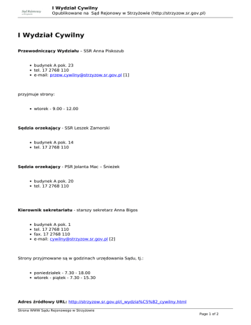 I Wydział Cywilny Opublikowane na Sąd Rejonowy w Strzyżowie (http://strzyzow.sr.gov.pl) I Wydział Cywilny Przewodniczący Wydziału – SSR Anna Piskozub budynek A pok. 23 tel. 17 2768 110 e-mail: [email protected] [1] przyjmuje strony: wtorek - 9.00 - 12.00 Sędzia orzekający - SSR Leszek Zamorski budynek A pok. 14 tel. 17 2768 110 Sędzia orzekający - PSR Jolanta Mac – Śnieżek budynek A pok. 20 tel. 17 2768 110 Kierownik sekretariatu - starszy sekretarz Anna Bigos budynek A pok. 1 tel. 17 2768 110 fax. 17 2768 110 e-mail: [email protected] [2] Strony przyjmowane są w godzinach urzędowania Sądu, tj.: poniedziałek - 7.30 - 18.00 wtorek - piątek - 7.30 - 15.30 Adres źródłowy URL: http://strzyzow.sr.gov.pl/i_wydzia%C5%82_cywilny.html Strona WWW Sądu Rejonowego w Strzyżowie Page 1 of 2 I Wydział Cywilny Opublikowane na Sąd Rejonowy w Strzyżowie (http://strzyzow.sr.gov.pl) Linki na stronie: [1] mailto:[email protected] [2] mailto:[email protected] Strona WWW Sądu Rejonowego w Strzyżowie Page 2 of 2