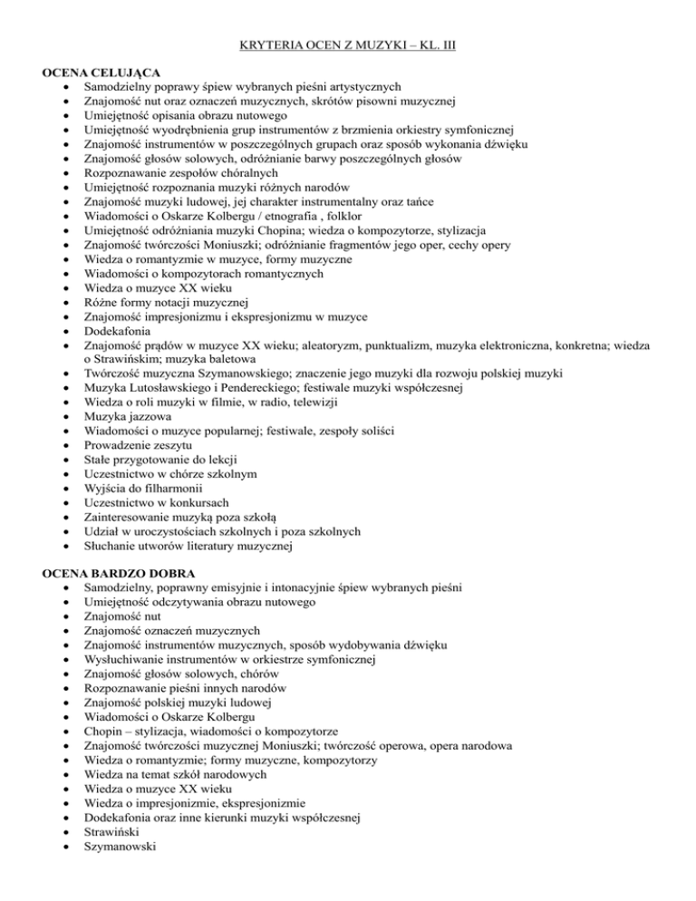 KRYTERIA OCEN Z MUZYKI – KL. III OCENA