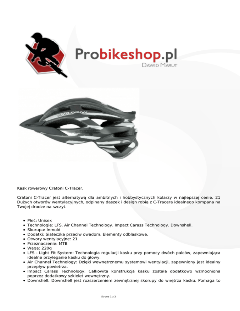 Kask rowerowy Cratoni C-Tracer. Cratoni C-Tracer jest alternatywą dla ambitnych i hobbystycznych kolarzy w najlepszej cenie. 21 Dużych otworów wentylacyjnych, odpinany daszek i design robią z C-Tracera idealnego kompana na Twojej drodze na szczyt. Płeć: Unisex Technologie: LFS. Air Channel Technology. Impact Carass Technology. Downshell. Skorupa: Inmold Dodatki: Siateczka przeciw owadom. Elementy odblaskowe. Otwory wentylacyjne: 21 Przeznaczenie: MTB Waga: 220g LFS - Light Fit System: Technologia regulacji kasku przy pomocy dwóch palców, zapewniająca idealne przyleganie kasku do głowy. Air Channel Technology: Dzięki wewnętrznemu systemowi wentylacji, zapewniony jest idealny przepływ powietrza. Impact Carass Technology: Całkowita konstrukcja kasku została dodatkowo wzmocniona poprzez dodatkowy szkielet wewnętrzny. Downshell: Downshell jest rozszerzeniem zewnętrznej skorupy do wnętrza kasku. Pomaga to Strona 1 z 2 przedłużyć żywotność kasku. Gwarancja: 24 miesiące Strona 2 z 2