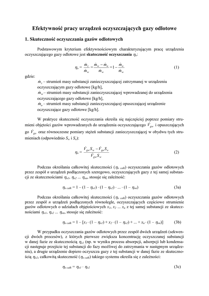 Efektywność pracy urządzeń oczyszczających gazy odlotowe 1. Skuteczność oczyszczania gazów odlotowych Podstawowym kryterium efektywnościowym charakteryzującym pracę urządzenia oczyszczającego gazy odlotowe jest skuteczność oczyszczania o: o = m m z m w m o = =1 o m w m w m w (1) gdzie: m z – strumień masy substancji zanieczyszczającej zatrzymanej w urządzeniu oczyszczającym gazy odlotowe [kg/h], m w – strumień masy substancji zanieczyszczającej wprowadzanej do urządzenia oczyszczającego gazy odlotowe [kg/h], o – strumień masy substancji zanieczyszczającej opuszczającej urządzenie m oczyszczające gazy odlotowe [kg/h]. W praktyce skuteczność oczyszczania określa się najczęściej poprzez pomiary strumieni objętości gazów wprowadzanych do urządzenia oczyszczającego Vgw i opuszczających go V oraz równoczesne pomiary stężeń substancji zanieczyszczającej w obydwu tych strugo mieniach (odpowiednio Sw i So): Vgw S w Vgo S o o = Vgw S w (2) Podczas określania całkowitej skuteczności (o całk) oczyszczania gazów odlotowych przez zespół n urządzeń podłączonych szeregowo, oczyszczających gazy z tej samej substancji ze skutecznościami o1, o2 ... on, stosuje się zależność: o całk = 1 – (1 – o1) (1 – o2) ... (1 – on) (3a) Podczas określania całkowitej skuteczności (o całk) oczyszczania gazów odlotowych przez zespół n urządzeń podłączonych równolegle, oczyszczających częściowe strumienie gazów odlotowych o udziałach objętościowych x1, x2 ... xn z tej samej substancji ze skutecznościami o1, o2 ... on, stosuje się zależność: o całk = 1 – [x1 (1 – o1) + x2 (1 – o2) + ... + xn (1 – on)] (3b) W przypadku oczyszczania gazów odlotowych przez zespół dwóch urządzeń (sekwencji dwóch procesów), z których pierwsze zwiększa koncentrację oczyszczanej substancji w danej fazie ze skutecznością o1 (np. w wyniku procesu absorpcji, adsorpcji lub kondensacji następuje przejście tej substancji do fazy możliwej do zatrzymania w następnym urządzeniu), a drugie urządzenie dopiero oczyszcza gazy z tej substancji w danej fazie ze skutecznością o2, całkowitą skuteczność (o całk) takiego systemu określa się z zależności: o całk = o1 o2 (3c) 2 2. Dyspozycyjność urządzenia oczyszczającego gazy odlotowe Urządzenie oczyszczające gazy odlotowe w procesie użytkowania może znajdować się w stanie przestoju lub ruchu (pracy). W czasie ruchu wydzielić można dwa stany: stan pracy efektywnej i stan pracy jałowej (bieg „luzem”). W ocenie efektywności eksploatacji uwzględnia się tylko rzeczywisty (efektywny) czas użytkowania urządzenia trz oraz wymagany (planowany) czas jego eksploatacji TT [h], który powinien odpowiadać czasowi użytkowania obiektu technologicznego (źródła emisji), z którym współpracuje (którego gazy odlotowe oczyszcza). Wiąże się to z tzw. dyspozycyjnością urządzenia oczyszczającego gazy odlotowe. Współczynnik dyspozycyjności Kd oblicza się z zależności: Kd = t rz t = rz TT t rz t w (4) gdzie: tw – czas wyłączeń urządzenia z ruchu [h]: tw = td + ton + to + tk (5) td – czas wykrycia uszkodzenia (diagnostyki) [h], ton – czas obsługi i naprawy [h], to – czas oczekiwania na dostawę części zamiennych (oczekiwania w obsłudze) [h], tk – czas kontroli po naprawie [h]. 3. Miara efektywności eksploatacji urządzenia oczyszczającego gazy odlotowe Efektywność eksploatacji urządzeń stosowanych do oczyszczania gazów odlotowych w wymaganym (teoretycznym) czasie określa wskaźnik efektywności eksploatacji Eeks: Eeks = i n i n i 1 i 1 Eeksp =100 oi K di (6) gdzie: Eeks – i-ty wskaźnik efektywności eksploatacji w czasie trz i, oi – i-ta skuteczność oczyszczania gazów odlotowych w czasie trz i, Kdi – i-ty współczynnik dyspozycyjności (czasu eksploatacji) urządzenia oczyszczającego gazy odlotowe odpowiadający czasowi pracy trz i: t Kdi = rz i (7) TT TT – planowany (teoretyczny) czas pracy urządzenia, trz i – efektywny (rzeczywisty) i-ty czas eksploatacji urządzenia oczyszczającego gazy odlotowe ze skutecznością oi. Przy założeniu, że dla danego urządzenia TT = const., zależność (6) można przedstawić także w postaci: Eeks = 100 i n oi t rz i TT i 1 (8) 3 Gdy skuteczność oczyszczania gazów odlotowych o = const., zależność (6) przyjmuje postać: Eeks = 100 o Kd (9) lub: Eeks = 100 o t rz t = 100 o rz TT t rz t w (10) t Teoretyczny wskaźnik Eeksp efektywności eksploatacji urządzenia oczyszczającego gazy odlotowe odpowiada osiągnięciu przez niego teoretycznej skuteczności oczyszczania tych gazów ot przy maksymalnym współczynniku dyspozycyjności Kd max = 1: t Eeks = 100 ot Kd max (11) W praktyce często nie jest możliwa do osiągnięcia skuteczność teoretyczna ot , a jedynie skuteczność graniczna og . ot . Obliczana w takim przypadku graniczna efektywność g eksploatacyjna urządzenia oczyszczającego gazy odlotowe Eeks wynosi: g Eeks = 100 og Kd max (12) W tabeli 1 zestawiono graniczne wartości teoretycznego lub granicznego wskaźnika efektywności dla przykładowych urządzeń odpylających. 4. Wymagana efektywność i dyspozycyjność eksploatacyjna Urządzenia stosowane do oczyszczania gazów odlotowych muszą być eksploatowane w sposób gwarantujący, że ilość zanieczyszczeń E emitowanych do atmosfery w planowanym (wymaganym) czasie TT ich eksploatacji nie przekroczy emisji dopuszczalnej Ed określonej dla czasu TT. Odpowiada to osiągnięciu odpowiedniej (wymaganej) skuteczności oczyszczania w przy maksymalnej dyspozycyjności urządzenia Kd max = 1: w = 1 Ed U (13) gdzie: Ed – emisja dopuszczalna danej substancji [kg/h], U – unos danej substancji [kg/h]. Wówczas wzór na wymagany wskaźnik efektywności eksploatacji urządzenia w oczyszczającego Eeks przyjmuje postać: E w Eeks = 100 w Kd max = 100 1 d Kd max U (14) 4 Tabela 1. Orientacyjne teoretyczne i graniczne wsk