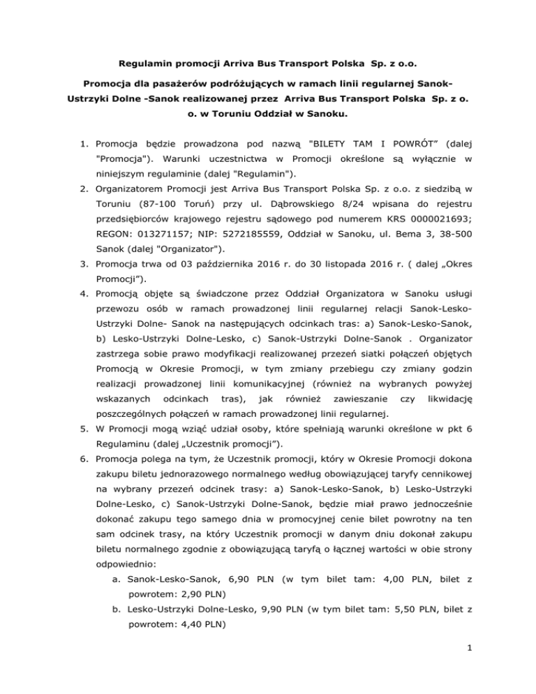Regulamin promocji Arriva Bus Transport Polska Sp. z oo Promocja