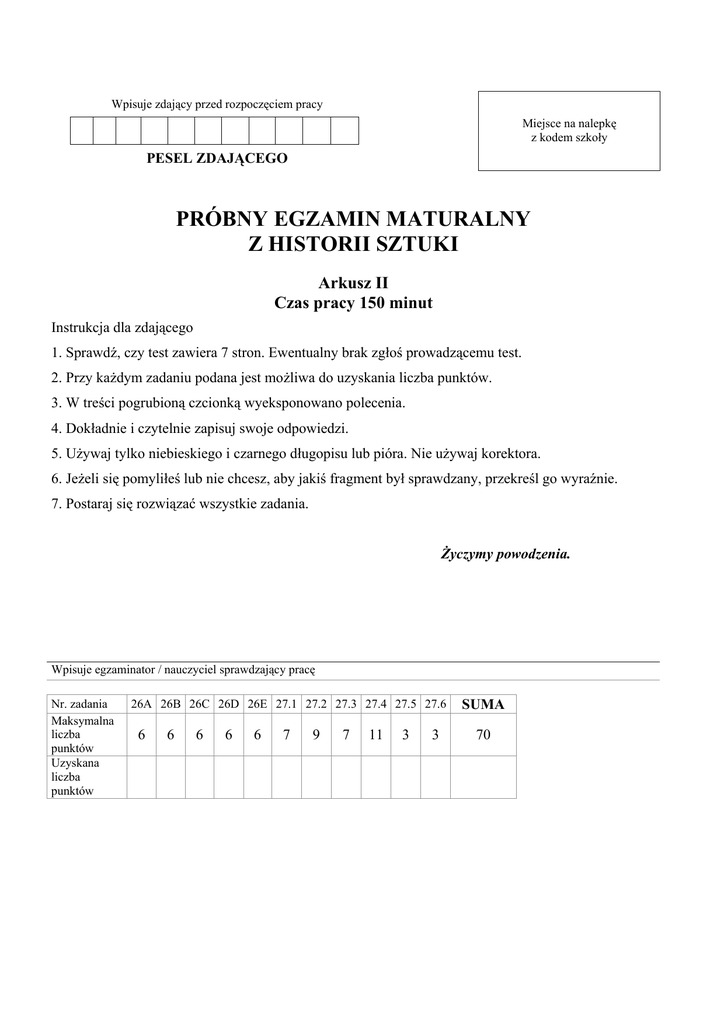 Wpisuje zdający przed rozpoczęciem pracy Miejsce na nalepkę z kodem szkoły PESEL ZDAJĄCEGO PRÓBNY EGZAMIN MATURALNY Z HISTORII SZTUKI Arkusz II Czas pracy 150 minut Instrukcja dla zdającego 1. Sprawdź, czy test zawiera 7 stron. Ewentualny brak zgłoś prowadzącemu test. 2. Przy każdym zadaniu podana jest możliwa do uzyskania liczba punktów. 3. W treści pogrubioną czcionką wyeksponowano polecenia. 4. Dokładnie i czytelnie zapisuj swoje odpowiedzi. 5. Używaj tylko niebieskiego i czarnego długopisu lub pióra. Nie używaj korektora. 6. Jeżeli się pomyliłeś lub nie chcesz, aby jakiś fragment był sprawdzany, przekreśl go wyraźnie. 7. Postaraj się rozwiązać wszystkie zadania. Życzymy powodzenia. Wpisuje egzaminator / nauczyciel sprawdzający pracę Nr. zadania Maksymalna liczba punktów Uzyskana liczba punktów 26A 26B 26C 26D 26E 27.1 27.2 27.3 27.4 27.5 27.6 6 6 6 6 6 7 9 7 11 3 3 SUMA 70 ARKUSZ II Obraz A Claude Monet, Katedra w Rouen w południe, 1894 r., olej na płótnie, 100 x 65 cm, Moskwa, Muzeum Puszkina Obraz B Vincent van Gogh, Kościół w Auvers, 1890 r., olej na płótnie, 174 x 94cm, Paryż, Muzeum D’ Orsay Strona 2 z 7 Część 1. – ANALIZA PORÓWNAWCZA (30 pkt) Zadanie 26. Przeanalizuj strukturę wizualną obrazów A i B według podanych punktów A. Kompozycja (6 pkt) Obraz A Obraz B ........................................................................ ........................................................................ ........................................................................ ........................................................................ ........................................................................ ........................................................................ ........................................................................ ........................................................................ ........................................................................ ........................................................................ ........................................................................ ........................................................................ ........................................................................ ........................................................................ ........................................................................ ........................................................................ ........................................................................ ........................................................................ ....................................................................... ....................................................................... ........................................................................ ........................................................................ B. Sposób oddania przestrzeni (6 pkt) Obraz A Obraz B ........................................................................ ........................................................................ ........................................................................ ........................................................................ ........................................................................ ........................................................................ ........................................................................ ........................................................................ ........................................................................ ........................................................................ ........................................................................ ........................................................................ ........................................................................ ........................................................................ ........................................................................ ........................................................................ ........................................................................ ........................................................................ ....................................................................... ....................................................................... ........................................................................ ........................................................................ Strona 3 z 7 C. Kolorystyka (6 pkt) Obraz A Obraz B ........................................................................ ........................................................................ ........................................................................ ........................................................................ ........................................................................ ........................................................................ ........................................................................ ........................................................................ ........................................................................ ........................................................................ ........................................................................ ........................................................................ ........................................................................ ........................................................................ ........................................................................ ........................................................................ ........................................................................ ........................................................................ ....................
