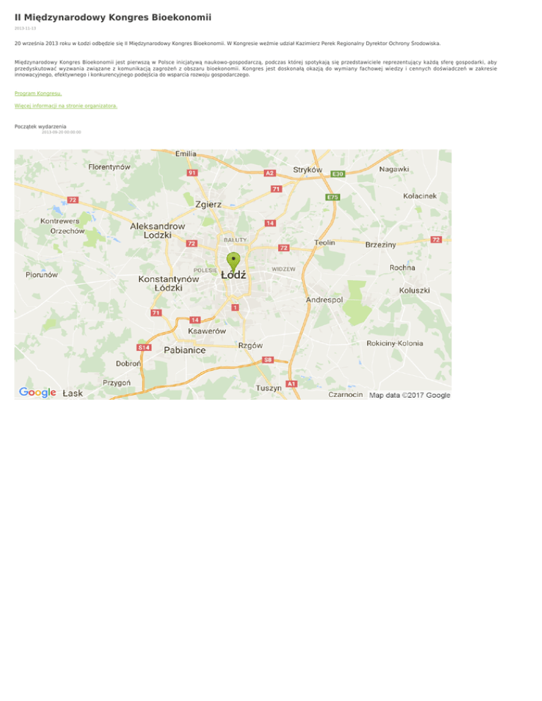 II Międzynarodowy Kongres Bioekonomii 2013-11-13 20 września 2013 roku w Łodzi odbędzie się II Międzynarodowy Kongres Bioekonomii. W Kongresie weźmie udział Kazimierz Perek Regionalny Dyrektor Ochrony Środowiska. Międzynarodowy Kongres Bioekonomii jest pierwszą w Polsce inicjatywą naukowo-gospodarczą, podczas której spotykają się przedstawiciele reprezentujący każdą sferę gospodarki, aby przedyskutować wyzwania związane z komunikacją zagrożeń z obszaru bioekonomii. Kongres jest doskonałą okazją do wymiany fachowej wiedzy i cennych doświadczeń w zakresie innowacyjnego, efektywnego i konkurencyjnego podejścia do wsparcia rozwoju gospodarczego. Program Kongresu. Więcej informacji na stronie organizatora. Początek wydarzenia 2013-09-20 00:00:00