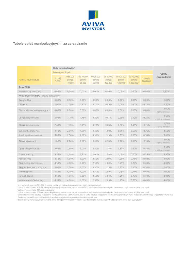 Tabela opłat manipulacyjnych i za zarządzanie Opłaty manipulacyjne6 Inwestycje w złotych Fundusz / subfundusz Opłaty za zarządzanie poniżej 5.000 od 5.000 poniżej 10.000 od 10.000 poniżej 25.000 od 25.000 poniżej 50.000 od 50.000 poniżej 100.000 od 100.000 poniżej 500.000 od 500.000 poniżej 1.000.0001 powyżej 1.000.0001 0,00% 0,00% 0,00% 0,00% 0,00% 0,00% 0,00% 0,00% 0,95%5 1,00% Aviva SFIO Aviva Oszczędnościowy Aviva Investors FIO / fundusz parasolowy Depozyt Plus 0,00% 0,00% 0,00% 0,00% 0,00% 0,00% 0,00% 0,00% Obligacji 2,00% 1,70% 1,45% 1,20% 0,85% 0,60% 0,40% 0,25% 1,75% 1,00% Dłużnych Papierów Korporacyjnych 0,00% 0,00% 0,00% 0,00% 0,00% 0,00% 0,00% 0,00% Obligacji Dynamiczny 2,00% 1,70% 1,45% 1,20% 0,85% 0,60% 0,40% 0,25% Obligacji Zamiennych 2,00% 1,70% 1,45% 1,20% 0,85% 0,60% 0,40% 0,25% Ochrony Kapitału Plus 2,50% 2,00% 1,60% 1,30% 1,00% 0,75% 0,50% 0,25% 2,50% Stabilnego Inwestowania 3,00% 2,50% 2,00% 1,50% 1,25% 0,85% 0,60% 0,30% 3,00% Aktywnej Alokacji 1,00% 0,80% 0,60% 0,40% 0,30% 0,20% 0,15% 0,10% Optymalnego Wzrostu 3,00% 2,50% 2,00% 1,50% 1,25% 0,85% 0,60% 0,30% Zrównoważony 3,50% 3,00% 2,50% 2,00% 1,50% 1,00% 0,70% 0,35% 3,50% Polskich Akcji 4,50% 4,00% 3,00% 2,50% 2,00% 1,25% 0,75% 0,40% 4,00% Akcji Europy Wschodzącej 4,50% 4,00% 3,00% 2,50% 2,00% 1,25% 0,75% 0,40% 4,00% Akcji Rynków Wschodzących 3,00% 2,50% 2,00% 1,50% 1,25% 0,85% 0,60% 0,30% 2,00% Małych Spółek 4,50% 4,00% 3,00% 2,50% 2,00% 1,25% 0,75% 0,40% 4,00% Nowych Spółek 4,50% 4,00% 3,00% 2,50% 2,00% 1,25% 0,75% 0,40% 4,00% Nowoczesnych Technologii 4,50% 4,00% 3,00% 2,50% 2,00% 1,25% 0,75% 0,40% 4,00% + opłata zmienna2 1,50% + opłata zmienna2 1,75% + opłata zmienna4 2,00% + opłata zmienna3 2,50% + opłata zmienna3 przy wpłatach powyżej 500.000 zł istnieje możliwość całkowitego zwolnienia z opłat manipulacyjnych opłata zmienna: maks. 10% od nadwyżki pomiędzy roczną stopą zwrotu subfunduszu a stopą zwrotu Indeksu Rynku Pieniężnego, rozliczanej w cyklach rocznych opłata zmienna: maks. 10% rocznego zysku 4 opłata zmienna: maks. 20% od nadwyżki pomiędzy roczną stopą zwrotu subfunduszu a stopą zwrotu Indeksu Rynku Pieniężnego, rozliczanej w cyklach rocznych 5 całkowita wysokość opłat za zarządzanie funduszem wynosi 1,51% rocznie. Jest to suma opłat za zarządzanie funduszem zagranicznym Aviva Investors Multi-Strategy Target Return Fund oraz funduszem Aviva Oszczędnościowy i jest w całości uwzględniona w cenie jednostki uczestnictwa. 6 Stawki opłaty manipulacyjnej stosowanej przez danego Dystrybutora określone są w tabeli opłat manipulacyjnych udostępnianej przez tego Dystrybutora 1 2 3