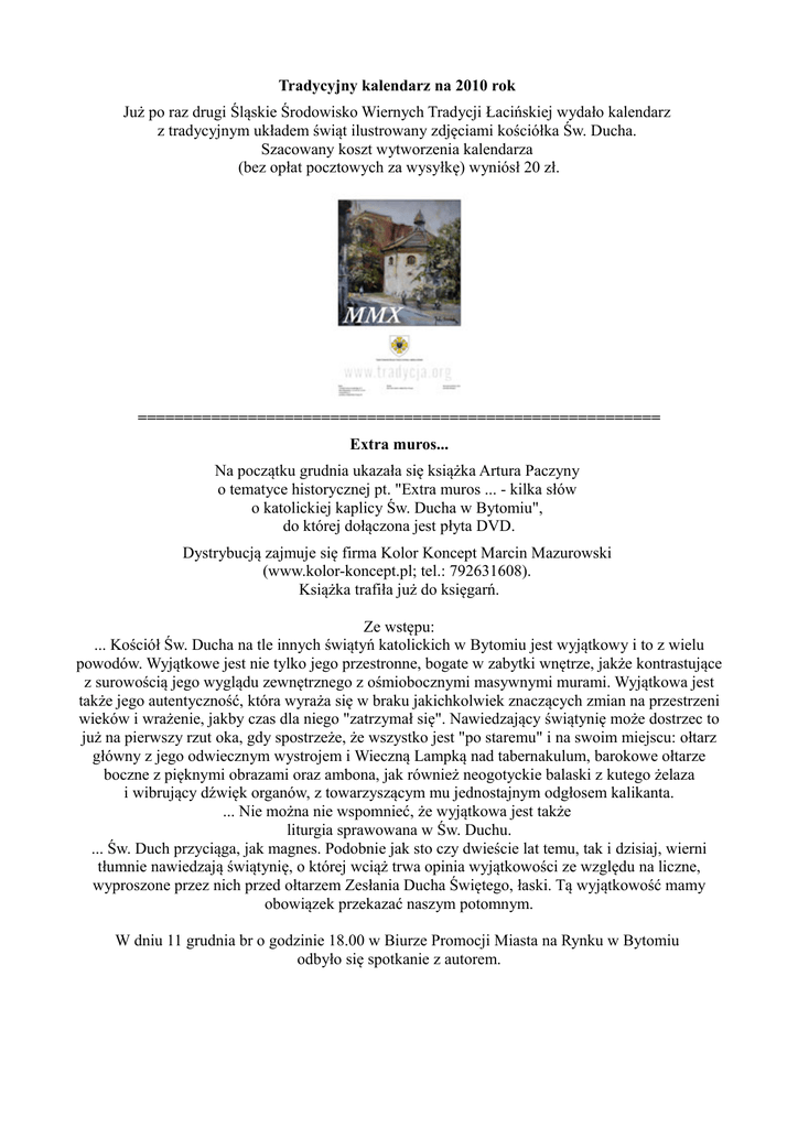 Tradycyjny kalendarz na 2010 rok Już po raz drugi Śląskie Środowisko Wiernych Tradycji Łacińskiej wydało kalendarz z tradycyjnym układem świąt ilustrowany zdjęciami kościółka Św. Ducha. Szacowany koszt wytworzenia kalendarza (bez opłat pocztowych za wysyłkę) wyniósł 20 zł. ========================================================= Extra muros... Na początku grudnia ukazała się książka Artura Paczyny o tematyce historycznej pt. "Extra muros ... - kilka słów o katolickiej kaplicy Św. Ducha w Bytomiu", do której dołączona jest płyta DVD. Dystrybucją zajmuje się firma Kolor Koncept Marcin Mazurowski (www.kolor-koncept.pl; tel.: 792631608). Książka trafiła już do księgarń. Ze wstępu: ... Kościół Św. Ducha na tle innych świątyń katolickich w Bytomiu jest wyjątkowy i to z wielu powodów. Wyjątkowe jest nie tylko jego przestronne, bogate w zabytki wnętrze, jakże kontrastujące z surowością jego wyglądu zewnętrznego z ośmiobocznymi masywnymi murami. Wyjątkowa jest także jego autentyczność, która wyraża się w braku jakichkolwiek znaczących zmian na przestrzeni wieków i wrażenie, jakby czas dla niego "zatrzymał się". Nawiedzający świątynię może dostrzec to już na pierwszy rzut oka, gdy spostrzeże, że wszystko jest "po staremu" i na swoim miejscu: ołtarz główny z jego odwiecznym wystrojem i Wieczną Lampką nad tabernakulum, barokowe ołtarze boczne z pięknymi obrazami oraz ambona, jak również neogotyckie balaski z kutego żelaza i wibrujący dźwięk organów, z towarzyszącym mu jednostajnym odgłosem kalikanta. ... Nie można nie wspomnieć, że wyjątkowa jest także liturgia sprawowana w Św. Duchu. ... Św. Duch przyciąga, jak magnes. Podobnie jak sto czy dwieście lat temu, tak i dzisiaj, wierni tłumnie nawiedzają świątynię, o której wciąż trwa opinia wyjątkowości ze względu na liczne, wyproszone przez nich przed ołtarzem Zesłania Ducha Świętego, łaski. Tą wyjątkowość mamy obowiązek przekazać naszym potomnym. W dniu 11 grudnia br o godzinie 18.00 w Biurze Promocji Miasta na Rynku w Bytomiu odbyło się spotkanie z autorem. ========================================================= OŚWIADCZENIE W dniu 23 września 2009 byliśmy świadkami wyroku, nawiązującego do najgorszych wzorców peerelowskiego wymiaru niesprawiedliwości. Skandaliczny wyrok, obnażający brak wiedzy sądu na temat początku życia człowieka to kpina z nauk medycznych, ale próba zmiany przez sąd - i narzucenia ogółowi społeczeństwa - nowego znaczenia pojęcia "zabójstwo", które do tej pory było dla wszystkich jasne (clara non sunt interpretanda), to hańba. Treść wyroku w sprawie Alicji T oraz jego uzasadnienie, wpisuje się w trend, obserwowany od dłuższego czasu, którego celem jst narzucenie Katolikom gorsetu poprawności politycznej oraz umieszczenie ich w gettcie zakrystii bez prawa do publicznego głoszenia poglądów w sprawach wiary i moralności, gdyż te nie podobają się wrogom Życia i Chrystusa. Wbrew złudnym nadziejom, ofensywa "cywilizacji śmierci" ukierunkowana na zamknięcie ust katolickiej opinii publicznej, nie powiedzie się. Podobnie jak nasi przodkowie - bez względu na konsekwencje - nadal będziemy publicznie głosić Dobrą Nowinę światu. Jesteśmy także przygotowani do obrony Kościoła przed jego wrogami oraz swobody wyznawania naszej Wiary. Jest także oczywiste, że mamy prawo żyć według jej zasad. Żaden sąd, orzekający na podstawie - niezgodnego z zasadami moralnymi i wiarą - "prawa", nie jest w stanie tego zmienić. Tak samo, jak nie jest w stanie zmienić tego, że każdy człowiek ma prawo do życia od poczęcia do naturalnej śmierci oraz że aborcja to morderstwo i zło. Rada Główna Śląskiego Środowiska Wiernych Tradycji Łacińskiej z siedzibą w Bytomiu ========================================================= Druga Śląska Pielgrzymka Tradycji Przy bezchmurnym niebie w pełnym słońcu, w dniu św. Januarego, już po raz drugi członkowie Śląskiego Środowiska Wiernych Tradycji Łacińskiej oraz wierni skupieni wokół Kościoła Św. Ducha w Bytomiu i Mszy św. trydenckiej, po Mszy św. udali się w pieszej pielgrzymce z Bytomia do Piekar Śląskich, oddając cześć Krzyżowi Świętemu oraz kłaniając się Matce Boskiej Piekarskiej, dziękując Bogu za dar Summorum Pontificum i jego owoce. Pielgrzymi, razem ze swoim duszpasterzem, x. Jarosławem Steczkowskim, odprawili także naobożeństwo Drogi Krzyżowej na usłanej kamieniami, wśród spadających kasztanów - Piekarskiej Kalwarii, rozważając Mękę i Śmierć Pana Jezusa. Pielgrzymka zakończyła się w Kościele Najświętszej Maryi Panny w Bytomiu, gdzie powracający pielgrzymi zostali pokropieni wodą święconą w drzwiach kościoła, a następnie po Koronce do Miłosierdzia Bożego, pobłogosławieni przez x. Jarosława. Już dzisiaj zachęcamy wszystkich do wzięcia udziału w pielgrzymce za rok. ========================================================= Ślub w Świętym Duchu Informujemy, że w dniu 5 września 2009 roku o godzinie 14.00 w kościele Świętego Ducha odbyła się uroczystość zaślubin Anny Staszczyk i Przemysława Dacy. ========================================================= Zmiany we władzach stowarzyszenia W związku z rezygnacjami złożonymi pod koniec maja br. przez Przewodniczącego Straży Stowarzyszenia - Piotra Ochwała oraz Wice-Prezesa Rady Głównej Stowarzyszenia - Macieja Dronia, Rada Główna Stowarzyszenia w dniu 19 czerwca br. jednogłośnie powołała na Przewodniczącego Straży Stowarzyszenia Pana Rafała Gwarka. Z kolei w dniu 6 lipca br. Prezes Rady Głównej powołał Pana Feliksa Całę na funkcję WicePrezesa. Obejmującym zaszczytne funkcje, serdecznie gratulujemy życząc im jednocześnie dalszej owocnej pracy dla rozwoju Tradycji na Śląsku. ========================================================= Koncert: "Siedem Ostatnich Sł