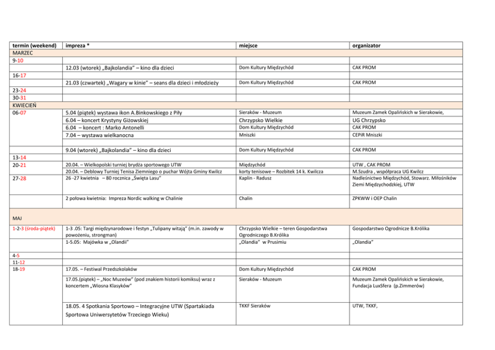 termin (weekend) impreza * miejsce organizator MARZEC 9