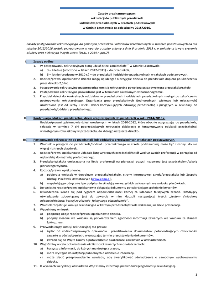 Zasady oraz harmonogram rekrutacji do publicznych przedszkoli i oddziałów przedszkolnych w szkołach podstawowych w Gminie Lesznowola na rok szkolny 2015/2016. Zasady postępowania rekrutacyjnego do gminnych przedszkoli i oddziałów przedszkolnych w szkołach podstawowych na rok szkolny 2015/2016 zostały przygotowane w oparciu o zapisy ustawy z dnia 6 grudnia 2013 r. o zmianie ustawy o systemie oświaty oraz niektórych innych ustaw (Dz.U. z 2014 r. poz.7). I. Zasady ogólne *) 1. W postępowaniu rekrutacyjnym biorą udział dzieci zamieszkałe w Gminie Lesznowola: a) 3 – 4 letnie (urodzone w latach 2012-2011) - do przedszkoli, b) 5 – letnie (urodzone w 2010 r.) – do przedszkoli i oddziałów przedszkolnych w szkołach podstawowych. 2. Rodzice/prawni opiekunowie dziecka mogą się ubiegać o przyjęcie dziecka do przedszkola dopiero po ukończeniu przez dziecko 2,5 lat. 3. Postępowanie rekrutacyjne przeprowadza komisja rekrutacyjna powołana przez dyrektora przedszkola/szkoły. 4. Postępowanie rekrutacyjne prowadzone jest w terminach określonych w harmonogramie. 5. Przydział dzieci do konkretnych oddziałów w przedszkolach i oddziałach przedszkolnych nastąpi po zakończeniu postepowania rekrutacyjnego. Organizacja grup przedszkolnych (jednorodnych wiekowo lub mieszanych) uzależniona jest od liczby i wieku dzieci kontynuujących edukację przedszkolną i przyjętych w rekrutacji do przedszkola/oddziału przedszkolnego. II. Kontynuacja edukacji przedszkolnej dzieci uczęszczających do przedszkoli w roku 2014/2015 r. Rodzice/prawni opiekunowie dzieci urodzonych w latach 2010-2012, które obecnie uczęszczają do przedszkola, składają w terminie 7 dni poprzedzających rekrutację deklarację o kontynuowaniu edukacji przedszkolnej w następnym roku szkolny w przedszkolu, do którego uczęszcza dziecko . III. Postępowanie rekrutacyjne do przedszkoli lub oddziałów przedszkolnych w szkołach podstawowych. 1. Wniosek o przyjęcie do przedszkola/oddziału przedszkolnego w szkole podstawowej może być złożony do nie więcej niż trzech placówek. 2. Rodzice/prawni opiekunowie układają listę wybranych przedszkoli/szkół według swoich preferencji w porządku od najbardziej do najmniej preferowanego. 3. Przedszkole/szkoła umieszczona na liście preferencji na pierwszej pozycji nazywana jest przedszkolem/szkołą pierwszego wyboru. 4. Rodzice/prawni opiekunowie: a) pobierają wniosek w dowolnym przedszkolu/szkole, strony internetowej szkoły/przedszkola lub Zespołu Obsługi Placówek Oświatowych (www.zopo.pl), b) wypełniają go odręcznie i po podpisaniu składają we wszystkich wskazanych we wniosku placówkach. 5. Do wniosku rodzice/prawni opiekunowie dołączają dokumenty potwierdzające spełnianie kryteriów. 6. Oświadczenia składa się pod rygorem odpowiedzialności karnej za składanie fałszywych zeznań. Składający oświadczenie zobowiązany jest do zawarcia w nim klauzuli następującej treści: „Jestem świadomy odpowiedzialności karnej za złożenia fałszywego oświadczenia”. 7. Wniosek rozpatruje komisja rekrutacyjna w każdym przedszkolu/szkole wskazanej na liście preferencji. 8. Wypełniony wniosek: a) podpisują oboje rodzice/prawni opiekunowie dziecka, b) podpisy złożone we wniosku są potwierdzeniem zgodności informacji zawartych we wniosku ze stanem faktycznym. 9. Przewodniczący komisji rekrutacyjnej ma prawo: a) żądać od rodziców/prawnych opiekunów przedstawienia dokumentów potwierdzających okoliczności zawarte w oświadczeniach, wyznaczając termin przedstawienia dokumentów, b) zwrócić się do Wójta Gminy o potwierdzenie okoliczności zawartych w oświadczeniach. 10. Wójt Gminy w celu potwierdzenia okoliczności zawartych w oświadczeniach: a) korzysta z informacji, do których ma dostęp z urzędu, b) może wystąpić do instytucji publicznych o udzielenie informacji, c) może zlecić przeprowadzenie wywiadu, aby zweryfikować oświadczenie o samotnym wychowywaniu dziecka. 11. O wynikach weryfikacji oświadczeń Wójt Gminy informuje przewodniczącego komisji rekrutacyjnej. 1 12. W przypadku braku potwierdzenia okoliczności zawartych w oświadczeniu , komisja rekrutacyjna, rozpatrując wniosek, nie uwzględnia kryterium, które nie zostało potwierdzone. 13. Na podstawie spełnionych przez kandydata kryteriów kwalifikacyjnych komisja rekrutacyjna ustala kolejność przyjęć. 14. W przypadku większej liczby kandydatów niż liczba wolnych miejsc na pierwszym etapie postępowania rekrutacyjnego brane są pod uwagę łącznie kryteria określone w ustawie o systemie oświaty, tzw. kryteria ustawowe. 15. W przypadku równorzędnych wyników uzyskanych na pierwszym etapie postępowania rekrutacyjnego lub jeżeli po jego zakończeniu przedszkole nadal dysponuje wolnymi miejscami, na drugim etapie brane są pod uwagę tzw. „kryteria lokalne” określone Uchwałą Nr 42/V/2015 Rady Gminy Lesznowola z dnia 17 lutego 2015 r. w sprawie ustalenia kryteriów wraz z liczbą punktów na II etapie postępowania rekrutacyjnego do publicznych przedszkoli i oddziałów przedszkolnych w szkołach podstawowych prowadzonych przez Gminę Lesznowola. 16. W przypadku uzyskania przez grupę kandydatów równorzędnych wyników, na drugim etapie postępowania rekrutacyjnego, komisja rekrutacyjna ustalając kolejność kwalifikacji bierze pod uwagę miejsce przedszkola/szkoły na liście preferencji kandydata (w porządku od najbardziej do najmniej preferowanej). 17. Komisja rekrutacyjna podaje do publicznej wiadomości wyniki postępowania rekrutacyjnego, w formie listy dzieci zakwalifikowanych i niezakwalifikowanych do przyjęcia. 18. Rodzice/prawni opiekunowie dzieci zakwalifikowanych do przyjęcia składają pisemne potwierdzenie woli zapisu w przedszkolu/szkole, do której dziecko zostało zakwalifikowane. 19. Komisja rekrutacyjna: a) przyjmuje dziecko do przedszkola/szkoły, jeżeli zostało zakwalifikowane do przyjęcia i rodzice 