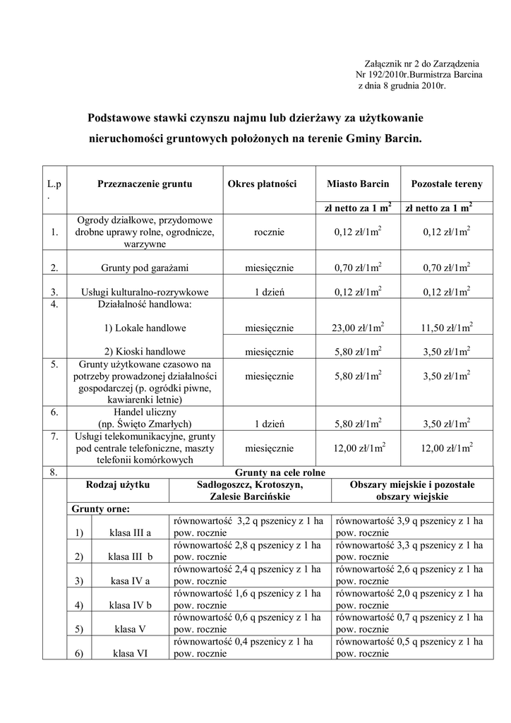 Załącznik nr 2 do Zarządzenia Nr 192/2010r.Burmistrza Barcina z dnia 8 grudnia 2010r. Podstawowe stawki czynszu najmu lub dzierżawy za użytkowanie nieruchomości gruntowych położonych na terenie Gminy Barcin. L.p . Przeznaczenie gruntu Okres płatności Miasto Barcin zł netto za 1 m2 Pozostałe tereny zł netto za 1 m2 1. Ogrody działkowe, przydomowe drobne uprawy rolne, ogrodnicze, warzywne rocznie 0,12 zł/1m2 0,12 zł/1m2 2. Grunty pod garażami miesięcznie 0,70 zł/1m2 0,70 zł/1m2 3. 4. Usługi kulturalno-rozrywkowe Działalność handlowa: 1 dzień 0,12 zł/1m2 0,12 zł/1m2 1) Lokale handlowe miesięcznie 23,00 zł/1m2 11,50 zł/1m2 2) Kioski handlowe Grunty użytkowane czasowo na potrzeby prowadzonej działalności gospodarczej (p. ogródki piwne, kawiarenki letnie) Handel uliczny (np. Święto Zmarłych) Usługi telekomunikacyjne, grunty pod centrale telefoniczne, maszty telefonii komórkowych miesięcznie 5,80 zł/1m2 3,50 zł/1m2 miesięcznie 5,80 zł/1m2 3,50 zł/1m2 1 dzień 5,80 zł/1m2 3,50 zł/1m2 miesięcznie 12,00 zł/1m2 12,00 zł/1m2 5. 6. 7. 8. Rodzaj użytku Grunty na cele rolne Sadłogoszcz, Krotoszyn, Zalesie Barcińskie Obszary miejskie i pozostałe obszary wiejskie Grunty orne: 1) klasa III a 2) klasa III b 3) kasa IV a 4) klasa IV b 5) klasa V 6) klasa VI równowartość 3,2 q pszenicy z 1 ha pow. rocznie równowartość 2,8 q pszenicy z 1 ha pow. rocznie równowartość 2,4 q pszenicy z 1 ha pow. rocznie równowartość 1,6 q pszenicy z 1 ha pow. rocznie równowartość 0,6 q pszenicy z 1 ha pow. rocznie równowartość 0,4 pszenicy z 1 ha pow. rocznie równowartość 3,9 q pszenicy z 1 ha pow. rocznie równowartość 3,3 q pszenicy z 1 ha pow. rocznie równowartość 2,6 q pszenicy z 1 ha pow. rocznie równowartość 2,0 q pszenicy z 1 ha pow. rocznie równowartość 0,7 q pszenicy z 1 ha pow. rocznie równowartość 0,5 q pszenicy z 1 ha pow. rocznie 9. 10. 11. Użytki zielone 1) klasa III 2) klasa IV 3) klasa V 4) klasa VI Nieużytki Pozostałe grunty nie wymienione w załączniku równowartość 2,2 q pszenicy z 1 ha równowartość 2,6 q pszenicy z 1 ha pow. rocznie pow. rocznie równowartość 1,3 q pszenicy z 1 ha równowartość 1,5 q pszenicy z 1 ha pow. rocznie pow. rocznie równowartość 0,5 q pszenicy z 1 ha równowartość 0,6 q pszenicy z 1 ha pow. rocznie pow. rocznie równowartość 0,4 q pszenicy z 1 ha równowartość 0,5 q pszenicy z 1 ha pow. rocznie pow. rocznie równowartość 0,4 q pszenicy z 1 ha równowartość 0,5 q pszenicy z 1 ha pow. rocznie pow. rocznie Wysokość czynszu ustala się w drodze negocjacji – wysokość stawki ustala Burmistrz Barcina Stawka czynszu za grunty przeznaczone na cele rolne podlega waloryzacji według ustalonych przeliczników w stosunku do ceny 1q pszenicy obowiązującej w pierwszym półroczu roku kalendarzowego, na podstawie obwieszczeń Prezesa Głównego Urzędu Statystycznego, ogłaszanych w Monitorze Polskim.