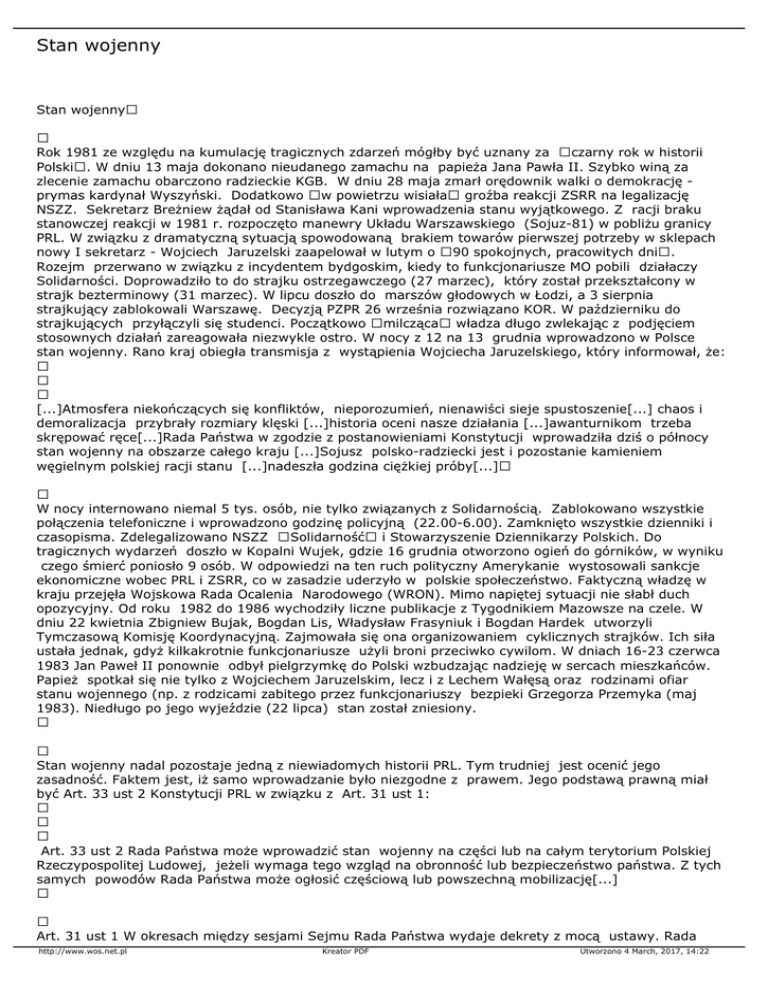 Stan wojenny Stan wojenny Rok 1981 ze względu na kumulację tragicznych zdarzeń mógłby być uznany za czarny rok w historii Polski. W dniu 13 maja dokonano nieudanego zamachu na papieża Jana Pawła II. Szybko winą za zlecenie zamachu obarczono radzieckie KGB. W dniu 28 maja zmarł orędownik walki o demokrację prymas kardynał Wyszyński. Dodatkowo w powietrzu wisiała groźba reakcji ZSRR na legalizację NSZZ. Sekretarz Breżniew żądał od Stanisława Kani wprowadzenia stanu wyjątkowego. Z racji braku stanowczej reakcji w 1981 r. rozpoczęto manewry Układu Warszawskiego (Sojuz-81) w pobliżu granicy PRL. W związku z dramatyczną sytuacją spowodowaną brakiem towarów pierwszej potrzeby w sklepach nowy I sekretarz - Wojciech Jaruzelski zaapelował w lutym o 90 spokojnych, pracowitych dni. Rozejm przerwano w związku z incydentem bydgoskim, kiedy to funkcjonariusze MO pobili działaczy Solidarności. Doprowadziło to do strajku ostrzegawczego (27 marzec), który został przekształcony w strajk bezterminowy (31 marzec). W lipcu doszło do marszów głodowych w Łodzi, a 3 sierpnia strajkujący zablokowali Warszawę. Decyzją PZPR 26 września rozwiązano KOR. W październiku do strajkujących przyłączyli się studenci. Początkowo milcząca władza długo zwlekając z podjęciem stosownych działań zareagowała niezwykle ostro. W nocy z 12 na 13 grudnia wprowadzono w Polsce stan wojenny. Rano kraj obiegła transmisja z wystąpienia Wojciecha Jaruzelskiego, który informował, że: [...]Atmosfera niekończących się konfliktów, nieporozumień, nienawiści sieje spustoszenie[...] chaos i demoralizacja przybrały rozmiary klęski [...]historia oceni nasze działania [...]awanturnikom trzeba skrępować ręce[...]Rada Państwa w zgodzie z postanowieniami Konstytucji wprowadziła dziś o północy stan wojenny na obszarze całego kraju [...]Sojusz polsko-radziecki jest i pozostanie kamieniem węgielnym polskiej racji stanu [...]nadeszła godzina ciężkiej próby[...] W nocy internowano niemal 5 tys. osób, nie tylko związanych z Solidarnością. Zablokowano wszystkie połączenia telefoniczne i wprowadzono godzinę policyjną (22.00-6.00). Zamknięto wszystkie dzienniki i czasopisma. Zdelegalizowano NSZZ Solidarność i Stowarzyszenie Dziennikarzy Polskich. Do tragicznych wydarzeń doszło w Kopalni Wujek, gdzie 16 grudnia otworzono ogień do górników, w wyniku czego śmierć poniosło 9 osób. W odpowiedzi na ten ruch polityczny Amerykanie wystosowali sankcje ekonomiczne wobec PRL i ZSRR, co w zasadzie uderzyło w polskie społeczeństwo. Faktyczną władzę w kraju przejęła Wojskowa Rada Ocalenia Narodowego (WRON). Mimo napiętej sytuacji nie słabł duch opozycyjny. Od roku 1982 do 1986 wychodziły liczne publikacje z Tygodnikiem Mazowsze na czele. W dniu 22 kwietnia Zbigniew Bujak, Bogdan Lis, Władysław Frasyniuk i Bogdan Hardek utworzyli Tymczasową Komisję Koordynacyjną. Zajmowała się ona organizowaniem cyklicznych strajków. Ich siła ustała jednak, gdyż kilkakrotnie funkcjonariusze użyli broni przeciwko cywilom. W dniach 16-23 czerwca 1983 Jan Paweł II ponownie odbył pielgrzymkę do Polski wzbudzając nadzieję w sercach mieszkańców. Papież spotkał się nie tylko z Wojciechem Jaruzelskim, lecz i z Lechem Wałęsą oraz rodzinami ofiar stanu wojennego (np. z rodzicami zabitego przez funkcjonariuszy bezpieki Grzegorza Przemyka (maj 1983). Niedługo po jego wyjeździe (22 lipca) stan został zniesiony. Stan wojenny nadal pozostaje jedną z niewiadomych historii PRL. Tym trudniej jest ocenić jego zasadność. Faktem jest, iż samo wprowadzanie było niezgodne z prawem. Jego podstawą prawną miał być Art. 33 ust 2 Konstytucji PRL w związku z Art. 31 ust 1: Art. 33 ust 2 Rada Państwa może wprowadzić stan wojenny na części lub na całym terytorium Polskiej Rzeczypospolitej Ludowej, jeżeli wymaga tego wzgląd na obronność lub bezpieczeństwo państwa. Z tych samych powodów Rada Państwa może ogłosić częściową lub powszechną mobilizację[...] Art. 31 ust 1 W okresach między sesjami Sejmu Rada Państwa wydaje dekrety z mocą ustawy. Rada http://www.wos.net.pl Kreator PDF Utworzono 4 March, 2017, 14:22 Państwa przedstawia dekrety Sejmowi na najbliższej sesji do zatwierdzenia Ponieważ nadal trwała sesja Sejmu Rada Państwa nie mogła wydać dekretu. Co więcej sama konstrukcja ciała zwanego WRON nie miała podstawy prawnej a kompetencje tegoż ciała pozostały nieuregulowane. Polemiczne jest również, czy niewprowadzienie stanu wojennego mogłoby wywołać agresję ZSRR. Jeszcze 10 grudnia 1981 roku szef KGB Jurij Andropow na posiedzeniu KC KPZR (być może zastraszony przez USA) zajął stanowisko, iż należy powstrzymać się od inwazji. Faktem jest również, że w okresie stanu wojennego nie przestrzegano praw zawartych w Akcie Końcowym. Z drugiej strony Polsce groziła rewolucja społeczna, która mogła doprowadzić do utraty życia przez wielu obywateli. http://www.wos.net.pl Kreator PDF Utworzono 4 March, 2017, 14:22