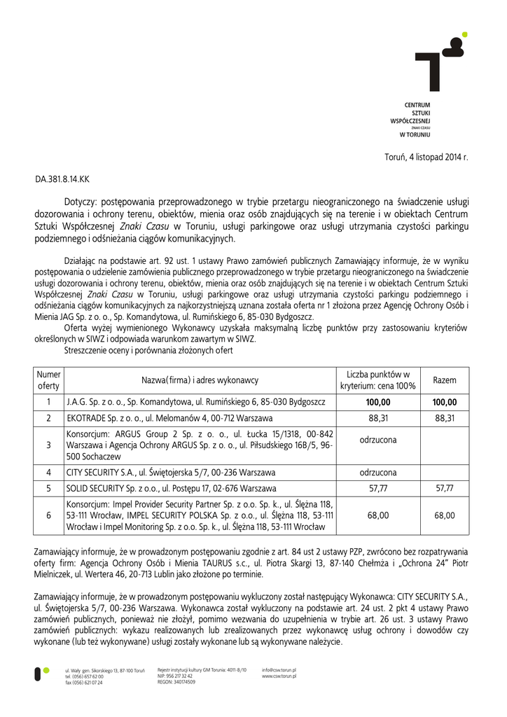 Toruń, 4 listopad 2014 r. DA.381.8.14.KK Dotyczy: postępowania przeprowadzonego w trybie przetargu nieograniczonego na świadczenie usługi dozorowania i ochrony terenu, obiektów, mienia oraz osób znajdujących się na terenie i w obiektach Centrum Sztuki Współczesnej Znaki Czasu w Toruniu, usługi parkingowe oraz usługi utrzymania czystości parkingu podziemnego i odśnieżania ciągów komunikacyjnych. Działając na podstawie art. 92 ust. 1 ustawy Prawo zamówień publicznych Zamawiający informuje, że w wyniku postępowania o udzielenie zamówienia publicznego przeprowadzonego w trybie przetargu nieograniczonego na świadczenie usługi dozorowania i ochrony terenu, obiektów, mienia oraz osób znajdujących się na terenie i w obiektach Centrum Sztuki Współczesnej Znaki Czasu w Toruniu, usługi parkingowe oraz usługi utrzymania czystości parkingu podziemnego i odśnieżania ciągów komunikacyjnych za najkorzystniejszą uznana została oferta nr 1 złożona przez Agencję Ochrony Osób i Mienia JAG Sp. z o. o., Sp. Komandytowa, ul. Rumińskiego 6, 85-030 Bydgoszcz. Oferta wyżej wymienionego Wykonawcy uzyskała maksymalną liczbę punktów przy zastosowaniu kryteriów określonych w SIWZ i odpowiada warunkom zawartym w SIWZ. Streszczenie oceny i porównania złożonych ofert Numer oferty Nazwa(firma) i adres wykonawcy Liczba punktów w kryterium: cena 100% Razem 1 J.A.G. Sp. z o. o., Sp. Komandytowa, ul. Rumińskiego 6, 85-030 Bydgoszcz 100,00 100,00 2 EKOTRADE Sp. z o. o., ul. Melomanów 4, 00-712 Warszawa 88,31 88,31 3 Konsorcjum: ARGUS Group 2 Sp. z o. o., ul. Łucka 15/1318, 00-842 Warszawa i Agencja Ochrony ARGUS Sp. z o. o., ul. Piłsudskiego 16B/5, 96500 Sochaczew 4 CITY SECURITY S.A., ul. Świętojerska 5/7, 00-236 Warszawa odrzucona 5 SOLID SECURITY Sp. z o.o., ul. Postępu 17, 02-676 Warszawa 57,77 57,77 6 Konsorcjum: Impel Provider Security Partner Sp. z o.o. Sp. k., ul. Ślężna 118, 53-111 Wrocław, IMPEL SECURITY POLSKA Sp. z o.o., ul. Ślężna 118, 53-111 Wrocław i Impel Monitoring Sp. z o.o. Sp. k., ul. Ślężna 118, 53-111 Wrocław 68,00 68,00 odrzucona Zamawiający informuje, że w prowadzonym postępowaniu zgodnie z art. 84 ust 2 ustawy PZP, zwrócono bez rozpatrywania oferty firm: Agencja Ochrony Osób i Mienia TAURUS s.c., ul. Piotra Skargi 13, 87-140 Chełmża i „Ochrona 24” Piotr Mielniczek, ul. Wertera 46, 20-713 Lublin jako złożone po terminie. Zamawiający informuje, że w prowadzonym postępowaniu wykluczony został następujący Wykonawca: CITY SECURITY S.A., ul. Świętojerska 5/7, 00-236 Warszawa. Wykonawca został wykluczony na podstawie art. 24 ust. 2 pkt 4 ustawy Prawo zamówień publicznych, ponieważ nie złożył, pomimo wezwania do uzupełnienia w trybie art. 26 ust. 3 ustawy Prawo zamówień publicznych: wykazu realizowanych lub zrealizowanych przez wykonawcę usług ochrony i dowodów czy wykonane (lub też wykonywane) usługi zostały wykonane lub są wykonywane należycie. W odniesieniu do dowodów należytego wykonania usług Zamawiający wskazywał, że należy je doręczyć w formie oryginałów bądź też w postaci odpisów poświadczonych przez Wykonawcę za zgodność z oryginałem. Dokumenty przesłane faxem nie spełniają tego wymogu. Z uwagi na powyższe Zamawiający zobowiązany był wykluczyć Wykonawcę z postępowania i zgodnie z art. 89 ust.1 pkt 5 ustawy Prawo zamówień publicznych odrzucić ofertę złożoną przez wykluczonego Wykonawcę. Zamawiający informuje, że w prowadzonym postępowaniu wykluczony został następujący Wykonawca: Konsorcjum: ARGUS Group 2 Sp. z o. o., ul. Łucka 15/1318, 00-842 Warszawa i Agencja Ochrony ARGUS Sp. z o. o., ul. Piłsudskiego 16B/5, 96-500 Sochaczew. Wykonawca został wykluczony na podstawie art. 24 ust. 2 pkt 4 ustawy Prawo zamówień publicznych, ponieważ nie złożył, pomimo wezwania do uzupełnienia w trybie art. 26 ust. 3 ustawy Prawo zamówień publicznych polisy ubezpieczeniowej od odpowiedzialności cywilnej za szkody przy wykonywaniu czynności związanych z prowadzoną działalnością gospodarczą w zakresie usług ochrony osób i mienia w wysokości nie niższej niż 1 000 000 zł. Z uwagi na powyższe Zamawiający zobowiązany był wykluczyć Wykonawcę z postępowania i zgodnie z art. 89 ust.1 pkt 5 ustawy Prawo zamówień publicznych odrzucić ofertę złożoną przez wykluczonego Wykonawcę. Zamawiający informuje, że umowa w sprawie zamówienia publicznego zostanie podpisana w terminie nie krótszym niż 5 dni od dnia przesłania faksem do wykonawców, którzy złożyli w niniejszym postępowaniu oferty, zawiadomienia o wyborze najkorzystniejszej oferty (art. 94 ust. 1 pkt. 2 ustawy Prawo zamówień publicznych).