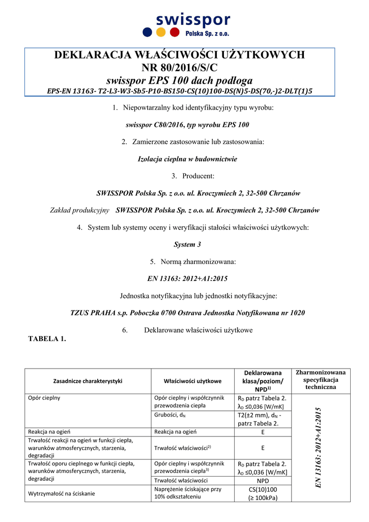 DEKLARACJA WŁAŚCIWOŚCI UŻYTKOWYCH NR 80/2016/S/C swisspor EPS 100 dach podłoga EPS-EN 13163- T2-L3-W3-Sb5-P10-BS150-CS(10)100-DS(N)5-DS(70,-)2-DLT(1)5 1. Niepowtarzalny kod identyfikacyjny typu wyrobu: swisspor C80/2016, typ wyrobu EPS 100 2. Zamierzone zastosowanie lub zastosowania: Izolacja cieplna w budownictwie 3. Producent: SWISSPOR Polska Sp. z o.o. ul. Kroczymiech 2, 32-500 Chrzanów Zakład produkcyjny SWISSPOR Polska Sp. z o.o. ul. Kroczymiech 2, 32-500 Chrzanów 4. System lub systemy oceny i weryfikacji stałości właściwości użytkowych: System 3 5. Normą zharmonizowana: EN 13163: 2012+A1:2015 Jednostka notyfikacyjna lub jednostki notyfikacyjne: TZUS PRAHA s.p. Poboczka 0700 Ostrava Jednostka Notyfikowana nr 1020 6. Deklarowane właściwości użytkowe TABELA 1. Opór cieplny Właściwości użytkowe Opór cieplny i współczynnik przewodzenia ciepła Grubości, dN Reakcja na ogień Trwałość reakcji na ogień w funkcji ciepła, warunków atmosferycznych, starzenia, degradacji Trwałość oporu cieplnego w funkcji ciepła, warunków atmosferycznych, starzenia, degradacji Wytrzymałość na ściskanie Reakcja na ogień Trwałość właściwości2) Opór cieplny i współczynnik przewodzenia ciepła3) Trwałość właściwości Naprężenie ściskające przy 10% odkształceniu Deklarowana klasa/poziom/ NPD1) RD patrz Tabela 2. λD ≤0,036 [W/mK] T2(±2 mm), dN patrz Tabela 2. E E RD patrz Tabela 2. λD ≤0,036 [W/mK] NPD CS(10)100 (≥ 100kPa) Zharmonizowana specyfikacja techniczna EN 13163: 2012+A1:2015 Zasadnicze charakterystyki Wytrzymałość na zginanie BS150 (≥ 150kPa) Wytrzymałość na rozciąganie Wytrzymałość na rozciąganie/zginanie prostopadle do powierzchni NPD czołowych Pełzanie przy ściskaniu NPD Trwałość wytrzymałości na ściskanie w funkcji Odporność na zamrażanieNPD starzenia i degradacji odmrażanie Długotrwała redukcja grubości NPD Przepuszczalność wody Nasiąkliwość wody przy NPD długotrwałym zanurzeniu. Absorpcja wody przy NPD długotrwałej dyfuzji Przepuszczalność pary wodnej Przenikanie pary wodnej NPD Sztywność dynamiczna NPD Wskaźnik izolacyjności od dźwięków Grubość, dL NPD uderzeniowych (dla podłóg) Ściśliwość NPD Ciągłe spalanie w postaci żarzenia Ciągłe spalanie w postaci NPD żarzenia Uwolnienie się substancji Uwolnienie się substancji niebezpiecznych NPD niebezpiecznych4) do środowiska wewnętrznego 1)właściwości użytkowe nieustalone, 2)właściwości ogniowe EPS nie zmieniają się w czasie, 3)współczynnik przewodzenia ciepła i opór cieplny nie zmieniają się w czasie, 4)europejskie metody badań są w trakcie opracowania. Tabela 2. Grubość [mm] 10 20 30 40 50 60 70 80 90 100 110 120 130 140 150 0,25 0,55 0,80 1,10 1,35 1,65 1,90 2,20 2,50 2,75 3,05 3,30 3,60 3,85 4,15 160 170 180 190 200 210 220 230 240 250 260 270 280 290 300 4,40 4,70 5,00 5,25 5,55 5,80 6,10 6,35 6,65 6,90 7,20 7,50 7,75 8,05 8,30 Opór cieplny Grubość [mm] Opór cieplny Właściwości użytkowe określonego powyżej wyrobu są zgodne z zestawem deklarowanych właściwości użytkowych. Niniejsza deklaracja właściwości użytkowych wydana zostaje zgodnie z rozporządzeniem (UE) nr 305/2011 na wyłączną odpowiedzialność producenta określonego powyżej. W imieniu producenta podpisała : Krajowy Doradca Techniczny: Edyta Sauć W Pelplinie www.swisspor.pl dnia :22.06.2016 KARTA TECHNICZNA swisspor EPS 100 dach podłoga OPIS Uniwersalny materiał termoizolacyjny swisspor EPS 100 dach podłoga produkowany metodą spieniania polistyrenu, technologicznie cięty gładko lub z frezem. Standardowy wymiar płyty 500x1000 mm. Istnieje możliwość indywidualnego zamówienia w innych wymiarach. Produkt przeznaczony do wykonywania izolacji cieplnych w budownictwie. SPECYFIKACJA TECHNICZNA Kod wyrobu zgodnie z EN 13163:2012 T2-L3-W3-S5-P10-BS150-CS(10)100-DS(N)5-DS(70,-)2-DLT(1)5 deklarowany współczynnik przewodzenia ciepła D– 0,037 [W/mK] klasa reakcji na ogień – E grubość T(2) ± 2 mm długość L(3) ± 3 mm szerokość W(3) ± 3 mm prostokątność Sb(5) ± 5 mm/1000 mm płaskość P(10) ± 10 mm wytrzymałość na zginanie naprężenia ściskające przy 10% odkształceniu względnym stabilność wymiarowa w stałych normalnych warunkach laboratoryjnych stabilność wymiarowa w określonych warunkach temperatury i wilgotności odkształcenie w określonych warunkach obciążenia ściskającego i temperatury BS150 CS(10)100 DS(N)5 DS(70,-)2 DLT(1)5 ± 150 kPa 100 kPa 0,5% 2% 5% Tabela 1. Deklarowane wartości oporu cieplnego RD Grubość [mm] 10 20 30 40 50 60 70 80 90 100 110 120 130 140 150 0,25 0,55 0,80 1,10 1,35 1,65 1,90 2,20 2,50 2,75 3,05 3,30 3,60 3,85 4,15 160 170 180 190 200 210 220 230 240 250 260 270 280 290 300 4,40 4,70 5,00 5,25 5,55 5,80 6,10 6,35 6,65 6,90 7,20 7,50 7,75 8,05 8,30 Opór cieplny Grubość [mm] Opór cieplny ZASTOSOWANIE Izolacja cieplna w budownictwie. - podłóg w budownictwie mieszkalnym i użyteczności publicznej, - podłóg na gruncie w budownictwie przemysłowym, przy małych i średnich obciążeniach, - podłóg na stropach o sztywnej konstrukcji, - podłóg w systemie ogrzewania podłogowego, - stropów pomiędzy pomieszczeniami ogrzewanymi i nieogrzewanymi, - stropów zewnętrznych i nad przejazdami, - stropodachów pełnych i wentylowanych, - stropodachów o lekkiej konstrukcji, np. blacha trapezowa, - tarasów i balkonów, - dachów stromych pomiędzy, nad i pod krokwiami. PRACA ZE STYROPIANEM Bezpośredni kontakt ze styropianem nie powoduje oparzeń rąk czy podrażnień skóry i błon śluzowych oraz nie wywołuje innych, szkodliwych dla zdrowia skutków. Praca ze styropianem nie wymaga stosowania żadnych środków ochrony osobistej typu rękawice, maski przeciwpyłowe, ubrania i okulary ochronne. Ocieplenie ze styropianu można bezpiecznie szlifować, nie stwarzając zagrożenia dla zdrowia. Styropian, nie emituje żadnego promieniowania radioaktyw