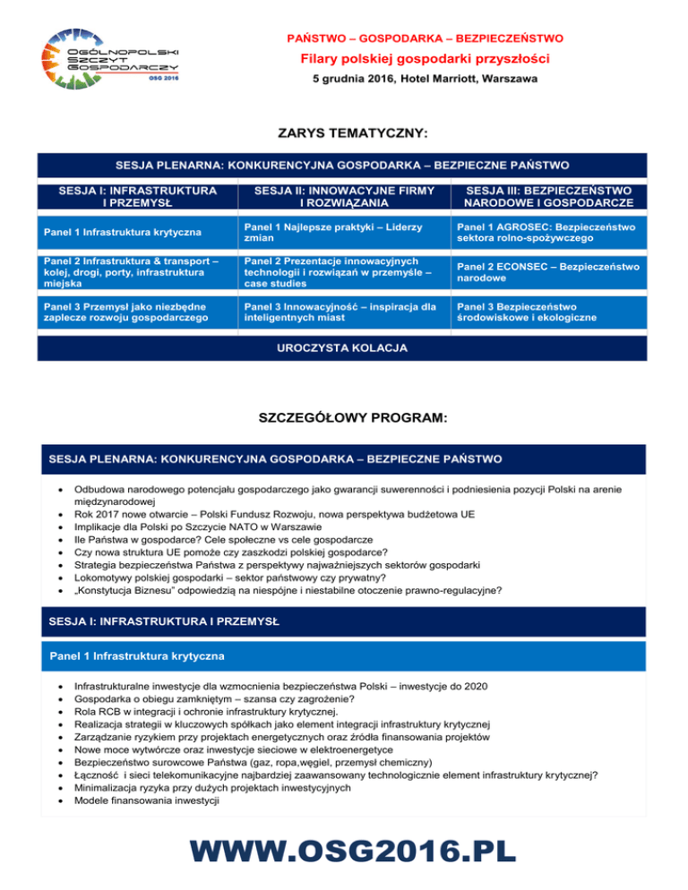 PAŃSTWO – GOSPODARKA – BEZPIECZEŃSTWO Filary polskiej gospodarki przyszłości 5 grudnia 2016, Hotel Marriott, Warszawa ZARYS TEMATYCZNY: SESJA PLENARNA: KONKURENCYJNA GOSPODARKA – BEZPIECZNE PAŃSTWO SESJA I: INFRASTRUKTURA I PRZEMYSŁ SESJA II: INNOWACYJNE FIRMY I ROZWIĄZANIA SESJA III: BEZPIECZEŃSTWO NARODOWE I GOSPODARCZE Panel 1 Infrastruktura krytyczna Panel 1 Najlepsze praktyki – Liderzy zmian Panel 1 AGROSEC: Bezpieczeństwo sektora rolno-spożywczego Panel 2 Infrastruktura & transport – kolej, drogi, porty, infrastruktura miejska Panel 2 Prezentacje innowacyjnych technologii i rozwiązań w przemyśle – case studies Panel 2 ECONSEC – Bezpieczeństwo narodowe Panel 3 Przemysł jako niezbędne zaplecze rozwoju gospodarczego Panel 3 Innowacyjność – inspiracja dla inteligentnych miast Panel 3 Bezpieczeństwo środowiskowe i ekologiczne UROCZYSTA KOLACJA SZCZEGÓŁOWY PROGRAM: SESJA PLENARNA: KONKURENCYJNA GOSPODARKA – BEZPIECZNE PAŃSTWO Odbudowa narodowego potencjału gospodarczego jako gwarancji suwerenności i podniesienia pozycji Polski na arenie międzynarodowej Rok 2017 nowe otwarcie – Polski Fundusz Rozwoju, nowa perspektywa budżetowa UE Implikacje dla Polski po Szczycie NATO w Warszawie Ile Państwa w gospodarce? Cele społeczne vs cele gospodarcze Czy nowa struktura UE pomoże czy zaszkodzi polskiej gospodarce? Strategia bezpieczeństwa Państwa z perspektywy najważniejszych sektorów gospodarki Lokomotywy polskiej gospodarki – sektor państwowy czy prywatny? „Konstytucja Biznesu” odpowiedzią na niespójne i niestabilne otoczenie prawno-regulacyjne? SESJA I: INFRASTRUKTURA I PRZEMYSŁ Panel 1 Infrastruktura krytyczna Infrastrukturalne inwestycje dla wzmocnienia bezpieczeństwa Polski – inwestycje do 2020 Gospodarka o obiegu zamkniętym – szansa czy zagrożenie? Rola RCB w integracji i ochronie infrastruktury krytycznej. Realizacja strategii w kluczowych spółkach jako element integracji infrastruktury krytycznej Zarządzanie ryzykiem przy projektach energetycznych oraz źródła finansowania projektów Nowe moce wytwórcze oraz inwestycje sieciowe w elektroenergetyce Bezpieczeństwo surowcowe Państwa (gaz, ropa,węgiel, przemysł chemiczny) Łączność i sieci telekomunikacyjne najbardziej zaawansowany technologicznie element infrastruktury krytycznej? Minimalizacja ryzyka przy dużych projektach inwestycyjnych Modele finansowania inwestycji WWW.OSG2016.PL Panel 2 Infrastruktura & transport – kolej, drogi, porty, infrastruktura miejska Udział prywatnych inwestorów w rozbudowie infrastruktury Ewolucja w kolejowych przewozach towarów – uwarunkowania makroekonomiczne Transport pasażerski – jak zachęcać do korzystania z transportu publicznego? Jak finansować inwestycje w infrastrukturę? Transport z perspektywy samorządów – kolej metropolitalna Perspektywiczne szlaki i nowe kierunki potoków towarów – północ-południe, Europa Chiny? Transport intermodalny, huby i centra logistyczne – czy klienci w pełni wykorzystują aktualny potencjał branży Rosnący rynek prywatnych przewoźników cargo – potencjał elastyczności i konkurencyjności Nowoczesna infrastruktura najlepszą wizytówką miast Panel 3 Przemysł jako niezbędne zaplecze rozwoju gospodarczego Strategiczne sektory dla bezpieczeństwa kraju – ocena aktualności? Skala i zakres pomocy państwa i jego agend dla polskich eksporterów i inwestorów Finansowe skutki restrukturyzacji UE dla polskiego przemysłu Wilk syty i owca cała – jak być atrakcyjnym dla inwestorów zagranicznych. Optymalizacja modelu współpracy. Polskie marki za granicą – liderzy eksportu Rewitalizacja polskiego przemysłu na przykładzie PGG oraz AUTOSAN Jak chronić polski przemysł przed wrogim przejęciem Przemysł metalurgiczny i metali kolorowych – ekspansja i konkurencja na rynkach światowych Polska węglem stoi? SESJA II: INNOWACYJNE FIRMY I ROZWIĄZANIA Panel 1 Najlepsze praktyki – Liderzy zmian Ewolucja czy rewolucja? Kapitał na badania i rozwój – od pomysłu do produktu Budowanie Marki – inwestycje w świadomość klienta Świat to za mało- jak przekraczać granice w poszukiwaniu rynków w dobie Internetu? Informatyzacja to nie wszystko: Produkty 21: forma a nie trwałość? - dlaczego klient tęskni za dawną jakością i prostotą urządzeń? Klient na rynku nowoczesnych technologii. Program Witelo Panel 2 Prezentacje innowacyjnych technologii i rozwiązań w przemyśle – case studies Panel 3 Innowacyjność – inspiracja dla inteligentnych miast Rola i fundusze samorządów wykorzystane na potrzeby wspierania przedsiębiorczości Transport publiczny: inteligentne systemy zarządzania ruchem Technologie IT w projektach infrastrukturalnych: inteligentne domy, inteligentna instalacja świetlna, punkty ładowania samochodów hybrydowych. Nowoczesna infrastruktura najlepszą wizytówką miast. Innowacyjny biznes podstawą miast przyszłości Miasto dla mieszkańców – mieszkańcy dla miasta o Płatności „w mieście i miastu” o ICT – inteligentne platformy komunikacji z mieszkańcami o Czynnik bezpieczeństwa i polityka prywatności w projektach smart city o Interaktywna przestrzeń miejska Budowanie „kapitału miasta i regionu” – strategie promocyjne B2B i B2C Smart cities - przykłady najciekawszych wdrożeń Inteligentne miasto XXI – wyzwanie czy konieczność. Program Mieszkanie Plus – nowe wyzwanie dla samorządów WWW.OSG2016.PL SESJA III: BEZPIECZEŃSTWO NARODOWE I GOSPODARCZE Panel 1 AGROSEC: Bezpieczeństwo sektora rolno-spożywczego Branża rolno-spożywcza 27 lat po przemianach ustrojowych w Polsce – wykorzystane szanse, niespełnione nadzieje. Wpływ członkostwa Polski w Unii Europejskiej na kondycję branży rolno-spożywczej – czy przyszłość branży zależy nadal od rynku unijnego? o Unia Europejska to już za mało – konieczność dywersyfikacji eksportu. o Odradzający się protekcjonizm w UE, zagrożenie 