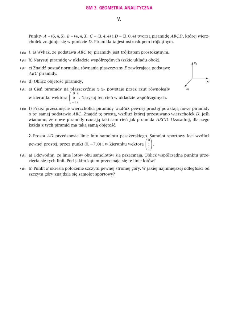 GM 3. GEOMETRIA ANALITYCZNA V. Punkty A = (6, 4, 5), B = (4, 4, 3), C = (3, 4, 4) i D = (3, 0, 4) tworzą piramidę ABCD, której wierzchołek znajduje się w punkcie D. Piramida ta jest ostrosłupem trójkątnym. 4 pkt 1. a) Wykaż, że podstawa ABC tej piramidy jest trójkątem prostokątnym. 4 pkt b) Narysuj piramidę w układzie współrzędnych (szkic układu obok). 5 pkt c) Znajdź postać normalną równania płaszczyzny E zawierającą podstawę ABC piramidy. 4 pkt d) Oblicz objętość piramidy. 3 pkt e) Cień piramidy na płaszczyźnie x1 x2 powstaje przez rzut równoległy 0 w kierunku wektora 0 . Narysuj ten cień w układzie współrzędnych. −1 4 pkt f) Przez przesunięcie wierzchołka piramidy wzdłuż pewnej prostej powstają nowe piramidy o tej samej podstawie ABC. Znajdź tę prostą, wzdłuż której przesuwano wierzchołek D, jeśli wiadomo, że nowe piramidy rzucają taki sam cień jak piramida ABCD. Uzasadnij, dlaczego każda z tych piramid ma taką samą objętość. 2. Prosta AD przedstawia linię lotu samolotu pasażerskiego. sportowy leci wzdłuż Samolot 0 pewnej prostej, przez punkt (0, −7, 0) i w kierunku wektora 1 . 1 9 pkt a) Udowodnij, że linie lotów obu samolotów się przecinają. Oblicz współrzędne punktu przecięcia się tych linii. Pod jakim kątem przecinają się te linie lotów? 7 pkt b) Punkt B określa położenie szczytu pewnej stromej góry. W jakiej najmniejszej odległości od szczytu góry znajdzie się samolot sportowy? VI. Dane są proste: g przechodząca przez punkty A = (0, 3, 0) i B = (7, 4, 5) oraz prosta h 1 7 → h: x = 1 + λ 1 z λ ∈ . 0 5 4 pkt 1. a) Wykaż, że proste g i h leżą na tej samej płaszczyźnie E. 5 pkt b) Znajdź postać normalną równania płaszczyzny E. [możliwy wynik: 2x1 + x2 − 3x3 − 3 = 0] 7 pkt c) C1 i C2 są dwoma punktami prostej h. Trójkąty ABC1 oraz ABC2 są trójkątami prostokątnymi o kątach prostych przy wierzchołkach C1 oraz C2 . Znajdź współrzędne obu punktów: C1 i C2 . (Punkt o współrzędnych będących liczbami całkowitymi to C1 ). [odpowiedź: C1 = (1, 1, 0)] 4 pkt d) Narysuj proste g, h oraz trójkąt ABC1 w układzie współrzędnych. (szkic układu obok) 3 pkt e) Uzasadnij, nie wykonując obliczeń, że punkt N wyznaczony przez wek−−→ −−→ −−→ tor ON = 1 (OA + OB) jest środkiem okręgu opisanego na trójkącie ABC1 . 2 2. Trójkąt ABC1 jest podstawą piramidy będącej ostrosłupem trójkątnym o wierzchołku w punkcie S. M jest środkiem boku AC1 trójkąta. 5 pkt a) O punkcie S wiadomo, że: długość odcinka MS wynosi 4 i odcinek ten jest prostopadły do płaszczyzny x1 x2 , trzecia współrzędna x3 punktu S jest dodatnia. Wyznacz współrzędne punktu S oraz zaznacz punkt M i narysuj piramidę na rysunku z zadania 1d. [odpowiedź: S = (0, 5; 2; 4)] 8 pkt b) Uzasadnij, że trójkąt C1 AS jest symetryczny do siebie względem osi i oblicz miary kątów tego trójkąta. 4 pkt c) Oblicz wysokość piramidy ABC1 S.