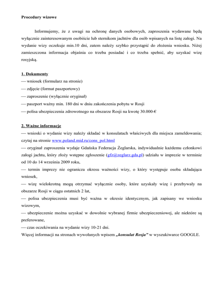 Procedury wizowe Informujemy, że z uwagi na ochronę danych osobowych, zaproszenia wydawane będą wyłącznie zainteresowanym osobiście lub sternikom jachtów dla osób wpisanych na listę załogi. Na wydanie wizy oczekuje min.10 dni, zatem należy szybko przystąpić do złożenia wniosku. Niżej zamieszczona informacja objaśnia co trzeba posiadać i co trzeba spełnić, aby uzyskać wizę rosyjską. 1. Dokumenty wniosek (formularz na stronie) zdjęcie (format paszportowy) zaproszenie (wyłącznie oryginał) paszport ważny min. 180 dni w dniu zakończenia pobytu w Rosji polisa ubezpieczenia zdrowotnego na obszarze Rosji na kwotę 30.000-€ 2. Ważne informacje wnioski o wydanie wizy należy składać w konsulatach właściwych dla miejsca zameldowania; czytaj na stronie www.poland.mid.ru/cons_pol.html oryginał zaproszenia wydaje Gdańska Federacja Żeglarska, indywidualnie każdemu członkowi załogi jachtu, który złoży wstępne zgłoszenie ([email protected]) udziału w imprezie w terminie od 10 do 14 września 2009 roku, termin imprezy nie ogranicza okresu ważności wizy, o który występuje osoba składająca wniosek, wizę wielokrotną mogą otrzymać wyłącznie osoby, które uzyskały wizę i przebywały na obszarze Rosji w ciągu ostatnich 2 lat, polisa ubezpieczenia musi być ważna w okresie identycznym, jak zapisany we wniosku wizowym, ubezpieczenie można uzyskać w dowolnie wybranej firmie ubezpieczeniowej, ale niektóre są preferowane, czas oczekiwania na wydanie wizy 10-21 dni. Więcej informacji na stronach wywołanych wpisem „konsulat Rosja” w wyszukiwarce GOOGLE.