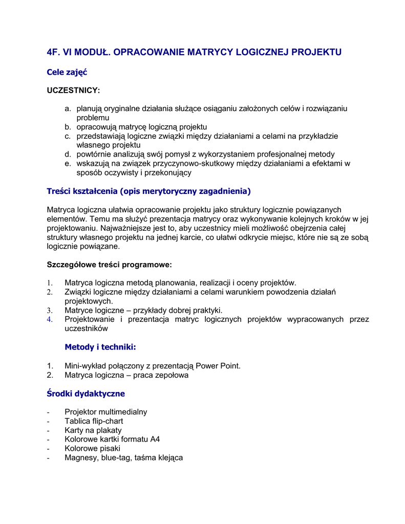 4F. VI MODUŁ. OPRACOWANIE MATRYCY LOGICZNEJ PROJEKTU