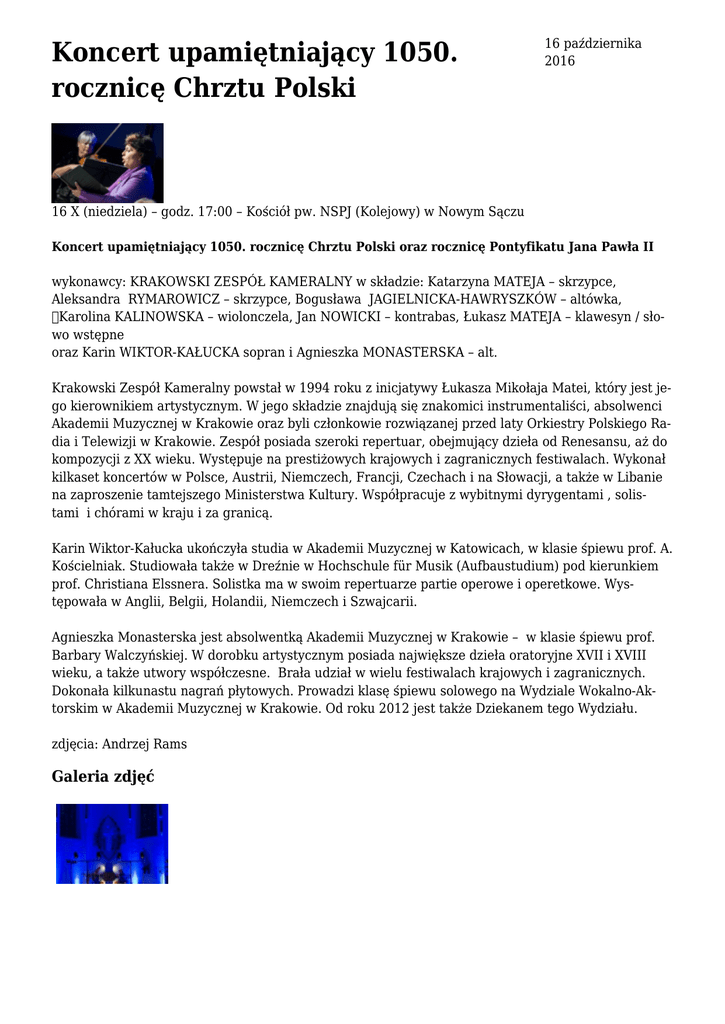 Koncert upamiętniający 1050. rocznicę Chrztu Polski 16 października 2016 16 X (niedziela) – godz. 17:00 – Kościół pw. NSPJ (Kolejowy) w Nowym Sączu Koncert upamiętniający 1050. rocznicę Chrztu Polski oraz rocznicę Pontyfikatu Jana Pawła II wykonawcy: KRAKOWSKI ZESPÓŁ KAMERALNY w składzie: Katarzyna MATEJA – skrzypce, Aleksandra RYMAROWICZ – skrzypce, Bogusława JAGIELNICKA-HAWRYSZKÓW – altówka, Karolina KALINOWSKA – wiolonczela, Jan NOWICKI – kontrabas, Łukasz MATEJA – klawesyn / słowo wstępne oraz Karin WIKTOR-KAŁUCKA sopran i Agnieszka MONASTERSKA – alt. Krakowski Zespół Kameralny powstał w 1994 roku z inicjatywy Łukasza Mikołaja Matei, który jest jego kierownikiem artystycznym. W jego składzie znajdują się znakomici instrumentaliści, absolwenci Akademii Muzycznej w Krakowie oraz byli członkowie rozwiązanej przed laty Orkiestry Polskiego Radia i Telewizji w Krakowie. Zespół posiada szeroki repertuar, obejmujący dzieła od Renesansu, aż do kompozycji z XX wieku. Występuje na prestiżowych krajowych i zagranicznych festiwalach. Wykonał kilkaset koncertów w Polsce, Austrii, Niemczech, Francji, Czechach i na Słowacji, a także w Libanie na zaproszenie tamtejszego Ministerstwa Kultury. Współpracuje z wybitnymi dyrygentami , solistami i chórami w kraju i za granicą. Karin Wiktor-Kałucka ukończyła studia w Akademii Muzycznej w Katowicach, w klasie śpiewu prof. A. Kościelniak. Studiowała także w Dreźnie w Hochschule für Musik (Aufbaustudium) pod kierunkiem prof. Christiana Elssnera. Solistka ma w swoim repertuarze partie operowe i operetkowe. Występowała w Anglii, Belgii, Holandii, Niemczech i Szwajcarii. Agnieszka Monasterska jest absolwentką Akademii Muzycznej w Krakowie – w klasie śpiewu prof. Barbary Walczyńskiej. W dorobku artystycznym posiada największe dzieła oratoryjne XVII i XVIII wieku, a także utwory współczesne. Brała udział w wielu festiwalach krajowych i zagranicznych. Dokonała kilkunastu nagrań płytowych. Prowadzi klasę śpiewu solowego na Wydziale Wokalno-Aktorskim w Akademii Muzycznej w Krakowie. Od roku 2012 jest także Dziekanem tego Wydziału. zdjęcia: Andrzej Rams Galeria zdjęć