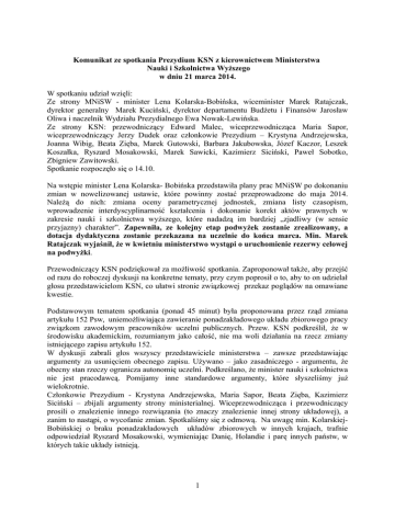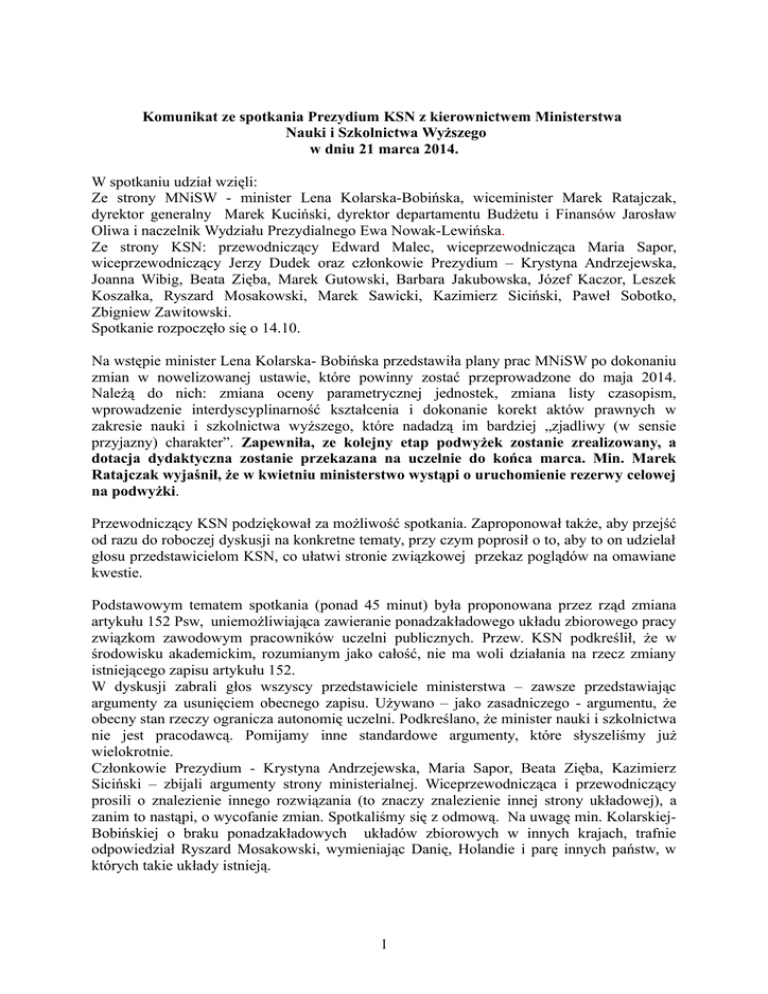 Komunikat ze spotkania Prezydium KSN z kierownictwem Ministerstwa Nauki i Szkolnictwa Wyższego w dniu 21 marca 2014. W spotkaniu udział wzięli: Ze strony MNiSW - minister Lena Kolarska-Bobińska, wiceminister Marek Ratajczak, dyrektor generalny Marek Kuciński, dyrektor departamentu Budżetu i Finansów Jarosław Oliwa i naczelnik Wydziału Prezydialnego Ewa Nowak-Lewińska. Ze strony KSN: przewodniczący Edward Malec, wiceprzewodnicząca Maria Sapor, wiceprzewodniczący Jerzy Dudek oraz członkowie Prezydium – Krystyna Andrzejewska, Joanna Wibig, Beata Zięba, Marek Gutowski, Barbara Jakubowska, Józef Kaczor, Leszek Koszałka, Ryszard Mosakowski, Marek Sawicki, Kazimierz Siciński, Paweł Sobotko, Zbigniew Zawitowski. Spotkanie rozpoczęło się o 14.10. Na wstępie minister Lena Kolarska- Bobińska przedstawiła plany prac MNiSW po dokonaniu zmian w nowelizowanej ustawie, które powinny zostać przeprowadzone do maja 2014. Należą do nich: zmiana oceny parametrycznej jednostek, zmiana listy czasopism, wprowadzenie interdyscyplinarność kształcenia i dokonanie korekt aktów prawnych w zakresie nauki i szkolnictwa wyższego, które nadadzą im bardziej „zjadliwy (w sensie przyjazny) charakter”. Zapewniła, ze kolejny etap podwyżek zostanie zrealizowany, a dotacja dydaktyczna zostanie przekazana na uczelnie do końca marca. Min. Marek Ratajczak wyjaśnił, że w kwietniu ministerstwo wystąpi o uruchomienie rezerwy celowej na podwyżki. Przewodniczący KSN podziękował za możliwość spotkania. Zaproponował także, aby przejść od razu do roboczej dyskusji na konkretne tematy, przy czym poprosił o to, aby to on udzielał głosu przedstawicielom KSN, co ułatwi stronie związkowej przekaz poglądów na omawiane kwestie. Podstawowym tematem spotkania (ponad 45 minut) była proponowana przez rząd zmiana artykułu 152 Psw, uniemożliwiająca zawieranie ponadzakładowego układu zbiorowego pracy związkom zawodowym pracowników uczelni publicznych. Przew. KSN podkreślił, że w środowisku akademickim, rozumianym jako całość, nie ma woli działania na rzecz zmiany istniejącego zapisu artykułu 152. W dyskusji zabrali głos wszyscy przedstawiciele ministerstwa – zawsze przedstawiając argumenty za usunięciem obecnego zapisu. Używano – jako zasadniczego - argumentu, że obecny stan rzeczy ogranicza autonomię uczelni. Podkreślano, że minister nauki i szkolnictwa nie jest pracodawcą. Pomijamy inne standardowe argumenty, które słyszeliśmy już wielokrotnie. Członkowie Prezydium - Krystyna Andrzejewska, Maria Sapor, Beata Zięba, Kazimierz Siciński – zbijali argumenty strony ministerialnej. Wiceprzewodnicząca i przewodniczący prosili o znalezienie innego rozwiązania (to znaczy znalezienie innej strony układowej), a zanim to nastąpi, o wycofanie zmian. Spotkaliśmy się z odmową. Na uwagę min. KolarskiejBobińskiej o braku ponadzakładowych układów zbiorowych w innych krajach, trafnie odpowiedział Ryszard Mosakowski, wymieniając Danię, Holandie i parę innych państw, w których takie układy istnieją. 1 Edward Malec zamknął dyskusję, wyrażając żal z powodu nieuzgodnienia stanowisk w tej sprawie i podkreślając, że będzie to poważny problem dla KSN, którego rozwiązanie będzie wymagało działań natury związkowej. W kolejnym punkcie omawiano sprawę artykułu 125, postulując bądź jego wykreślenie, bądź powrót do zapisu sprzed nowelizacji dokonanej w 2011 roku: „Stosunek pracy z mianowanym nauczycielem akademickim może być rozwiązany również z innych przyczyn, po uzyskaniu zgody organu kolegialnego wskazanego w statucie uczelni.” W dyskusji zabrali głos: Maria Sapor i Marek Gutowski oraz przewodniczący KSN, podkreślając m. in., że w instytutach PAN obowiązuje zapis o sensie takim, jaki był w Psw sprzed 2011. Edward Malec podkreślał, że gdyby obecna postać artykułu 125 obowiązywała w latach 1950., to zwolnienie prof. prof. małżeństwa Ossowskich, Tatarkiewicza, Ingardena przebiegało by zupełnie inaczej. Jak wiadomo, napuszczano na nich bojówki studenckie (z udziałem znanych później prominentów nauk społecznych) i wymuszano w ten sposób przejście do PAN. Ze strony ministerialnej napotkaliśmy na opór, ale minister Kolarska-Bobińska zainteresowała się sprawą w sposób dobrze wróżący rozwiązaniu tej kwestii. Poruszyliśmy (Maria Sapor, Marek Gutowski, Edward Malec) niekorzystny dla pracowników zapis artykułu 124 w kontekście art. 132, ale także art. 125, podkreślając opresyjny charakter ustawy, która zawiera wiele sposobów na rozwiązanie stosunku pracy z nauczycielami akademickimi. Strona ministerialna nie zgodziła się z naszym stanowiskiem. Kolejnym punktem rozmów były podwyżki wynagrodzeń. Istniała zbieżność poglądu obu stron co do zasad podziału środków na podwyżki wynagrodzeń miedzy uczelnie publiczne w 2014 roku. Przewodniczący KSN NSZZ „Solidarność” zaproponował, aby przyjęto rozwiązania zastosowane w roku 2013, a mianowicie: Podwyżka wynagrodzeń przewidziana ustawą budżetową na rok 2013 powinna być rozdzielana przez MNiSW pomiędzy publiczne uczelnie wyższe według następujących zasad: i) kwotowo, z przyjęciem (w przybliżeniu) zasady 3:2:1:1 (np. 3:2:1.25:1.25); ii) wyłącznie dla zatrudnionych w podstawowym miejscu pracy oraz dla pracowników nigdzie nie zatrudnionych w podstawowym miejscu pracy i zatrudnionych na ułamkach etatów. iii) W przypadku pracowników niepełnozatrudnionych, pracujących w różnych miejscach pracy, dotacja powinna być proporcjonalna do sumy poszczególnych ułamków etatów, ale nie może być wyższa niż dotacja dla pracownika zatrudnionego w podstawowym miejscu pracy. Zasady podwyżek w uczelniach powinny być uzgadniane ze strona związkową. Dyrektor departamentu J. Oliwa wyjaśnił, że w roku 2013. podzielono środki miedzy uczelnie według wag w algorytmie części kadrowej - 2.5(prof.):2(dr hab.