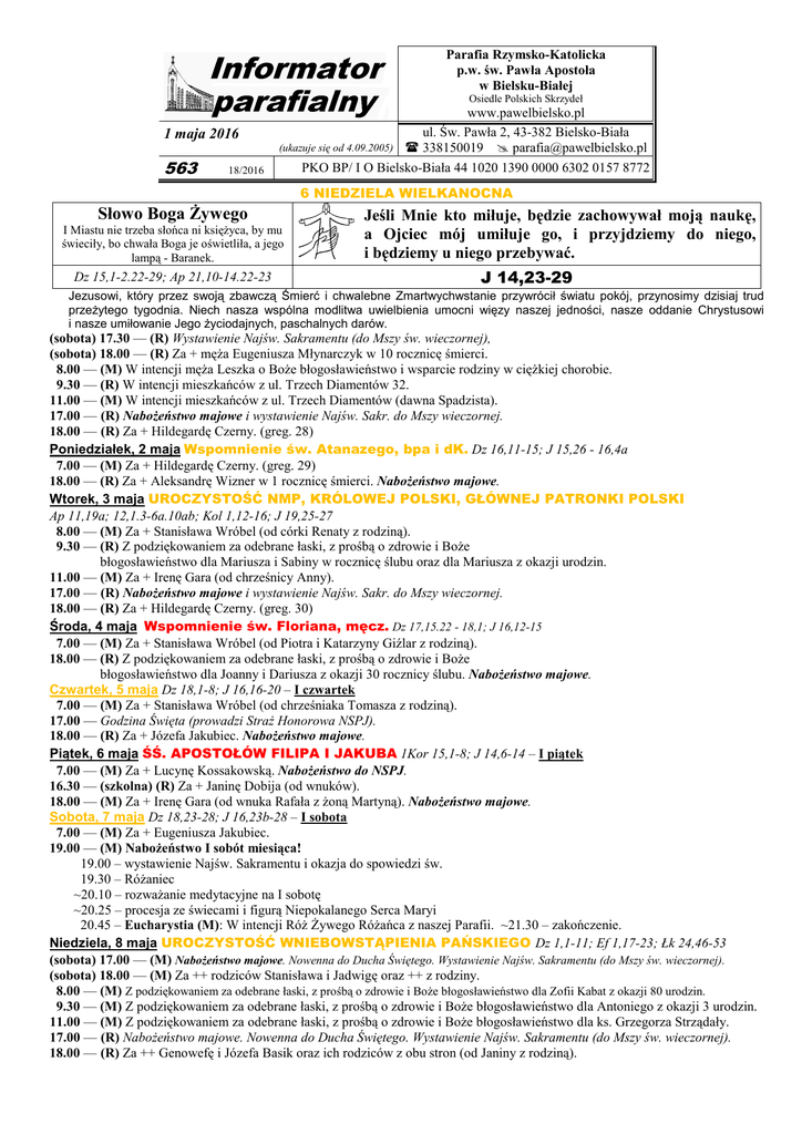 Parafia Rzymsko-Katolicka p.w. św. Pawła Apostoła w Bielsku-Białej Osiedle Polskich Skrzydeł 1 maja 2016 563 18/2016 www.pawelbielsko.pl ul. Św. Pawła 2, 43-382 Bielsko-Biała (ukazuje się od 4.09.2005) 338150019 [email protected] PKO BP/ I O Bielsko-Biała 44 1020 1390 0000 6302 0157 8772 6 NIEDZIELA WIELKANOCNA Słowo Boga Żywego I Miastu nie trzeba słońca ni księżyca, by mu świeciły, bo chwała Boga je oświetliła, a jego lampą - Baranek. Dz 15,1-2.22-29; Ap 21,10-14.22-23 Jeśli Mnie kto miłuje, będzie zachowywał moją naukę, a Ojciec mój umiłuje go, i przyjdziemy do niego, i będziemy u niego przebywać. J 14,23-29 Jezusowi, który przez swoją zbawczą Śmierć i chwalebne Zmartwychwstanie przywrócił światu pokój, przynosimy dzisiaj trud przeżytego tygodnia. Niech nasza wspólna modlitwa uwielbienia umocni więzy naszej jedności, nasze oddanie Chrystusowi i nasze umiłowanie Jego życiodajnych, paschalnych darów. (sobota) 17.30 — (R) Wystawienie Najśw. Sakramentu (do Mszy św. wieczornej), (sobota) 18.00 — (R) Za + męża Eugeniusza Młynarczyk w 10 rocznicę śmierci. 8.00 — (M) W intencji męża Leszka o Boże błogosławieństwo i wsparcie rodziny w ciężkiej chorobie. 9.30 — (R) W intencji mieszkańców z ul. Trzech Diamentów 32. 11.00 — (M) W intencji mieszkańców z ul. Trzech Diamentów (dawna Spadzista). 17.00 — (R) Nabożeństwo majowe i wystawienie Najśw. Sakr. do Mszy wieczornej. 18.00 — (R) Za + Hildegardę Czerny. (greg. 28) Poniedziałek, 2 maja Wspomnienie św. Atanazego, bpa i dK. Dz 16,11-15; J 15,26 - 16,4a 7.00 — (M) Za + Hildegardę Czerny. (greg. 29) 18.00 — (R) Za + Aleksandrę Wizner w 1 rocznicę śmierci. Nabożeństwo majowe. Wtorek, 3 maja UROCZYSTOŚĆ NMP, KRÓLOWEJ POLSKI, GŁÓWNEJ PATRONKI POLSKI Ap 11,19a; 12,1.3-6a.10ab; Kol 1,12-16; J 19,25-27 8.00 — (M) Za + Stanisława Wróbel (od córki Renaty z rodziną). 9.30 — (R) Z podziękowaniem za odebrane łaski, z prośbą o zdrowie i Boże błogosławieństwo dla Mariusza i Sabiny w rocznicę ślubu oraz dla Mariusza z okazji urodzin. 11.00 — (M) Za + Irenę Gara (od chrześnicy Anny). 17.00 — (R) Nabożeństwo majowe i wystawienie Najśw. Sakr. do Mszy wieczornej. 18.00 — (R) Za + Hildegardę Czerny. (greg. 30) Środa, 4 maja Wspomnienie św. Floriana, męcz. Dz 17,15.22 - 18,1; J 16,12-15 7.00 — (M) Za + Stanisława Wróbel (od Piotra i Katarzyny Giźlar z rodziną). 18.00 — (R) Z podziękowaniem za odebrane łaski, z prośbą o zdrowie i Boże błogosławieństwo dla Joanny i Dariusza z okazji 30 rocznicy ślubu. Nabożeństwo majowe. Czwartek, 5 maja Dz 18,1-8; J 16,16-20 – I czwartek 7.00 — (M) Za + Stanisława Wróbel (od chrześniaka Tomasza z rodziną). 17.00 — Godzina Święta (prowadzi Straż Honorowa NSPJ). 18.00 — (R) Za + Józefa Jakubiec. Nabożeństwo majowe. Piątek, 6 maja ŚŚ. APOSTOŁÓW FILIPA I JAKUBA 1Kor 15,1-8; J 14,6-14 – I piątek 7.00 — (M) Za + Lucynę Kossakowską. Nabożeństwo do NSPJ. 16.30 — (szkolna) (R) Za + Janinę Dobija (od wnuków). 18.00 — (M) Za + Irenę Gara (od wnuka Rafała z żoną Martyną). Nabożeństwo majowe. Sobota, 7 maja Dz 18,23-28; J 16,23b-28 – I sobota 7.00 — (M) Za + Eugeniusza Jakubiec. 19.00 — (M) Nabożeństwo I sobót miesiąca! 19.00 – wystawienie Najśw. Sakramentu i okazja do spowiedzi św. 19.30 – Różaniec ~20.10 – rozważanie medytacyjne na I sobotę ~20.25 – procesja ze świecami i figurą Niepokalanego Serca Maryi 20.45 – Eucharystia (M): W intencji Róż Żywego Różańca z naszej Parafii. ~21.30 – zakończenie. Niedziela, 8 maja UROCZYSTOŚĆ WNIEBOWSTĄPIENIA PAŃSKIEGO Dz 1,1-11; Ef 1,17-23; Łk 24,46-53 (sobota) 17.00 — (M) Nabożeństwo majowe. Nowenna do Ducha Świętego. Wystawienie Najśw. Sakramentu (do Mszy św. wieczornej). (sobota) 18.00 — (M) Za ++ rodziców Stanisława i Jadwigę oraz ++ z rodziny. 8.00 — (M) Z podziękowaniem za odebrane łaski, z prośbą o zdrowie i Boże błogosławieństwo dla Zofii Kabat z okazji 80 urodzin. 9.30 — (M) Z podziękowaniem za odebrane łaski, z prośbą o zdrowie i Boże błogosławieństwo dla Antoniego z okazji 3 urodzin. 11.00 — (M) Z podziękowaniem za odebrane łaski, z prośbą o zdrowie i Boże błogosławieństwo dla ks. Grzegorza Strządały. 17.00 — (R) Nabożeństwo majowe. Nowenna do Ducha Świętego. Wystawienie Najśw. Sakramentu (do Mszy św. wieczornej). 18.00 — (R) Za ++ Genowefę i Józefa Basik oraz ich rodziców z obu stron (od Janiny z rodziną). OGŁOSZENIA DUSZPASTERSKIE 1. W tym tygodniu przypadają I czwartek, I piątek i I sobota miesiąca: • w czwartek od godz. 1700 Godzina Święta, którą poprowadzi Straż Honorowa NSPJ; w czasie Mszy św. Komunia pod obiema postaciami; po Mszy wieczornej spotkanie dla wspólnego czytania Pisma Świętego; • w I piątek miesiąca po Mszy św. porannej nabożeństwo do NSPJ; o 1630 Msza św. szkolna a od 1600 okazja do spowiedzi św.; • w sobotę po I piątku odwiedziny chorych z Komunią św. – prosimy o uzgodnienie z Ks. Wikariuszem; • w I sobotę od godz. 1900 nabożeństwo I-wszo sobotnie! 2. Zebranie Parafialnej Rady Duszpasterskiej w przyszłą niedzielę 8 maja o godz. 1500! 3. Odpowiadając na apel Papieża Franciszka dotyczący wsparcia dla ofiar trzęsienia ziemi w Ekwadorze w niedzielę 8 maja zbiórka pieniężna do puszek przy drzwiach kościoła na ten cel. DIAKONIA SPRZĄTANIA Dziękujemy mieszkańcom z ul. Skarżyńskiego za posprzątanie kościoła, wystrój kwiatowy i ofiarę na kościół. Msza św. w ich intencji będzie sprawowana 3.07.br. o godz. 930. W najbliższą sobotę o posługę czystości prosimy mieszkańców z ul. Nasiennej i Spółdzielców. ZAPOWIEDZI PRZEDŚLUBNE (2) DULOK Michał, zam. Czechowice-Dziedzice i OLEKSY Dafne, zam. B.B. MSZA ŚWIĘTA W INTENCJI OJCZYZNY będzie sprawowana w uroczystość Najświętszej Maryi Panny Królowej Polski (wtorek, 3 maja b