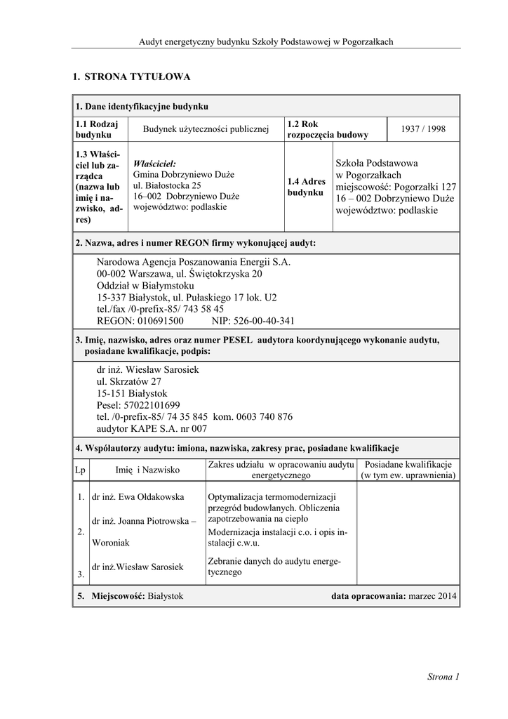 Audyt energetyczny budynku Szkoły Podstawowej w Pogorzałkach 1. STRONA TYTUŁOWA 1. Dane identyfikacyjne budynku 1.1 Rodzaj budynku 1.3 Właściciel lub zarządca (nazwa lub imię i nazwisko, adres) Budynek uŜyteczności publicznej Właściciel: Gmina Dobrzyniewo DuŜe ul. Białostocka 25 16–002 Dobrzyniewo DuŜe województwo: podlaskie 1.2 Rok rozpoczęcia budowy 1.4 Adres budynku 1937 / 1998 Szkoła Podstawowa w Pogorzałkach miejscowość: Pogorzałki 127 16 – 002 Dobrzyniewo DuŜe województwo: podlaskie 2. Nazwa, adres i numer REGON firmy wykonującej audyt: Narodowa Agencja Poszanowania Energii S.A. 00-002 Warszawa, ul. Świętokrzyska 20 Oddział w Białymstoku 15-337 Białystok, ul. Pułaskiego 17 lok. U2 tel./fax /0-prefix-85/ 743 58 45 REGON: 010691500 NIP: 526-00-40-341 3. Imię, nazwisko, adres oraz numer PESEL audytora koordynującego wykonanie audytu, posiadane kwalifikacje, podpis: dr inŜ. Wiesław Sarosiek ul. Skrzatów 27 15-151 Białystok Pesel: 57022101699 tel. /0-prefix-85/ 74 35 845 kom. 0603 740 876 audytor KAPE S.A. nr 007 4. Współautorzy audytu: imiona, nazwiska, zakresy prac, posiadane kwalifikacje Lp Imię i Nazwisko 1. dr inŜ. Ewa Ołdakowska dr inŜ. Joanna Piotrowska – 2. Woroniak 3. dr inŜ.Wiesław Sarosiek 5. Miejscowość: Białystok Zakres udziału w opracowaniu audytu Posiadane kwalifikacje energetycznego (w tym ew. uprawnienia) Optymalizacja termomodernizacji przegród budowlanych. Obliczenia zapotrzebowania na ciepło Modernizacja instalacji c.o. i opis instalacji c.w.u. Zebranie danych do audytu energetycznego data opracowania: marzec 2014 Strona 1 Audyt energetyczny budynku Szkoły Podstawowej w Pogorzałkach 6. Spis treści 1. Strona tytułowa......................................................................................................................... 1 2. Karta audytu energetycznego budynku.................................................................................. 3 3. Dokumenty i dane źródłowe wykorzystane przy opracowaniu audytu oraz wytyczne i uwagi inwestora ....................................................................................................................... 5 4. Inwentaryzacja techniczno – budowlana budynku ............................................................... 5 4.1. Dane ogólne o budynku ............................................................................................ 5 4.2. Uproszczona dokumentacja techniczna .................................................................... 6 4.3. Opis techniczny podstawowych elementów ............................................................. 7 4.4. Charakterystyka energetyczna .................................................................................. 7 4.5. Charakterystyka systemu grzewczego ...................................................................... 8 4.6. Charakterystyka instalacji c.w.u. .............................................................................. 9 4.7. Charakterystyka systemu wentylacji ...................................................................... 10 4.8. Charakterystyka źródła ciepła w budynku.............................................................. 10 5. Ocena aktualnego stanu technicznego budynku .................................................................. 10 5.1. Przegrody zewnętrzne............................................................................................. 10 5.2. System grzewczy .................................................................................................... 10 6. Wykaz usprawnień i przedsięwzięć termomodernizacyjnych wybranych na podstawie oceny stanu technicznego ...................................................................................................... 12 7. Określenie optymalnego wariantu przedsięwzięcia Termomodernizacyjnego ................. 12 7.1. Wskazanie usprawnień termomodernizacyjnych dotyczących zmniejszenia zapotrzebowania na ciepło i moc cieplną ............................................................... 12 7.2. Wybór optymalnych usprawnień dotyczących zmniejszenia zapotrzebowania na ciepło....................................................................................................................... 12 7.2.1. Określenie optymalnego oporu cieplnego dodatkowej warstwy izolacji termicznej w przegrodach zewnętrznych ..................................................................................... 13 7.2.2. Zestawienie optymalnych usprawnień według rosnącej wartości SPBT............... 14 7.3. Wybór optymalnego wariantu usprawnień termomodernizacyjnych poprawiających sprawność systemu grzewczego ............................................................................. 14 7.3.1. Zestawienie usprawnień systemu grzewczego, ich kosztów i efektów.................. 14 7.3.2. Określenie optymalnego wariantu przedsięwzięcia termomodernizacyjnego poprawiającego sprawność cieplną systemu ogrzewania ....................................... 15 7.3.3. Zestawienie usprawnień składających się na optymalny wariant przedsięwzięcia termomodernizacyjnego poprawiającego sprawność systemu ogrzewania ............ 16 7.3. Wybór optymalnego wariantu przedsięwzięcia termomodernizacyjnego .............. 17 7.3.1. Określenie wariantów przedsięwzięć termomodernizacyjnych............................. 17 7.3.2. Obliczenie zdyskontowanej wartości netto NPV wariantów przedsięwzięć termomodernizacyjnych.......................................................................................... 17 7.3.3. Ocena wariantów przedsięwzięć termomodernizacyjnych pod względem spełnienia wymagań „Ustawy o wspieraniu termomodernizacji i remontów” ........................ 19 7.3.4. Wskazanie optymalnego wariantu przedsięwzięcia termomodernizacyjnego ....... 20 8. Opis techniczny optymalnego wariantu przedsięwzięcia termomodernizacyjnego przewidzian