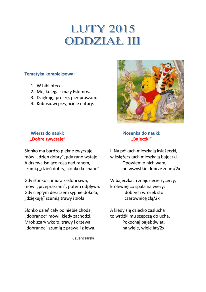 Tematyka kompleksowa: 1. 2. 3. 4. W bibliotece. Mój kolega - mały Eskimos. Dziękuję, proszę, przepraszam. Kubusiowi przyjaciele natury. Wiersz do nauki: „Dobre zwyczaje” Piosenka do nauki: „Bajeczki” Słonko ma bardzo piękne zwyczaje, mówi „dzień dobry”, gdy rano wstaje. A drzewa lśniące rosą nad ranem, szumią „dzień dobry, słonko kochane”. I. Na półkach mieszkają książeczki, w książeczkach mieszkają bajeczki. Opowiem o nich wam, bo wszystkie dobrze znam/2x Gdy słonko chmura zasłoni siwa, mówi „przepraszam”, potem odpływa. Gdy ciepłym deszczem sypnie dokoła, „dziękuję” szumią trawy i zioła. W bajeczkach znajdziecie rycerzy, królewnę co spała na wieży. I dobrych wróżek sto i czarownicę złą/2x Słonko dzień cały po niebie chodzi, „dobranoc” mówi, kiedy zachodzi. Mrok szary wkoło, trawy i drzewa „dobranoc” szumią z prawa i z lewa. A kiedy się dziecko zasłucha to wróżki mu szepczą do ucha. Pokochaj bajek świat, na wiele, wiele lat/2x Cz.Janczarski