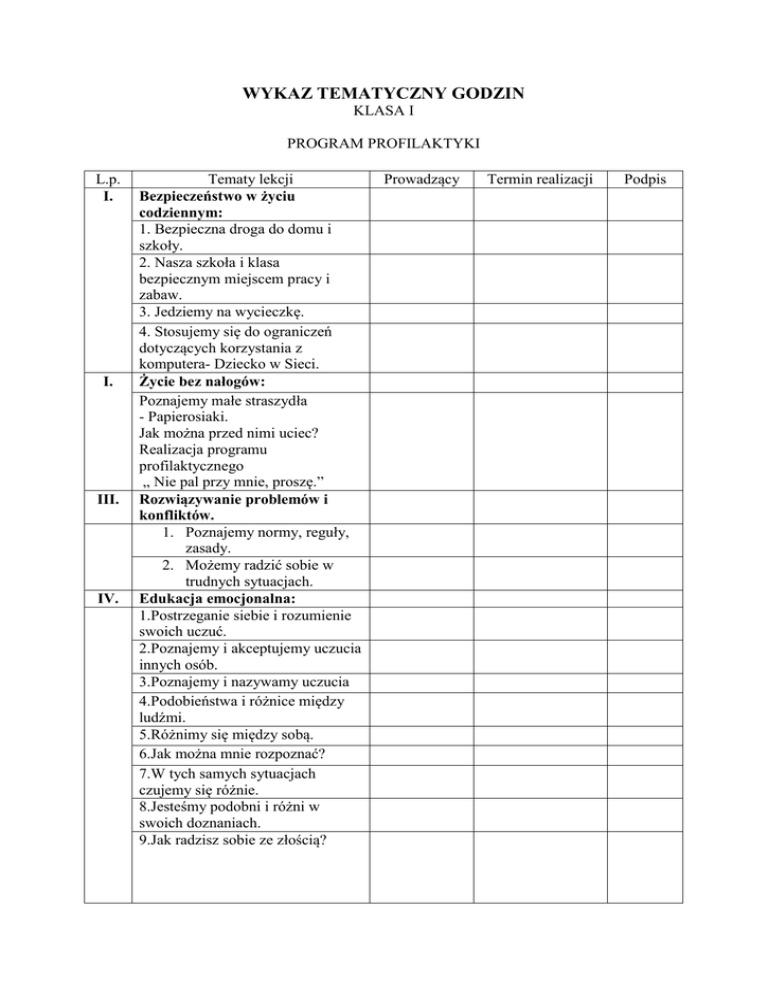 WYKAZ TEMATYCZNY GODZIN KLASA I PROGRAM PROFILAKTYKI L.p. I. I. III. IV. Tematy lekcji Bezpieczeństwo w życiu codziennym: 1. Bezpieczna droga do domu i szkoły. 2. Nasza szkoła i klasa bezpiecznym miejscem pracy i zabaw. 3. Jedziemy na wycieczkę. 4. Stosujemy się do ograniczeń dotyczących korzystania z komputera- Dziecko w Sieci. Życie bez nałogów: Poznajemy małe straszydła - Papierosiaki. Jak można przed nimi uciec? Realizacja programu profilaktycznego „ Nie pal przy mnie, proszę.” Rozwiązywanie problemów i konfliktów. 1. Poznajemy normy, reguły, zasady. 2. Możemy radzić sobie w trudnych sytuacjach. Edukacja emocjonalna: 1.Postrzeganie siebie i rozumienie swoich uczuć. 2.Poznajemy i akceptujemy uczucia innych osób. 3.Poznajemy i nazywamy uczucia 4.Podobieństwa i różnice między ludźmi. 5.Różnimy się między sobą. 6.Jak można mnie rozpoznać? 7.W tych samych sytuacjach czujemy się różnie. 8.Jesteśmy podobni i różni w swoich doznaniach. 9.Jak radzisz sobie ze złością? Prowadzący Termin realizacji Podpis V. Dbamy o zdrowie: 1.Odżywiamy się zdrowo. 2.Higiena na co dzień. 3.Ruch to zdrowie. WYKAZ TEMATYCZNY GODZIN KLASA II PROGRAM PROFILAKTYKI L.p. I. II. III. IV. Tematy lekcji Bezpieczeństwo w życiu codziennym: 1. Kontakty z nieznajomymi. 2. Zagrożenia wynikające z korzystania z komputera, Internetu i multimediów. 3. Jak bezpiecznie posługiwać się niektórymi przyrządami i urządzeniami? 4.Wybuchł pożar. Co robić? Życie bez nałogów: 1.Co myślę o dymku papierosowym? Realizacja programu profilaktycznego „ Nie pal przy mnie, proszę.” 2.Co to jest alkohol? Co to są narkotyki? Realizacja programu profilaktycznego „ Cukierki.” Edukacja emocjonalna: 1.Jesteśmy podobni. 2.To właśnie JA. 3.”Książeczka o mnie.” 4.Jesteśmy niepowtarzalni. 5.Omówienie „Książeczki o mnie.” 6.Moje sukcesy. 7.Kiedy czuję się ważny. 8.Przeżywamy różne uczucia i uczymy się, jak sobie z nimi radzić. 9.Mój dobry i zły dzień. 10.Poznajemy sytuacje sprzyjające nawiązywaniu przyjaźni. Rozwiązywanie problemów i konfliktów 1. Uczę się mówić nie. 2. Istnieje wiele sposobów rozwiązywania problemów. Prowadzący Termin realizacji Podpis V. Dbamy o zdrowie: 1.Jak zachować się w sytuacjach, w których czuję się zagrożony? 2.Zasady bezpiecznego zachowania się w szkole i poza nią. 3.Planujemy swój dzień pamiętając o zdrowiu. WYKAZ TEMATYCZNY GODZIN KLASA III PROGRAM PROFILAKTYKI L.p. I. II. III. IV. Tematy lekcji Bezpieczeństwo w życiu codziennym: 1.Bezpieczeństwo ruchu drogowego. 2.Planujemy swój dzień. 3. Pierwsza pomoc. 4. Substancje szkodliwe. 5. Zagrożenia wynikające z korzystania z komputera, Internetu i multimediów. Życie bez nałogów: 1.Co to jest nałóg? 2.Co można stracić, gdy będzie się paliło papierosy. Realizacja programu profilaktycznego „ Nie pal przy mnie, proszę.” 3. Realizacja programu profilaktycznego „ Cukierki.” Dziękuję od obcych nie biorę. Edukacja emocjonalna: 1.Co mi się zdarzyło miłego? 2.Są rzeczy, które robię bardzo dobrze. 3.Co się dzieje ze mną, gdy przeżywam różne uczucia? 4.Omówienie „Książeczki uczuć.” 5.TAK, potrafię… 6. Mogę wpływać na swoje samopoczucie. 7.Czasami jesteśmy zazdrośni. 8. Czy umiem podejmować decyzje? 9.Szanuję każdego człowieka. 10.Jak prawidłowo komunikować się z ludźmi? Rozwiązywanie problemów i konfliktów. 1.Czy umiem podejmować decyzję? Prowadzący Termin realizacji Podpis V. 2.Jak okazywać sympatię? „Nie czyń drugiemu, co tobie nie miłe.” Dbamy o zdrowie 1.Jak odpoczywać w czasie pracy? 2.Dbaj o zdrowie – walcz z hałasem. 3.Planujemy swój dzień.