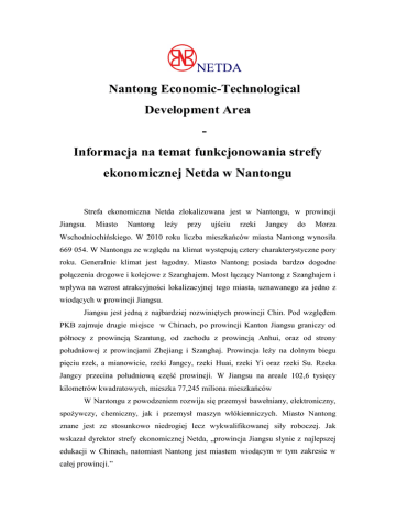 NETDA Nantong Economic-Technological Development Area Informacja na temat funkcjonowania strefy ekonomicznej Netda w Nantongu Strefa ekonomiczna Netda zlokalizowana jest w Nantongu, w prowincji Jiangsu. Miasto Nantong leży przy ujściu rzeki Jangcy do Morza Wschodniochińskiego. W 2010 roku liczba mieszkańców miasta Nantong wynosiła 669 054. W Nantongu ze względu na klimat występują cztery charakterystyczne pory roku. Generalnie klimat jest łagodny. Miasto Nantong posiada bardzo dogodne połączenia drogowe i kolejowe z Szanghajem. Most łączący Nantong z Szanghajem i wpływa na wzrost atrakcyjności lokalizacyjnej tego miasta, uznawanego za jedno z wiodących w prowincji Jiangsu. Jiangsu jest jedną z najbardziej rozwiniętych prowincji Chin. Pod względem PKB zajmuje drugie miejsce w Chinach, po prowincji Kanton Jiangsu graniczy od północy z prowincją Szantung, od zachodu z prowincją Anhui, oraz od strony południowej z prowincjami Zhejiang i Szanghaj. Prowincja leży na dolnym biegu pięciu rzek, a mianowicie, rzeki Jangcy, rzeki Huai, rzeki Yi oraz rzeki Su. Rzeka Jangcy przecina południową część prowincji. W Jiangsu na areale 102,6 tysięcy kilometrów kwadratowych, mieszka 77,245 miliona mieszkańców W Nantongu z powodzeniem rozwija się przemysł bawełniany, elektroniczny, spożywczy, chemiczny, jak i przemysł maszyn włókienniczych. Miasto Nantong znane jest ze stosunkowo niedrogiej lecz wykwalifikowanej siły roboczej. Jak wskazał dyrektor strefy ekonomicznej Netda, „prowincja Jiangsu słynie z najlepszej edukacji w Chinach, natomiast Nantong jest miastem wiodącym w tym zakresie w całej prowincji.” W Nantongu, jak i w szczególności w strefie Netda, z powodzeniem rozwijany jest, między innymi, przemysł stoczniowy, inżynieria oceaniczna, produkcja sprzętu morskiego, nowoczesna energetyka, nowe materiały, produkty zdrowotne, medycyna, farmacja czy chemia. W strefie działalność gospodarczą prowadzi wiele znanych międzynarodowych przedsiębiorstw, jak np. GE Plastics, Ticona, Celanese, Cargill, Sandia Polymers , Toray Industries, Toray Polytech, SPC , Syngenta, Reilly Industries, Air Liquide, Pollrich, UGI-ETG, Toshiba, Polyplastics, Kureha Chemical, Teijin Limited, Dainippon Ink, Mitsubishi Rayon, Mitsubishi Gas Chemical, Oji Paper, Taiwan Synthetic Rubber Corp, Formosa Plastics, Arcelor-Kiswire, Novast Lab, Bio Engineering, Dongyang. W strefie tej funkcjonuje także polska firma Selena. Strefa Ekonomiczna NETDA jest jedną z pierwszych, spośród 14 rządowych stref przemysłowych, które powstały w Chinach. Oferuje ona firmom wchodzącym na rynek chiński i pragnącym zlokalizować swoje inwestycje w Nantongu dostęp do kompletnej infrastruktury i szeregu udogodnień dla rozpoczęcia działalności biznesowej. Preferowanymi inwestycjami są projekty średnio- i długookresowe. Stefę NETDA charakteryzują względnie niskie koszty komparatywne działalności. Nantong posiada tytuł „the Best Manufacturing Site” ze wzglądu na dostęp do surowców naturalnych, bardzo dobrą infrastrukturę przemysłową i usługi logistyczne. Zaletą Nantongu jest dobre zaplecze edukacyjne. Liczący 7,66 mln mieszkańców Nantong dostarcza na lokalny rynek 90% pracowników, dobrze wykształconych, pracowitych, których charakteryzuje niska mobilność, lojalność, skłonność do ciężkiej, i efektywnej pracy, a także umiejętność kooperacji. Oprócz szkół średnich i uniwersytetów, w regionie dostępne są centra kształcenia ustawicznego i doszkalania dla profesjonalistów, pragnących podnieść swoje umiejętności. Dominującymi specjalizacjami są kierunki chemiczno-farmaceutyczne, tekstylne, logistyczno-transportowe i handlowe. Strefa NETDA oferuję dostęp do stabilnego rynku pracowników. Umożliwia firmom wynajem/dzierżawę w pełni wyposażonych mieszkań i akademików spośród specjalnie wyznaczonych budynków. Przedstawiciele strefy w materiałach informacyjnych przekonują, iż Nantong jako miejsce lokalizacji inwestycji na bardzo wiele zalet. Pierwszą z nich są niskie koszty pracy. Średnie wynagrodzenie to 2/3 stawki w stosunku do południowych miast prowincji Jiangsu i ½ w stosunku do Szanghaju. Liczba mieszkańców w wieku produkcyjnym wynosi 2,94 mln. Są to osoby wysoko zmotywowane. Corocznie 25 tys. maturzystów wstępuje na najlepsze chińskie uniwersytety, a znaczący odsetek absolwentów wraca później by zasilić rynek pracy w Nantongu. Ze względu na lokalny charakter pochodzenia pracowników współczynniki mobilności i fluktuacji są bardzo niskie. Środowisko w Nantongu jest bardzo przyjazne dla mieszkańców. Region oferuje dostęp do 275 szpitali, jak i sieci międzynarodowych supermarketów. Region wolny jest od katastrof naturalnych takich jak powodzie, trzęsienia ziemi, susze. Przeważa łagodny klimat. Firmy inwestujące ponad 10 mln USD w strefie mogą liczyć na wsparcie i możliwości skorzystania z systemu zachęt od lokalnego rządu. Inwestorzy mogą otrzymać około 7 mln RMB subsydiów i ziemię w niższej cenie, a także preferencje podatkowe. Strefa NETDA jest świetnie skomunikowana siecią dróg ekspresowych iautostrad. Port w Nantong należy do Shanghai Shipping Center i jest jednym z 10 największych portów w Chinach, dobrze połączonym siecią kanałów, z rzeką Jangcy i morzem. Krajowe lotnisko Nantong Airport położone jest 16 km od strefy i oferuje przewóz osób i towarów. W odległości 85km i 125km położone są lotniska w Szanghaju. Miasto jest także bardzo dobrze skomunikowane gęstą siecią kolejową. NETDA oferuje dostęp do dwóch stacji generujących parę pod ciśnieniem, darmowe przyłącze do systemu kanalizacji, audytowany system gospodarki odpadami, dostęp do gazu przemysłowego, międzynarodowe przyłącza teleinformatyczne, w tym system telewizji satelitarnej. Strefa Ekonomiczna NETDA szczyci się faktem, iż dysponuje nadwyżką energii elektrycznej pochodzące