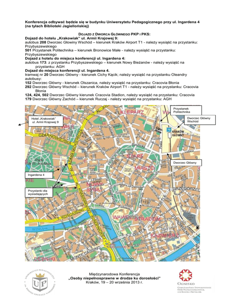 Konferencja odbywać będzie się w budynku Uniwersytetu Pedagogicznego przy ul. Ingardena 4 (na tyłach Biblioteki Jagiellońskiej) DOJAZD Z DWORCA GŁÓWNEGO PKP I PKS: Dojazd do hotelu „Krakowiak” ul. Armii Krajowej 9: autobus 208 Dworzec Głowiny Wschód – kierunek Kraków Airport T1 - należy wysiąść na przystanku: Przybyszewskiego 501 Przystanek Politechnika – kierunek Bronowice Małe - należy wysiąść na przystanku: Przybyszewskiego Dojazd z hotelu do miejsca konferencji ul. Ingardena 4: autobus 173: z przystanku Przybyszewskiego – kierunek Nowy Bieżanów - należy wysiąść na przystanku: AGH Dojazd do miejsca konferencji ul. Ingardena 4. tramwaj nr 20 Dworzec Główny - kierunek Cichy Kącik; należy wysiąść na przystanku Oleandry autobusy: 152 Dworzec Główny - kierunek Olszanica, należy wysiąść na przystanku: Cracovia Błonia 292 Dworzec Główny Wschód – kierunek Kraków Airport T1 - należy wysiąść na przystanku: Cracovia Błonia 124, 424, 502 Dworzec Główny kierunek Cracovia Stadion, należy wysiąść na przystanku: Cracovia 179 Dworzec Główny Zachód – kierunek Ruczaj - należy wysiąść na przystanku: AGH Przystanek Politechnika Dworzec Główny Wschód Hotel „Krakowiak” ul. Armii Krajowej 9 Dworzec Główny Ingardena 4 Przystanki dla wysiadających Międzynarodowa Konferencja „Osoby niepełnosprawne w drodze ku dorosłości” Kraków, 19 – 20 września 2013 r.