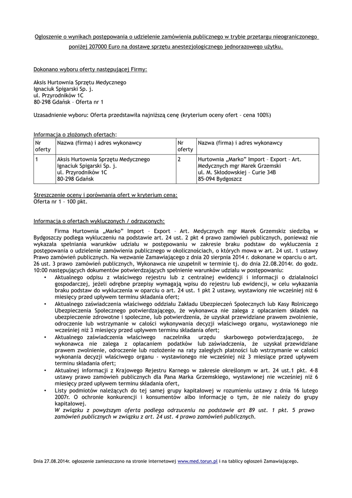 Ogłoszenie o wynikach postępowania o udzielenie zamówienia publicznego w trybie przetargu nieograniczonego poniżej 207000 Euro na dostawę sprzętu anestezjologicznego jednorazowego użytku. Dokonano wyboru oferty następującej Firmy: Aksis Hurtownia Sprzętu Medycznego Ignaciuk Spigarski Sp. j. ul. Przyrodników 1C 80-298 Gdańsk – Oferta nr 1 Uzasadnienie wyboru: Oferta przedstawiła najniższą cenę (kryterium oceny ofert – cena 100%) Informacja o złożonych ofertach: Nr Nazwa (firma) i adres wykonawcy oferty Nr Nazwa (firma) i adres wykonawcy oferty 1 2 Aksis Hurtownia Sprzętu Medycznego Ignaciuk Spigarski Sp. j. ul. Przyrodników 1C 80-298 Gdańsk Hurtownia „Marko” Import – Export – Art. Medycznych mgr Marek Grzemski ul. M. Skłodowskiej – Curie 34B 85-094 Bydgoszcz Streszczenie oceny i porównania ofert w kryterium cena: Oferta nr 1 – 100 pkt. Informacja o ofertach wykluczonych / odrzuconych: Firma Hurtownia „Marko” Import – Export – Art. Medycznych mgr Marek Grzemskiz siedzibą w Bydgoszczy podlega wykluczeniu na podstawie art. 24 ust. 2 pkt 4 prawo zamówień publicznych, ponieważ nie wykazała spełniania warunków udziału w postępowaniu w zakresie braku podstaw do wykluczenia z postępowania o udzielenie zamówienia publicznego w okolicznościach, o których mowa w art. 24 ust. 1 ustawy Prawo zamówień publicznych. Na wezwanie Zamawiającego z dnia 20 sierpnia 2014 r. dokonane w oparciu o art. 26 ust. 3 prawo zamówień publicznych, Wykonawca nie uzupełnił w terminie tj. do dnia 22.08.2014r. do godz. 10:00 następujących dokumentów potwierdzających spełnienie warunków udziału w postępowaniu: • Aktualnego odpisu z właściwego rejestru lub z centralnej ewidencji i informacji o działalności gospodarczej, jeżeli odrębne przepisy wymagają wpisu do rejestru lub ewidencji, w celu wykazania braku podstaw do wykluczenia w oparciu o art. 24 ust. 1 pkt 2 ustawy, wystawiony nie wcześniej niż 6 miesięcy przed upływem terminu składania ofert; • Aktualnego zaświadczenia właściwego oddziału Zakładu Ubezpieczeń Społecznych lub Kasy Rolniczego Ubezpieczenia Społecznego potwierdzającego, że wykonawca nie zalega z opłacaniem składek na ubezpieczenie zdrowotne i społeczne, lub potwierdzenia, że uzyskał przewidziane prawem zwolnienie, odroczenie lub wstrzymanie w całości wykonywania decyzji właściwego organu, wystawionego nie wcześniej niż 3 miesięcy przed upływem terminu składania ofert; • Aktualnego zaświadczenia właściwego naczelnika urzędu skarbowego potwierdzającego, że wykonawca nie zalega z opłacaniem podatków lub zaświadczenia, że uzyskał przewidziane prawem zwolnienie, odroczenie lub rozłożenie na raty zaległych płatności lub wstrzymanie w całości wykonania decyzji właściwego organu - wystawionego nie wcześniej niż 3 miesiące przed upływem terminu składania ofert; • Aktualnej informacji z Krajowego Rejestru Karnego w zakresie określonym w art. 24 ust.1 pkt. 4-8 ustawy prawo zamówień publicznych dla Pana Marka Grzemskiego, wystawionej nie wcześniej niż 6 miesięcy przed upływem terminu składania ofert, • Listy podmiotów należących do tej samej grupy kapitałowej w rozumieniu ustawy z dnia 16 lutego 2007r. O ochronie konkurencji i konsumentów albo informację o tym, że nie należy do grupy kapitałowej. W związku z powyższym oferta podlega odrzuceniu na podstawie art 89 ust. 1 pkt. 5 prawo zamówień publicznych w związku z art. 24 ust. 4 prawo zamówień publicznych. Dnia 27.08.2014r. ogłoszenie zamieszczono na stronie internetowej www.med.torun.pl i na tablicy ogłoszeń Zamawiającego.